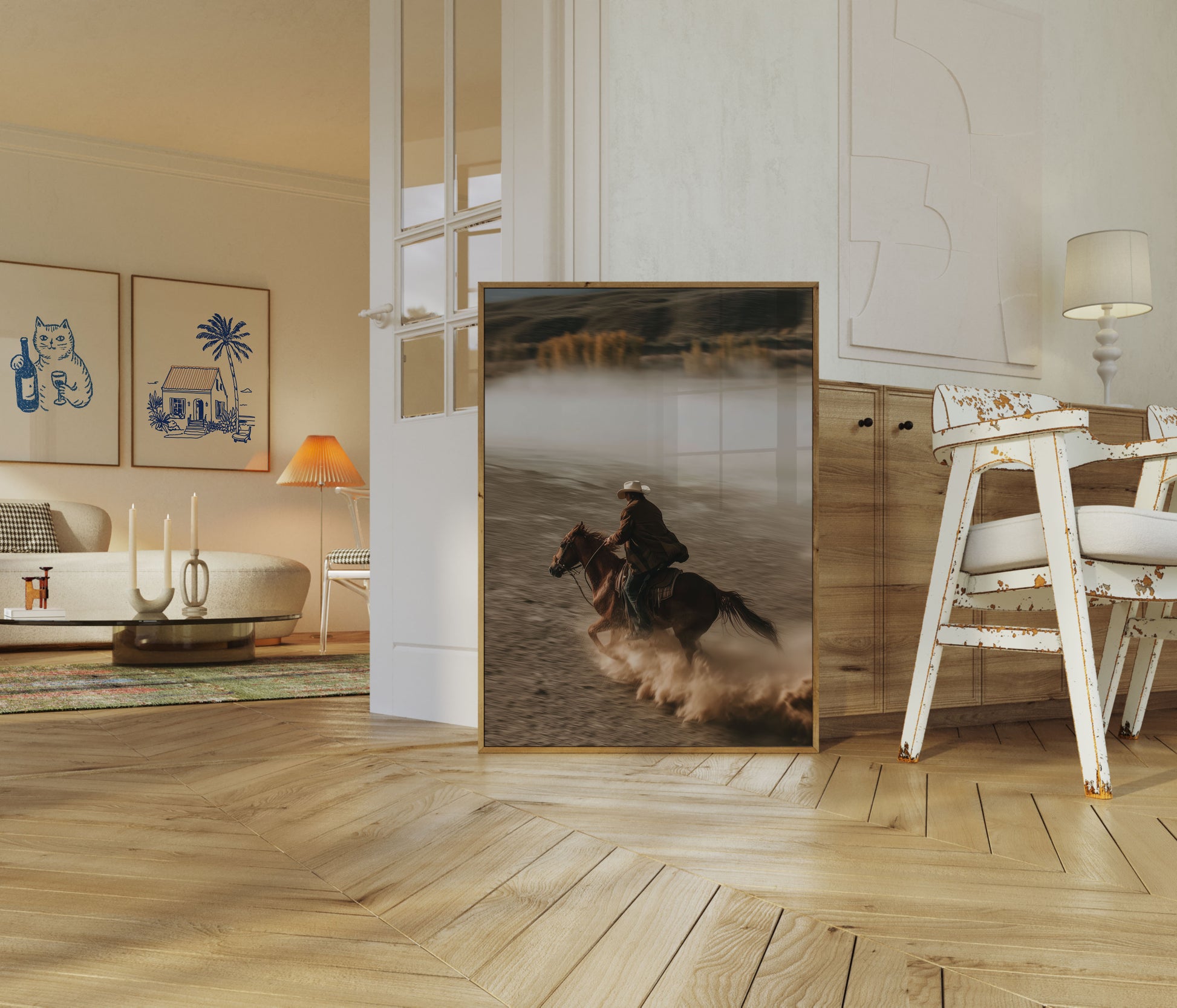 Questa straordinaria opera d'arte western cattura l'energia grezza e lo spirito della frontiera americana. Un cowboy abile in un classico cappello Stetson bianco galoppa a tutta velocità attraverso un terreno polveroso, creando spettacolari nuvole di polvere che turbinano intorno al cavallo e al cavaliere. I toni caldi dorati e terrosi combinati con l'effetto motion blur creano un'atmosfera intensa e dinamica che porta il selvaggio West in vita—perfetto per chi ama la cultura cowboy autentica e scene d'azione drammatiche.