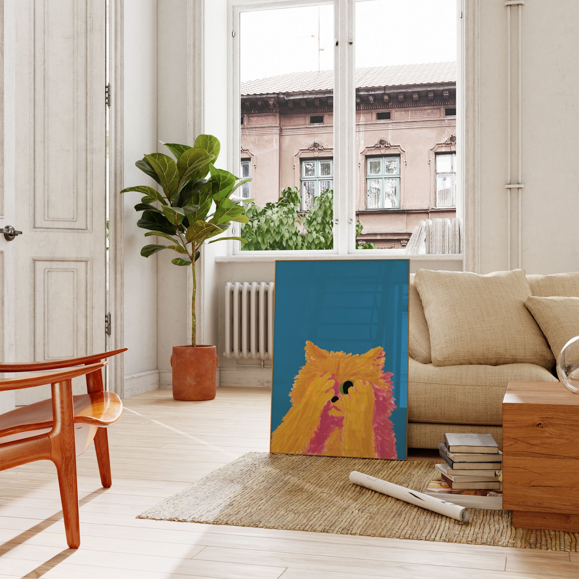 Questo poster vivace cattura un ritratto astratto e giocoso di un cane peloso in splendenti tonalità di arancione e giallo su uno sfondo blu deciso. I tratti pennello testurizzati creano una rappresentazione bizzarra e dinamica di un compagno peloso, con spruzzi di rosa che aggiungono profondità e carattere all'opera.