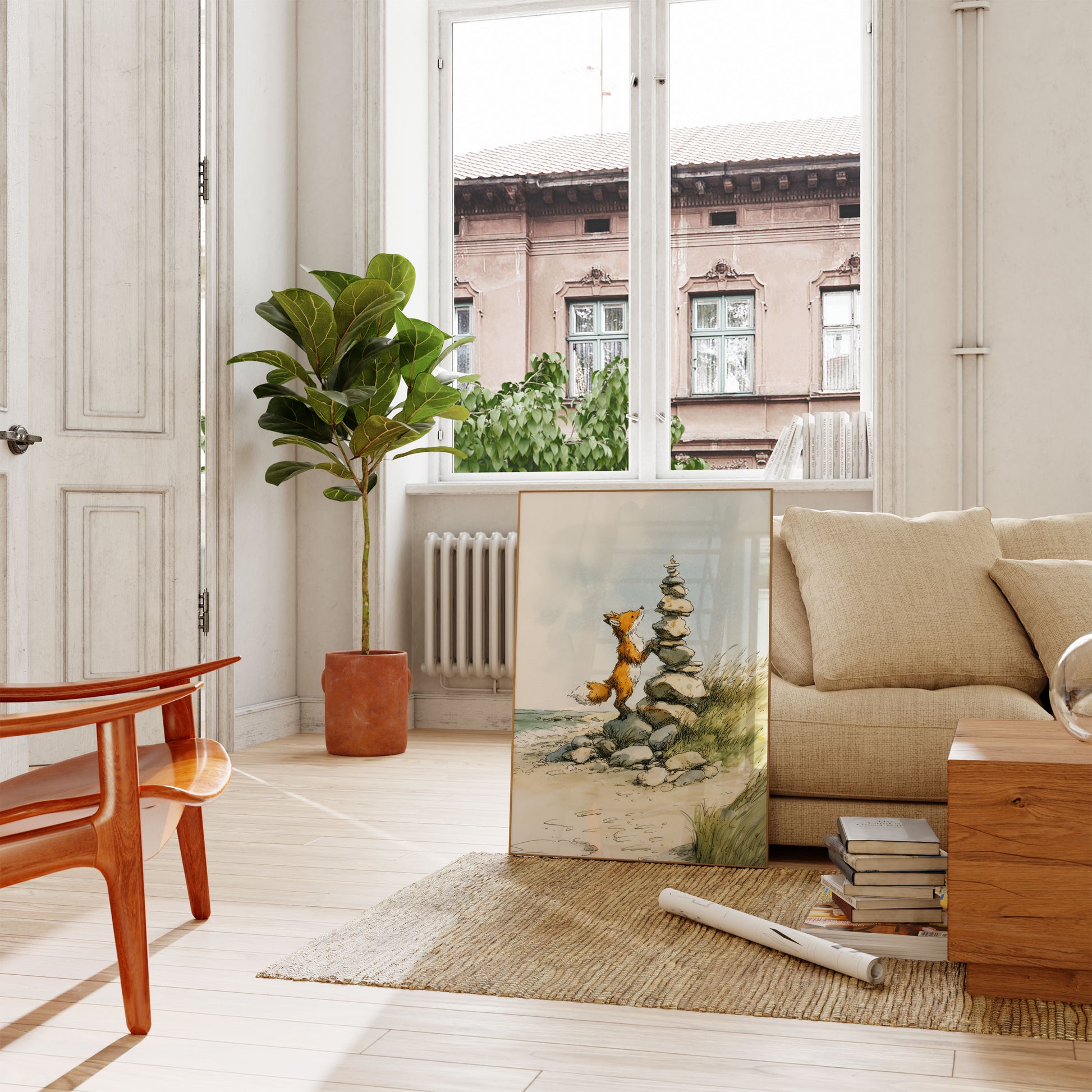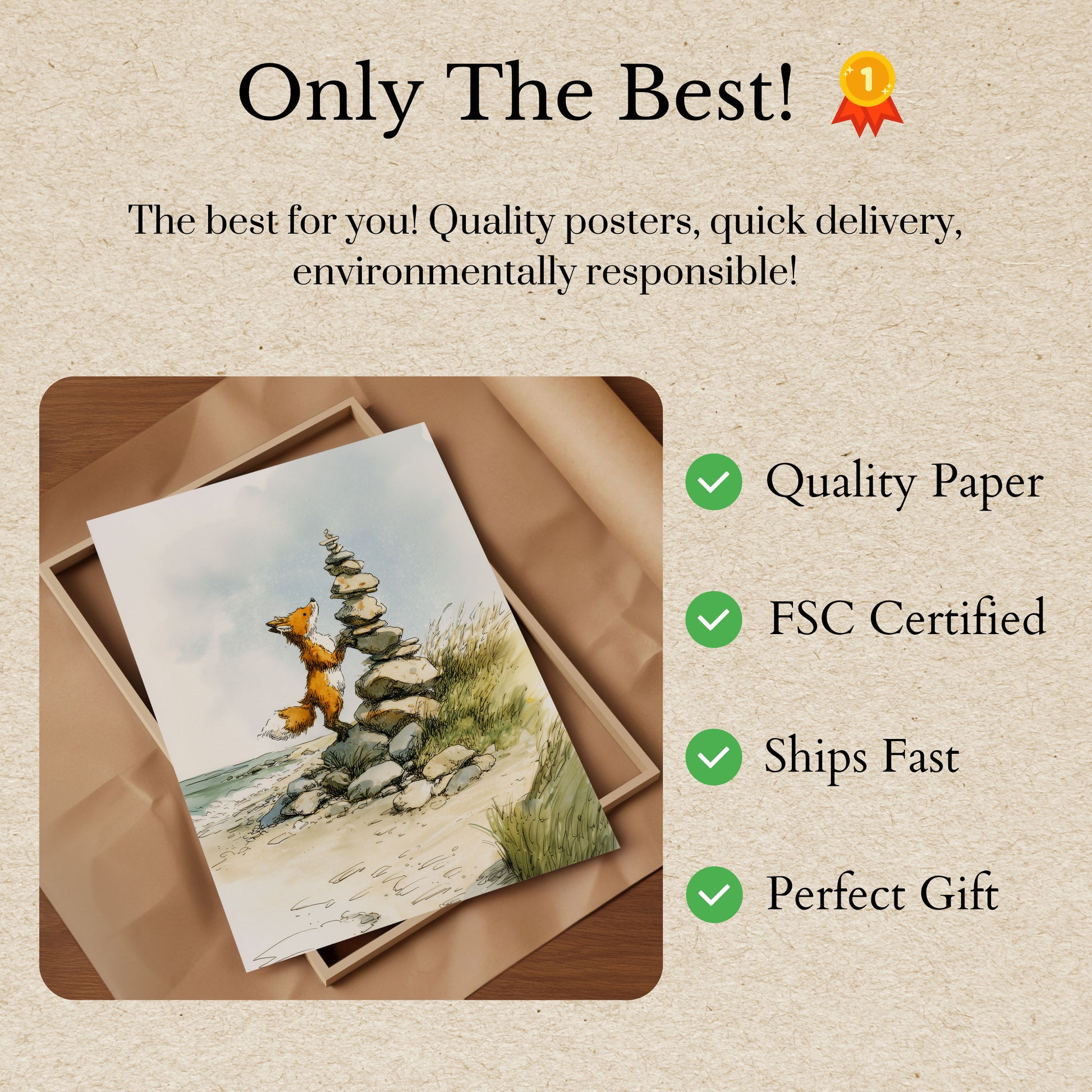 Questa affascinante illustrazione cattura una volpe curiosa in piedi sulle zampe posteriori, che impila con cura pietre lisce in una deliziosa torre accanto al mare. La calda pelliccia arancione e bianca della volpe contrasta splendidamente contro il cielo blu soft e nebbioso e il tranquillo paesaggio costiero. Con la sua delicata tavolozza ad acquerello, il lavoro dettagliato a penna e l'atmosfera tranquilla della spiaggia completata da erbe scosse dal vento, quest'opera d'arte evoca un senso di meraviglia, pazienza e gioia infantile. È il pezzo perfetto per ispirare l'immaginazione e portare un tocco della magia silenziosa della natura in qualsiasi spazio.
