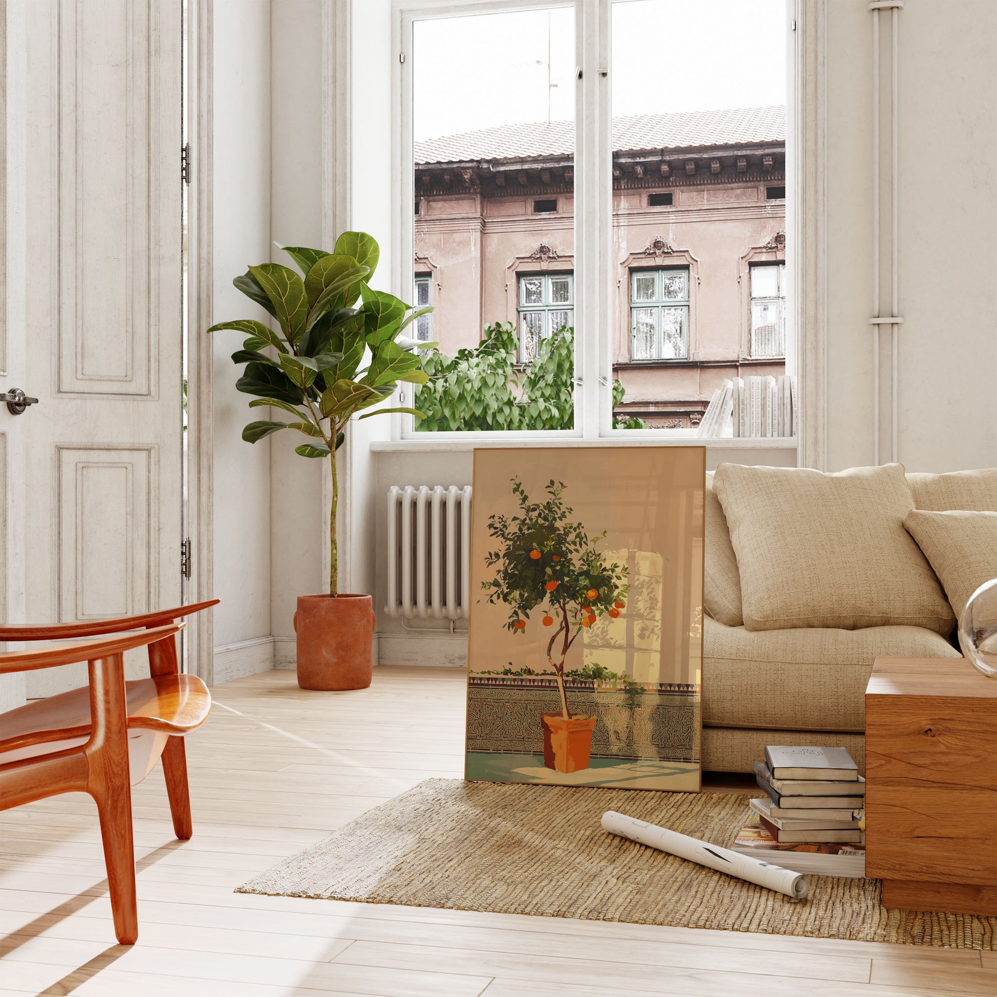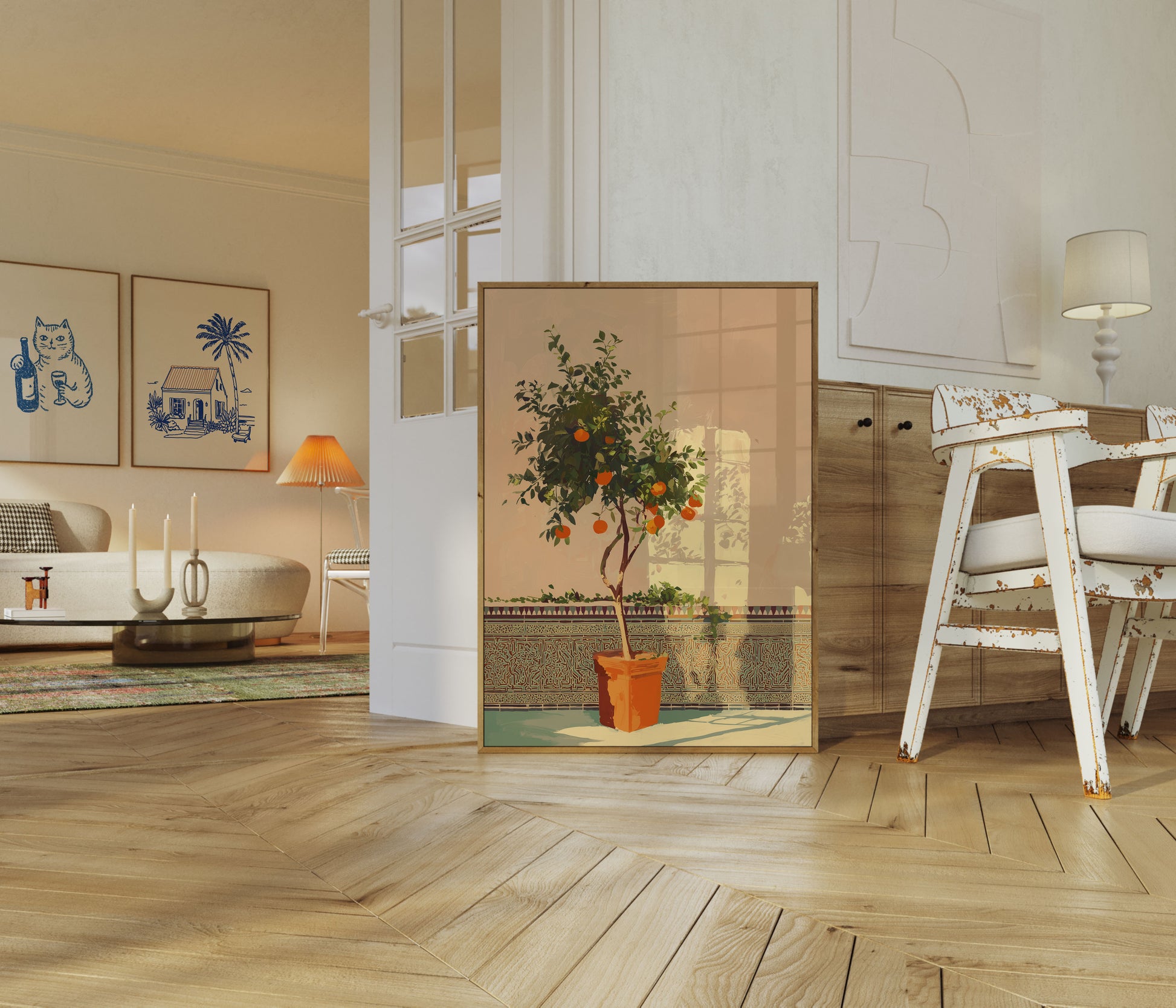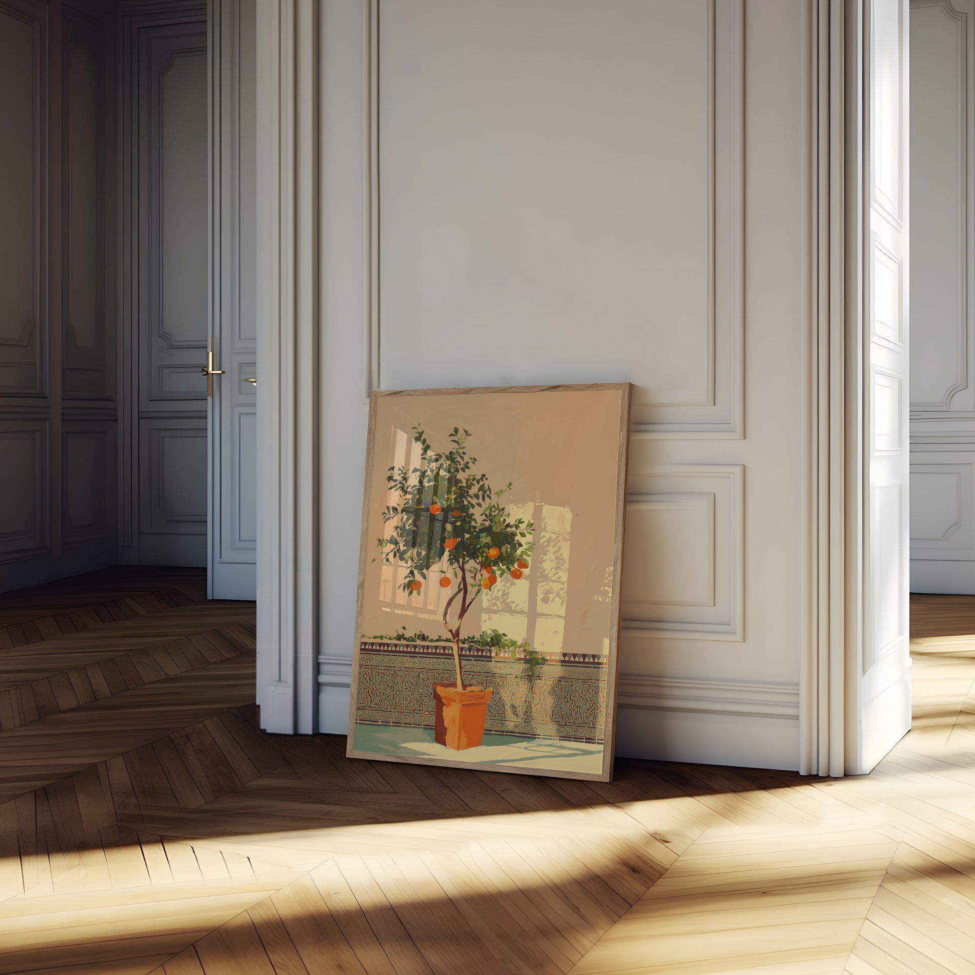 Questa straordinaria illustrazione cattura la serena bellezza di un rigoglioso albero di agrumi immerso nella calda luce dorata del sole. I vibranti frutti arancioni risaltano magnificamente contro il fogliame verde lussureggiante, creando una scena fresca e invitante che porta il fascino mediterraneo in qualsiasi spazio. L'ambientazione tranquilla del cortile con le sue piastrelle ornamentali e la finestra illuminata dal sole crea un'atmosfera tranquilla che evoca sensazioni di calore, crescita ed eleganza botanica.