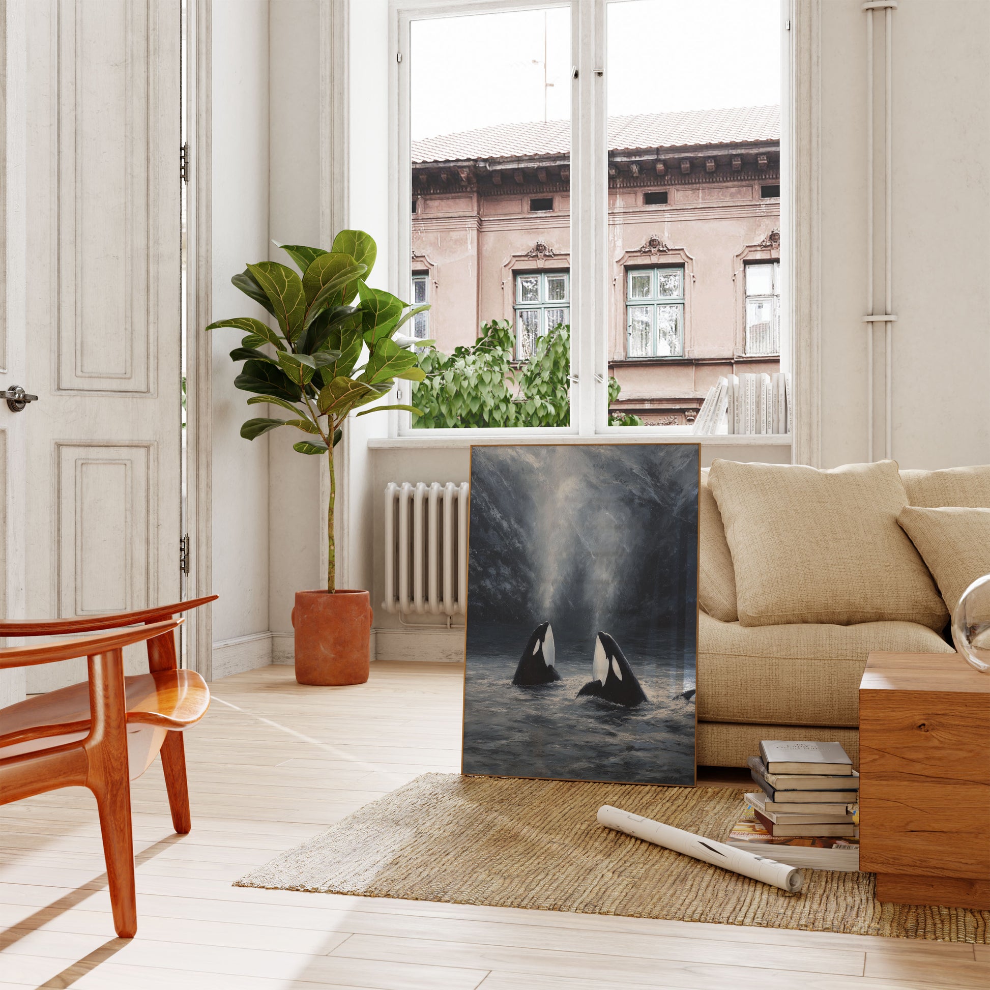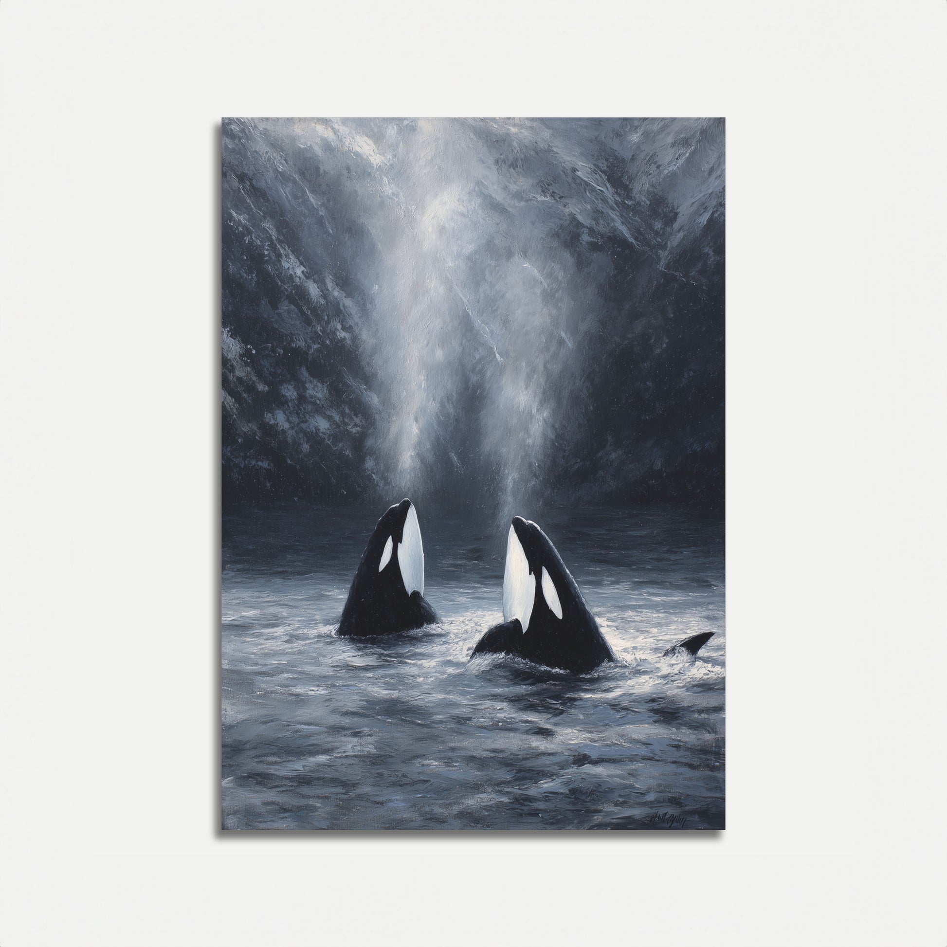 Questo straordinario capolavoro cattura due maestose orche che emergono da acque scure e ghiacciate con drammatici raggi di luce che penetrano attraverso imponenti scogliere coperte di neve. Il dipinto fonde magistralmente grigi malinconici, blu profondi e bianchi brillanti per creare un'atmosfera di mistero e meraviglia. La scena delle Orche nelle Montagne Nebbiose evoca un senso di stupore e riverenza per questi intelligenti mammiferi marini nel loro habitat artico naturale, con l'illuminazione eterea che aggiunge un tocco di magia a questo momento della fauna selvatica mozzafiato.