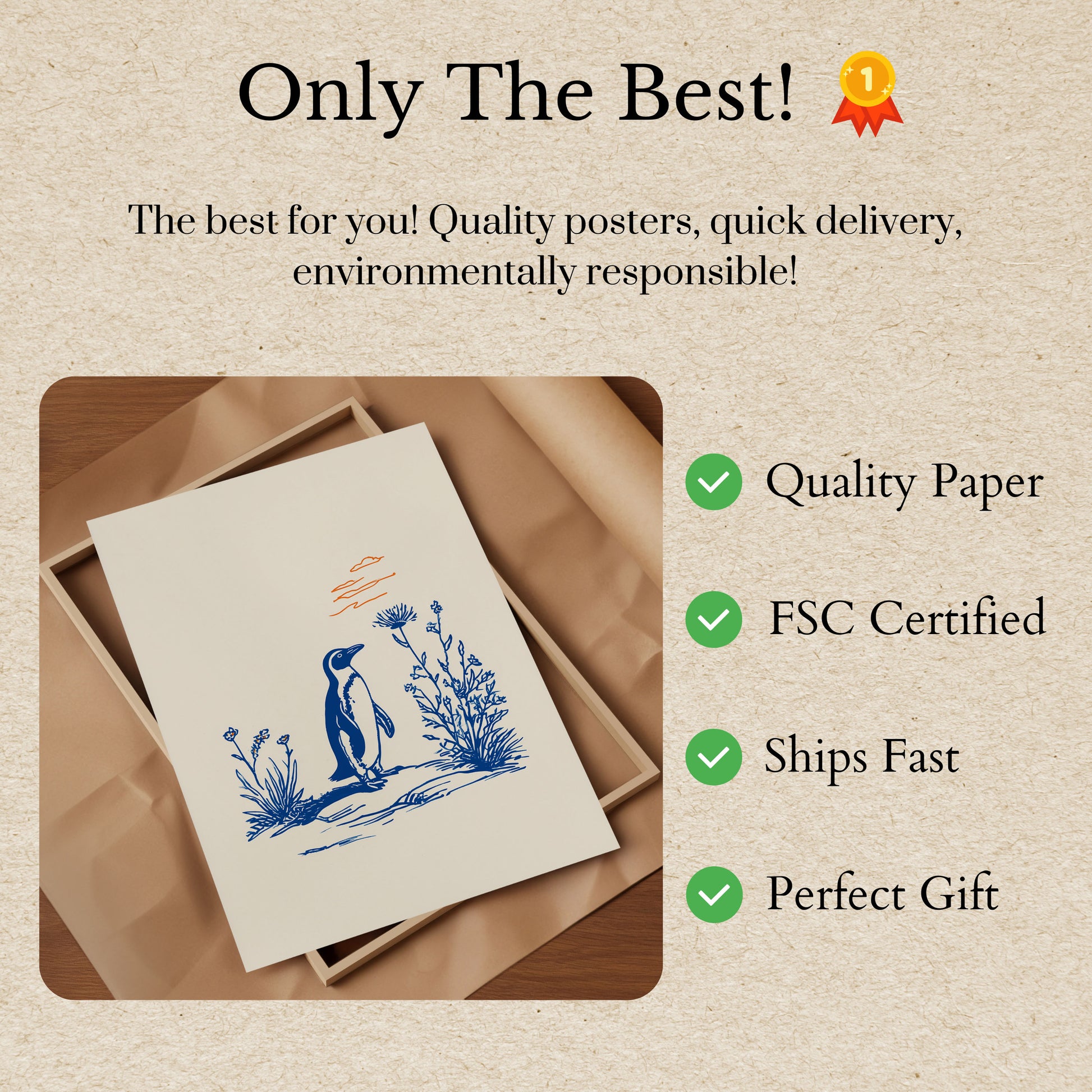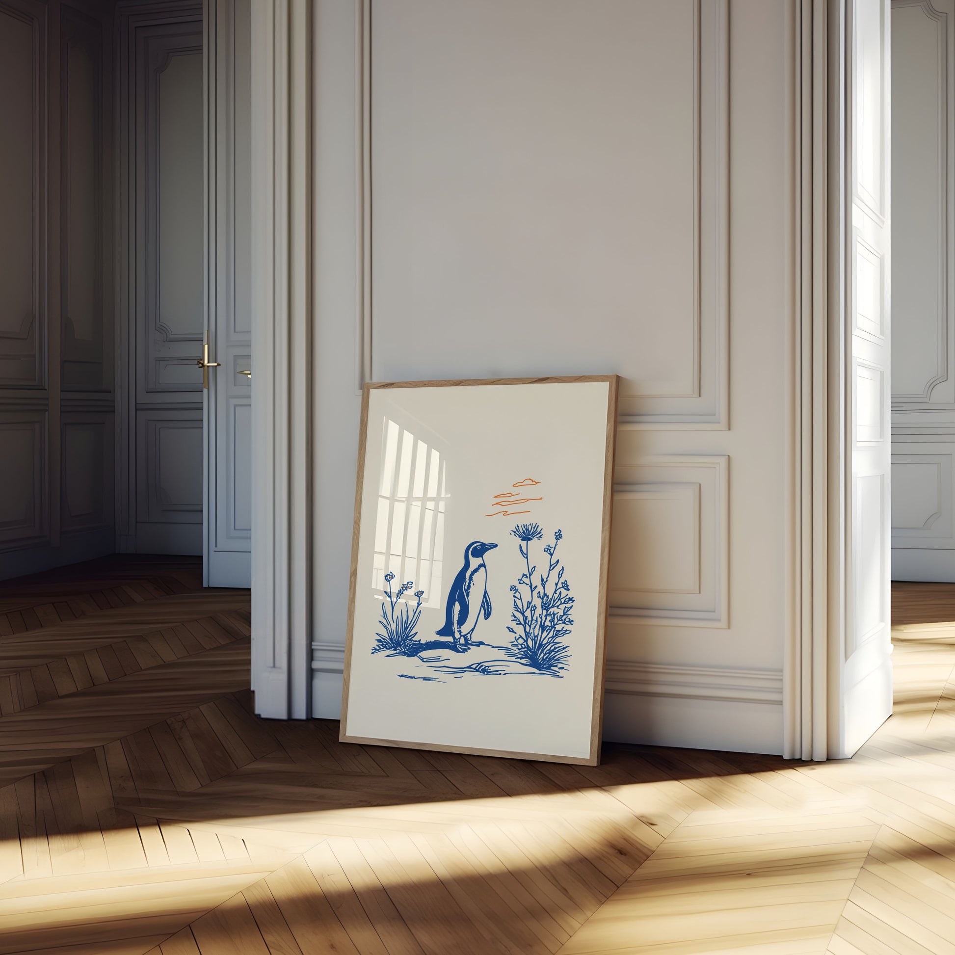 Questa affascinante illustrazione cattura un pinguino in piedi con grazia tra delicati fiori selvatici in uno stile meravigliosamente minimalista. Il contrasto sorprendente tra il pinguino blu profondo e lo sfondo color crema morbido crea un'atmosfera serena e contemplativa perfetta per qualsiasi stanza. Il lavoro lineare dettagliato e gli elementi botanici aggiungono eleganza e sofisticazione a questa scena della fauna selvatica capricciosa, rendendola una scelta ideale per gli amanti della natura e gli appassionati di animali.