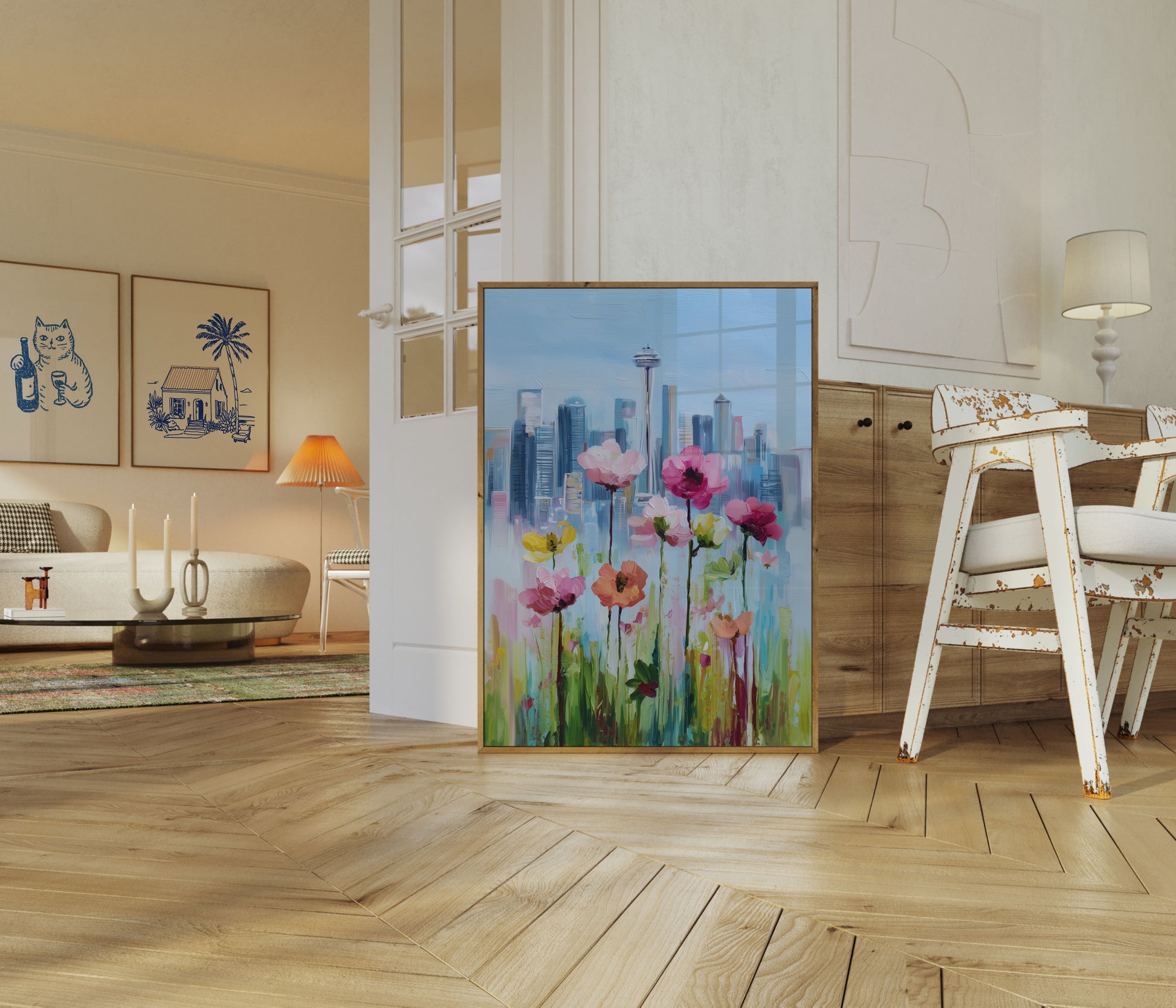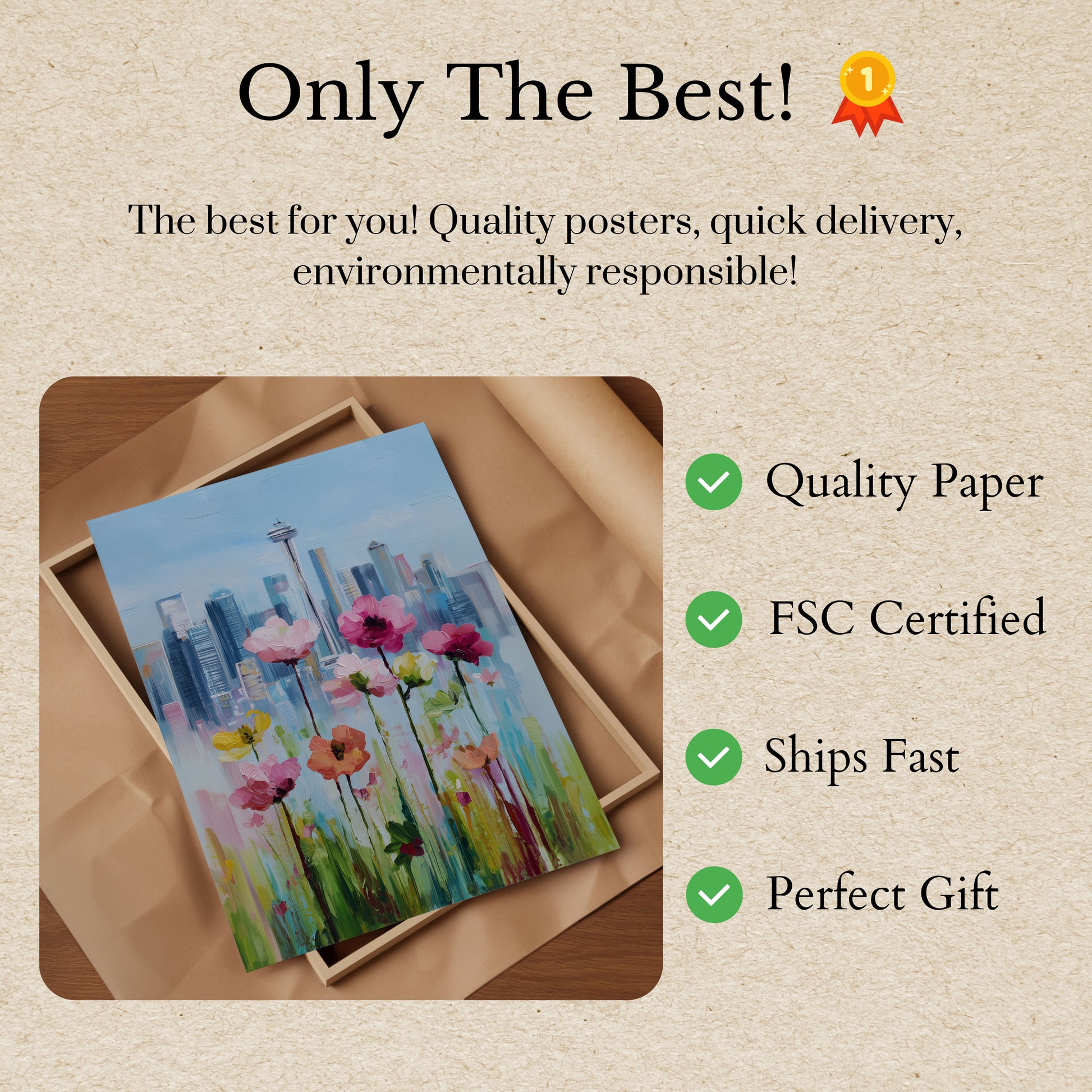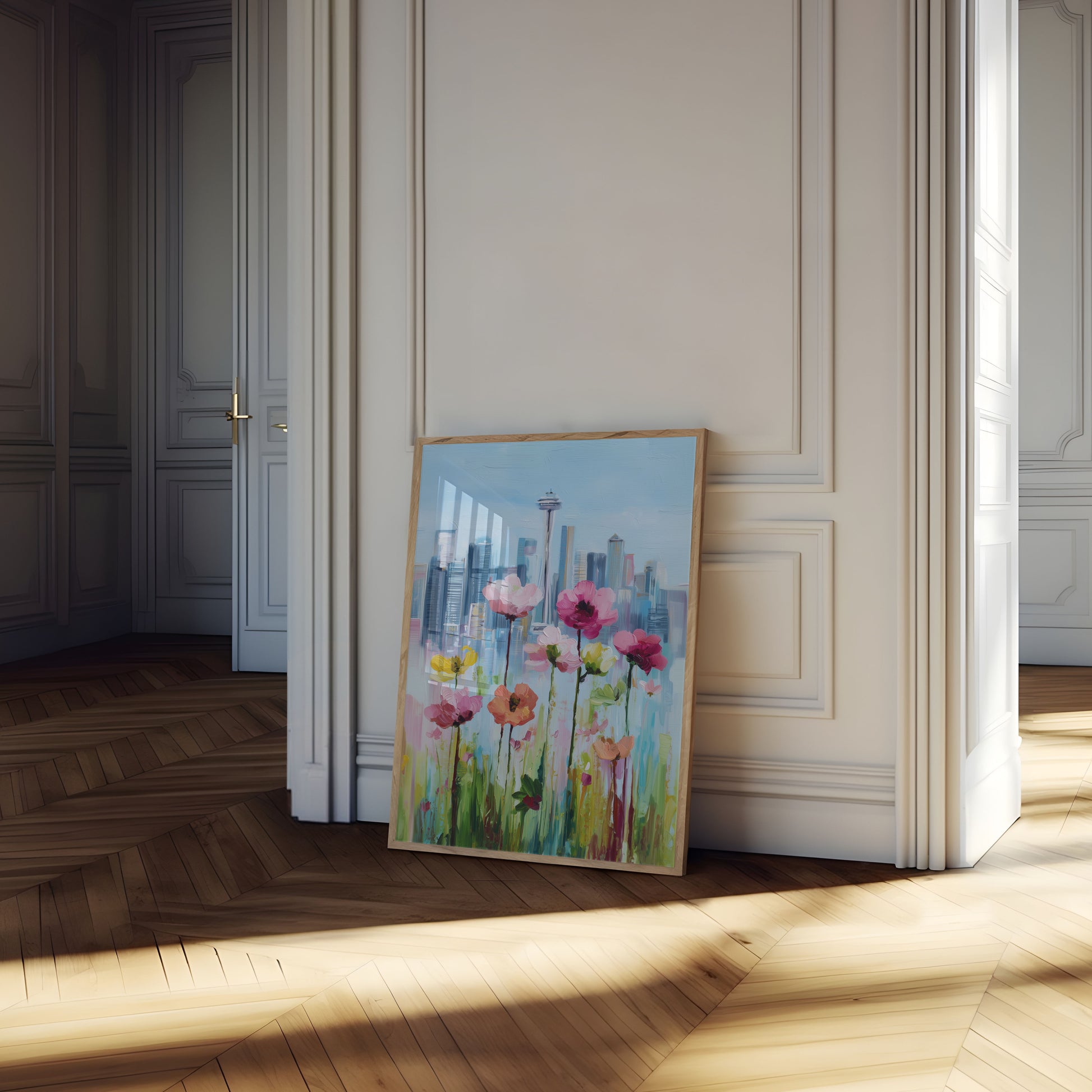 Questo straordinario capolavoro fonde splendidamente l'architettura urbana con la natura vibrante, creando una fusione onirica tra la città e la campagna. I colorati fiori selvatici in tonalità di rosa, rosso, giallo e bianco si muovono elegantemente in primo piano, mentre l'iconica skyline di Seattle—completa dell'Space Needle—si erge maestosamente sullo sfondo sotto un cielo azzurro tenue. Il dipinto cattura un perfetto equilibrio tra l'energia metropolitana e la bellezza naturale, evocando un senso di speranza, crescita e rinnovamento urbano attraverso i suoi tratti di pennello espressivi e la tavolozza di colori luminosi. Che tu sia un residente di Seattle, un amante della natura o qualcuno che apprezza l'armonia tra la vita cittadina e i paesaggi naturali, questo poster porta uno spirito contemporaneo e stimolante in qualsiasi stanza.