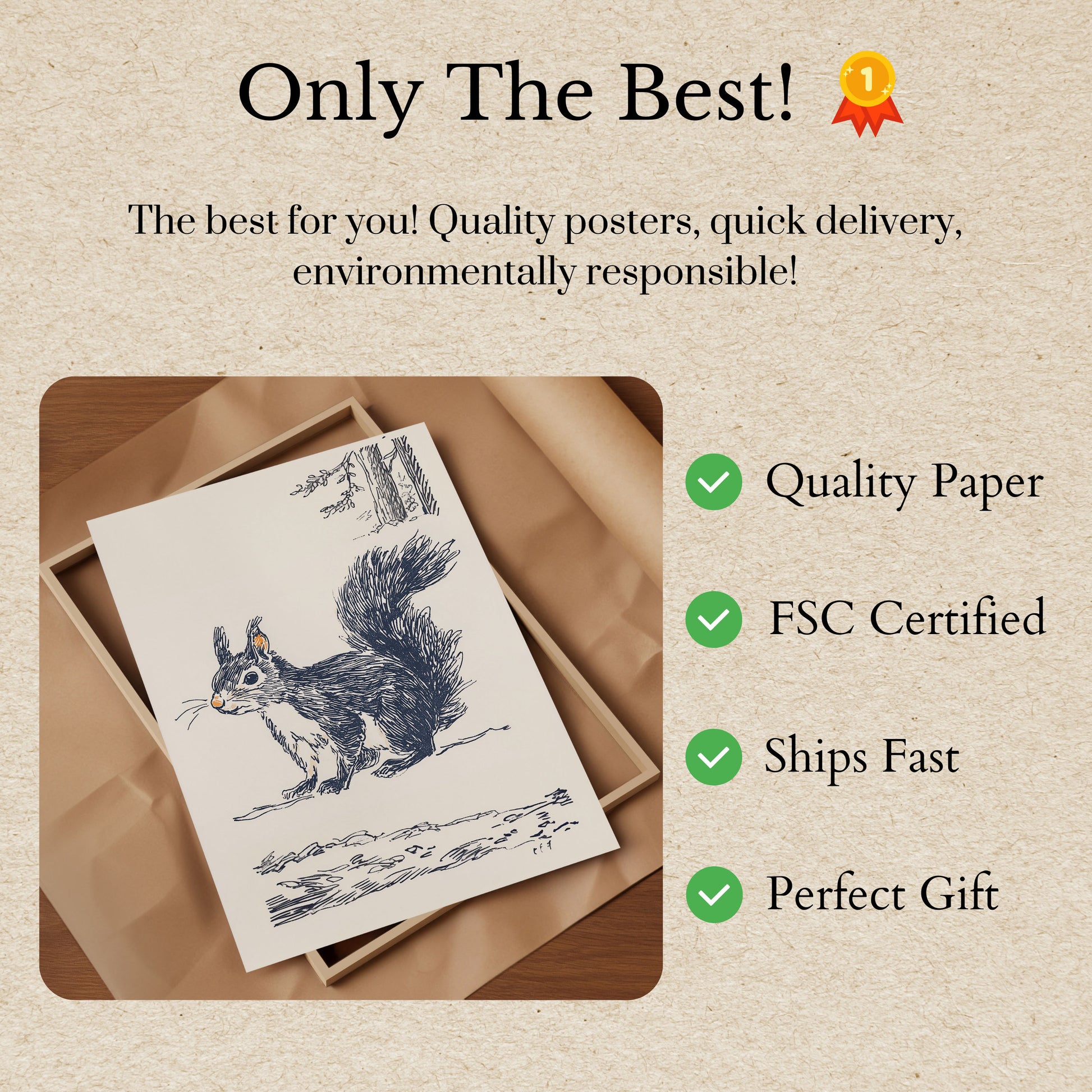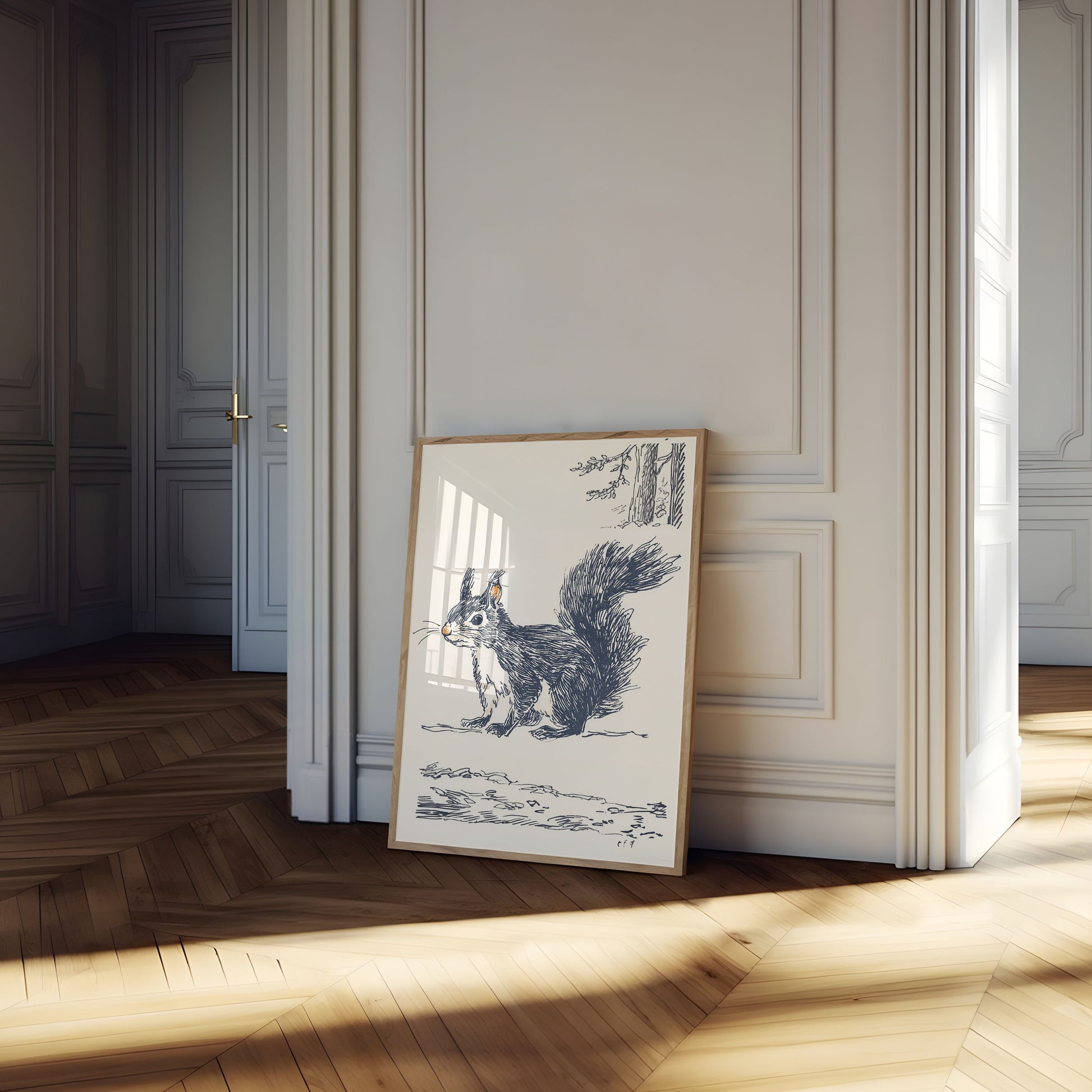 Questo affascinante disegno cattura uno scoiattolo curioso nel suo habitat naturale nel bosco, realizzato in inchiostro nero classico con delicati accenti arancioni sugli occhi e il naso. Il lavoro di linea dettagliato dà vita alla creatura dalla coda soffice, mostrando caratteristiche espressive e texture di pelliccia intricata che rendono questo piccolo abitante della foresta irresistibilmente affascinante. Lo sfondo accenna a alberi imponenti e al pavimento della foresta, creando una scena boschiva tranquilla che affascina gli amanti della natura e gli appassionati di animali. Perfetto per portare un tocco di bellezza naturale e un'accogliente atmosfera da bosco in qualsiasi stanza.
