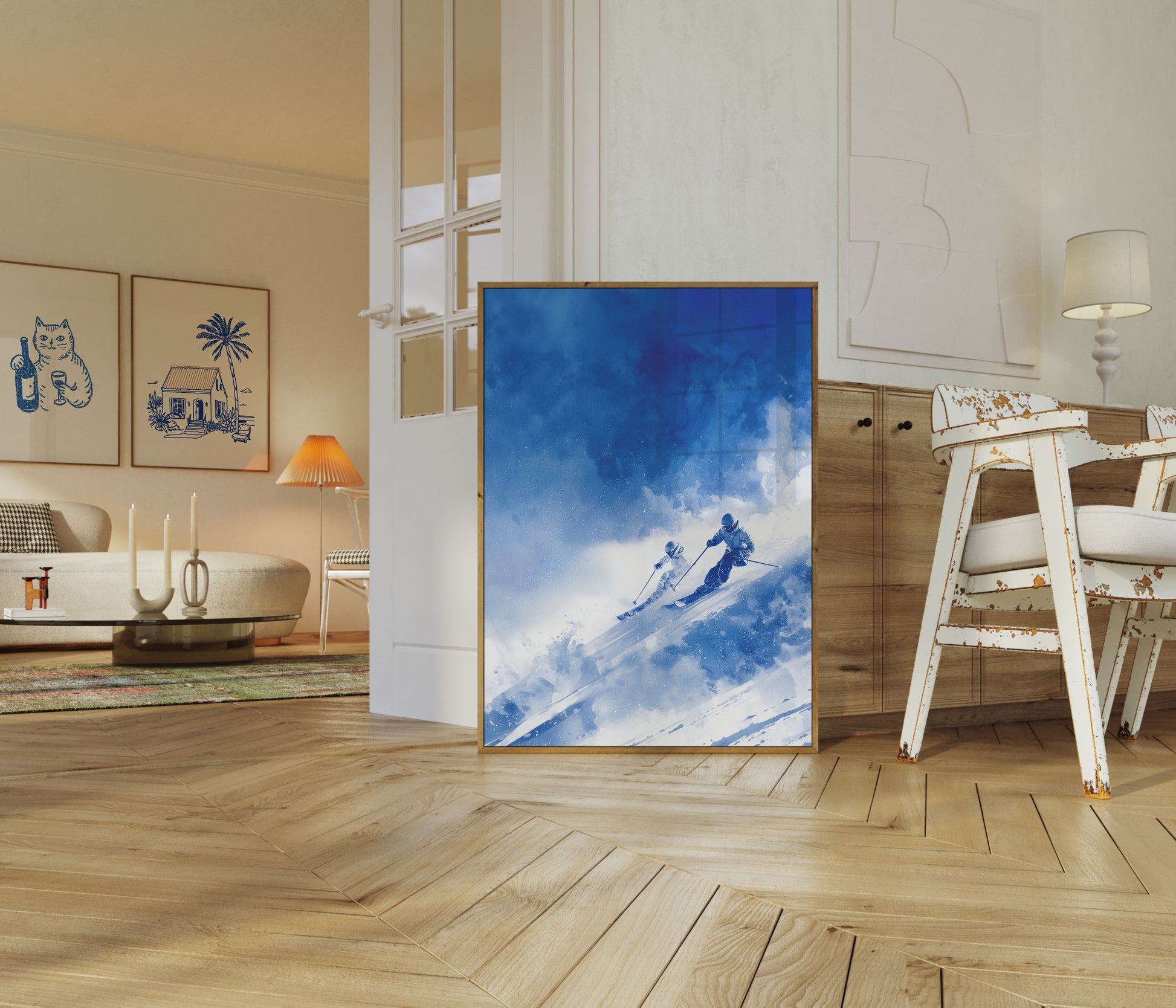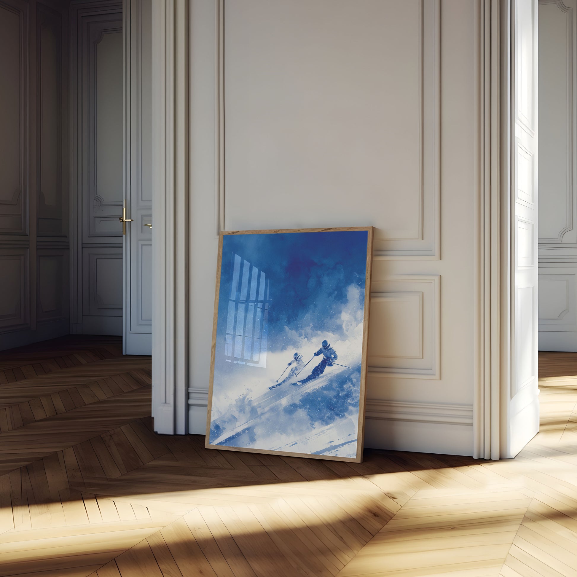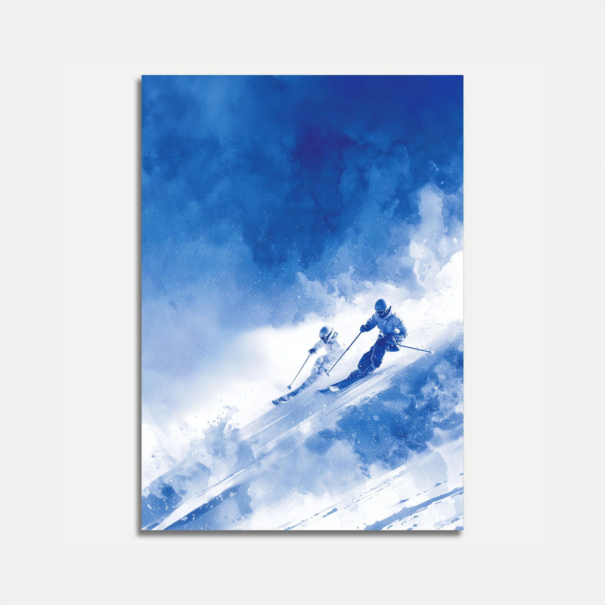 Due skiaitori esperti incidono attraverso un paesaggio invernale incontaminato, creando archi dinamici di movimento contro uno sfondo mozzafiato blu e bianco. La neve polverosa si diffonde drammaticamente intorno alla loro rapida discesa, catturando lo spirito entusiasmante dello sci alpino. Le tonalità monocromatiche blu creano un senso di movimento etereo ed energia invernale nitida.