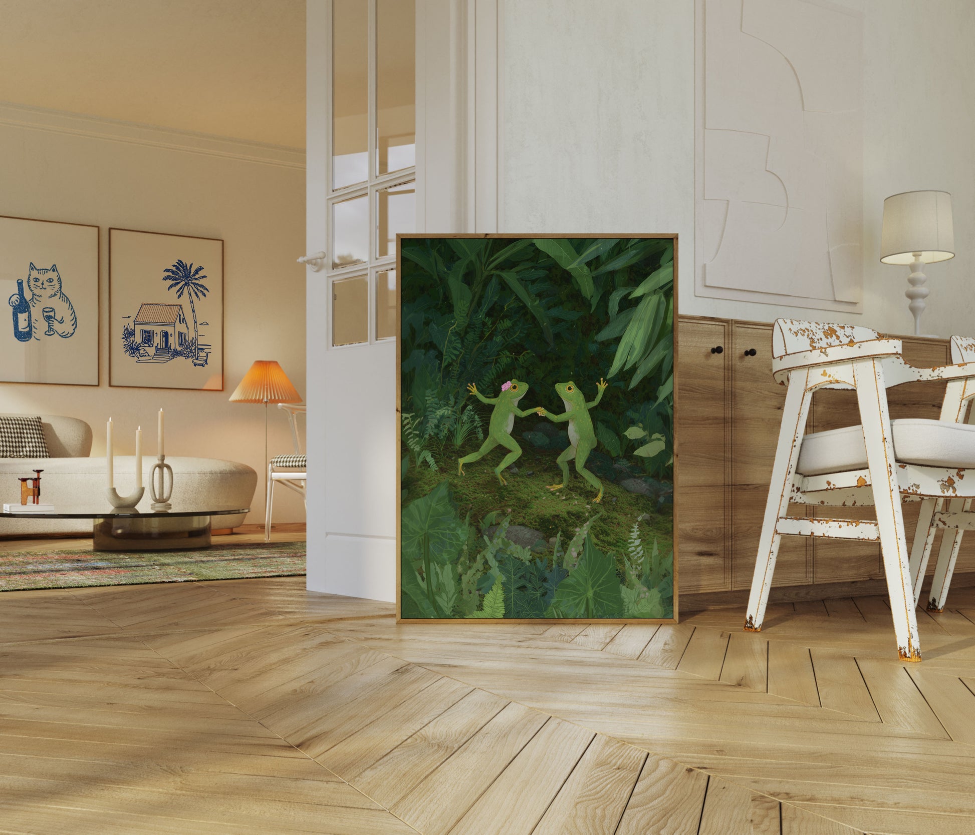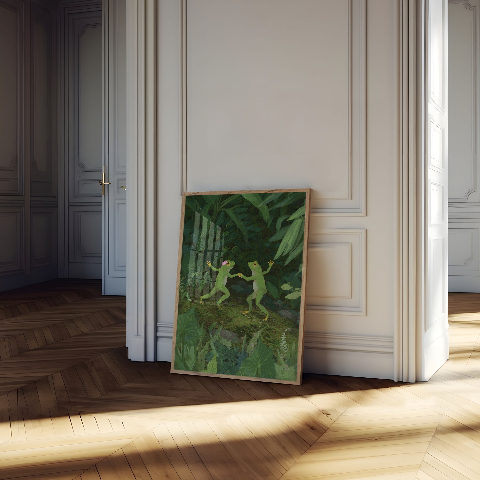 Due frughe verdi giocose condividono un momento delizioso in un ambiente di giungla lussureggiante e verdeggiante. Una rana indossa un incantevole fiore rosa, mentre entrambe assumono una posa animata su un terreno muschiato circondato da foglie e felci verdi vibranti. Questa illustrazione incantevole cattura il capriccio e la magia dell'ecosistema della foresta pluviale.