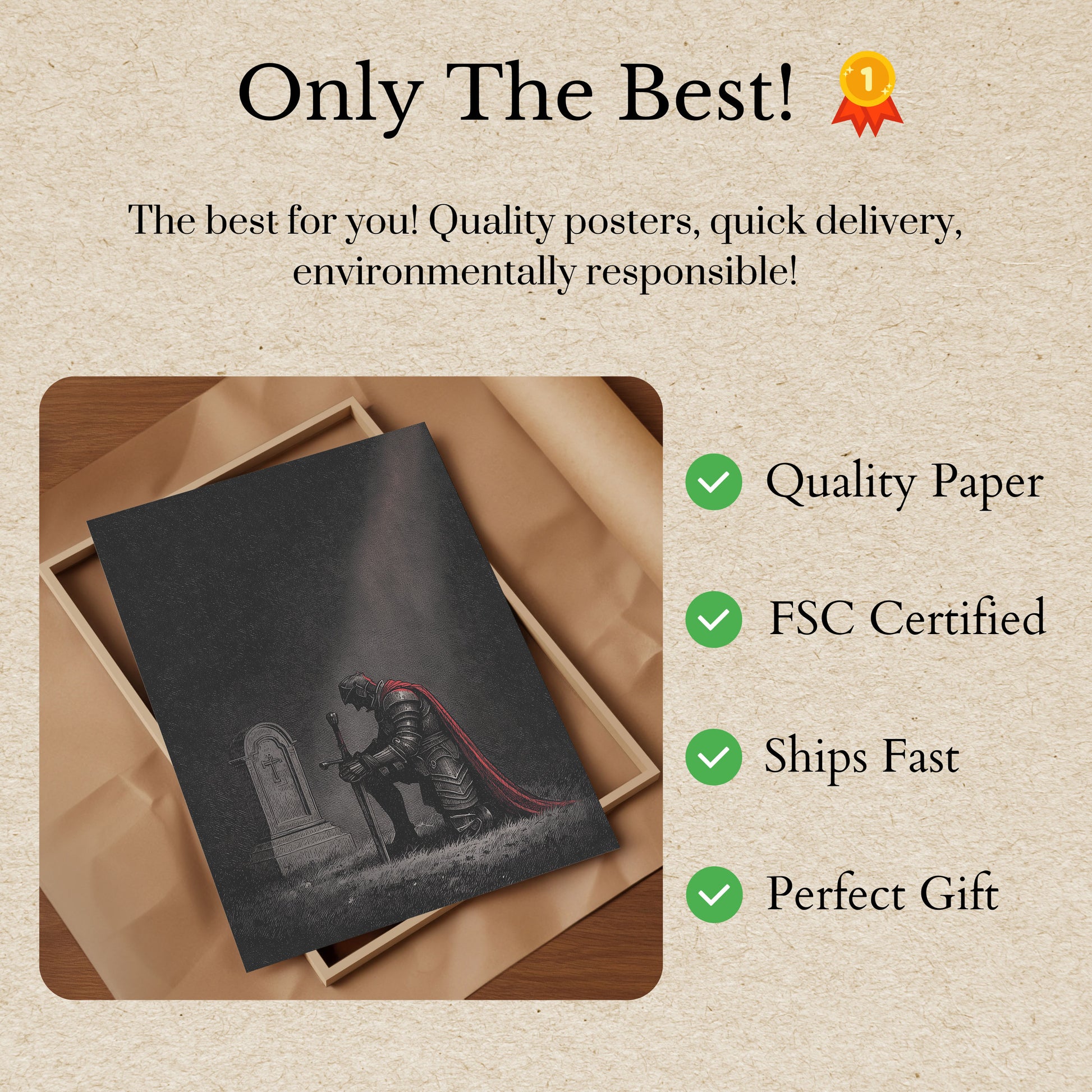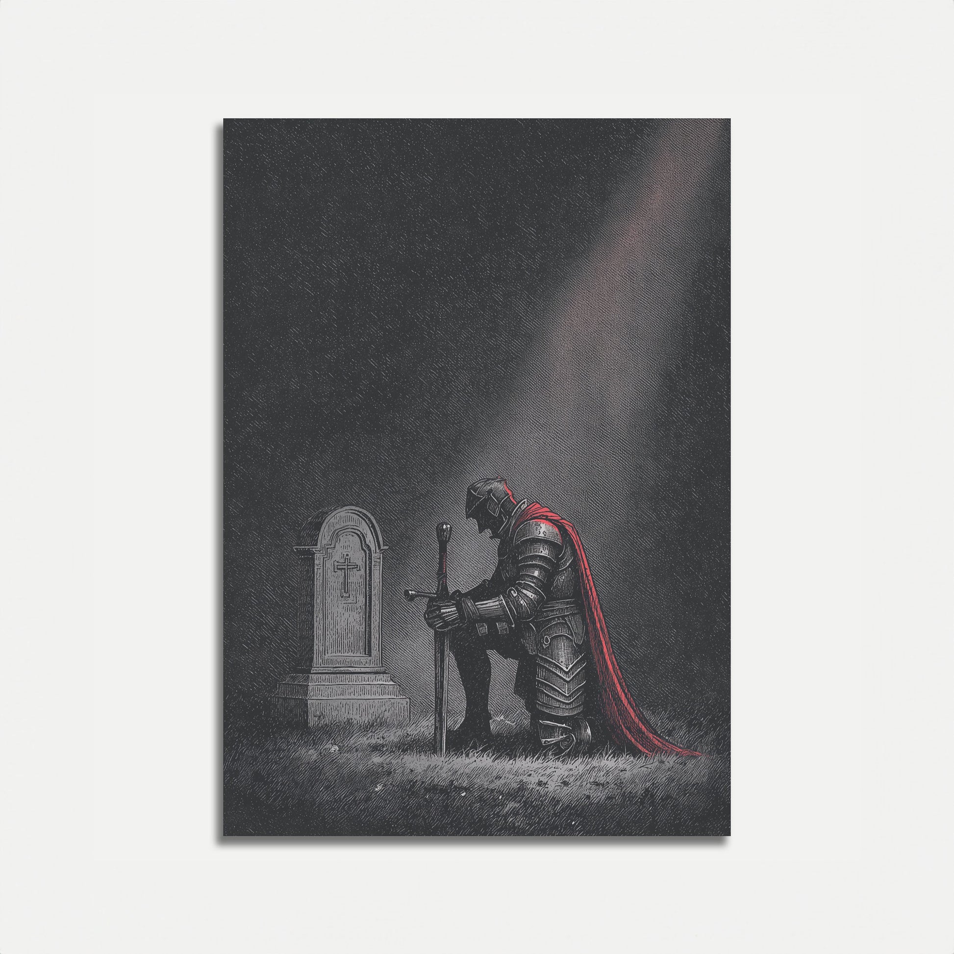 Questa straordinaria illustrazione in bianco e nero cattura un momento potente di fede e devozione. Un cavaliere medievale in armatura completa si inginocchia solennemente davanti a una croce di pietra, la sua spada riposa nelle vicinanze, mentre un mantello cremisi si drappa drammaticamente sulle sue spalle. Lo stile dell'incisione dettagliato e la pioggia atmosferica creano un'atmosfera intensamente riverente, fondendo i temi della cavalleria, della spiritualità e della redenzione in un'unica immagine iconica che parla di onore, sacrificio e resa spirituale.