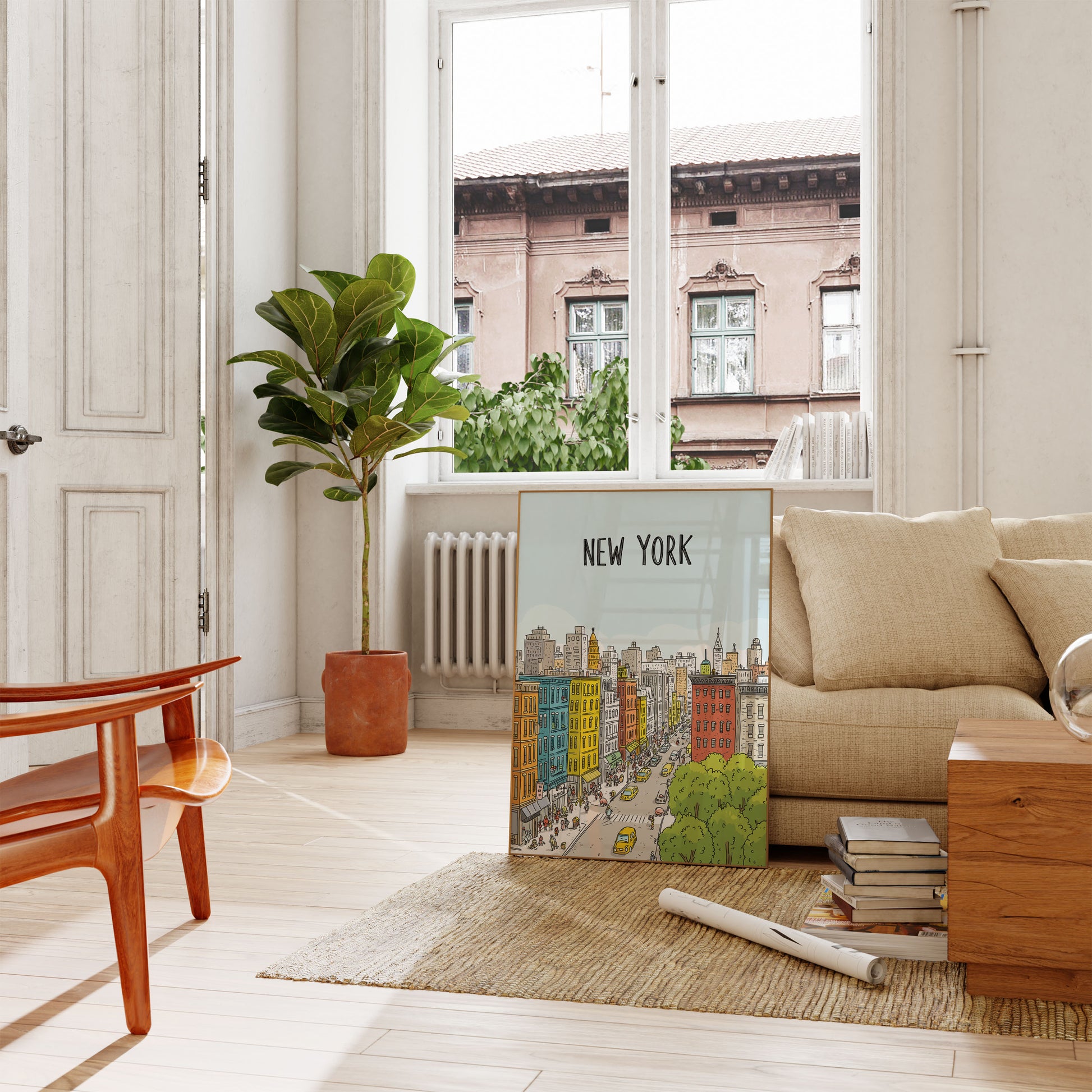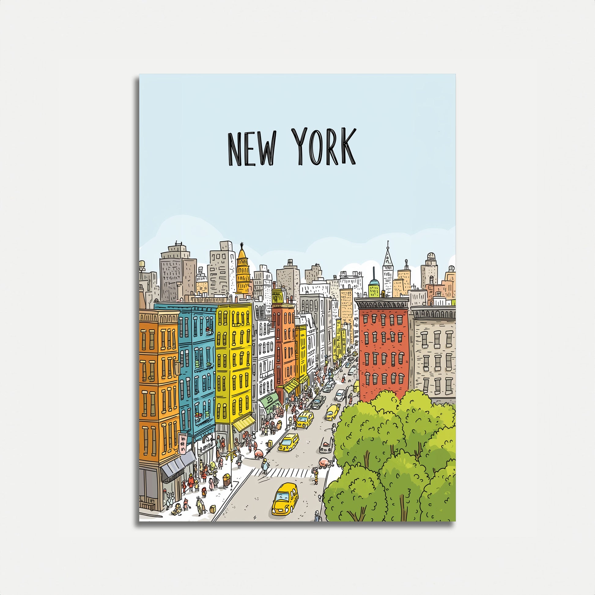 Tuffati nel cuore vivace di New York City con questa deliziosa illustrazione che cattura l'energia frenetica della vita urbana. Edifici brownstone colorati si affacciano su una strada vivace piena di taxi gialli, pedoni e l'iconica skyline di Manhattan sullo sfondo. Ricco di gialli caldi, blu, arancioni e alberi verdi lussureggianti, questo poster porta in vita lo spirito di NYC in uno stile cartone animato delizioso e dettagliato.