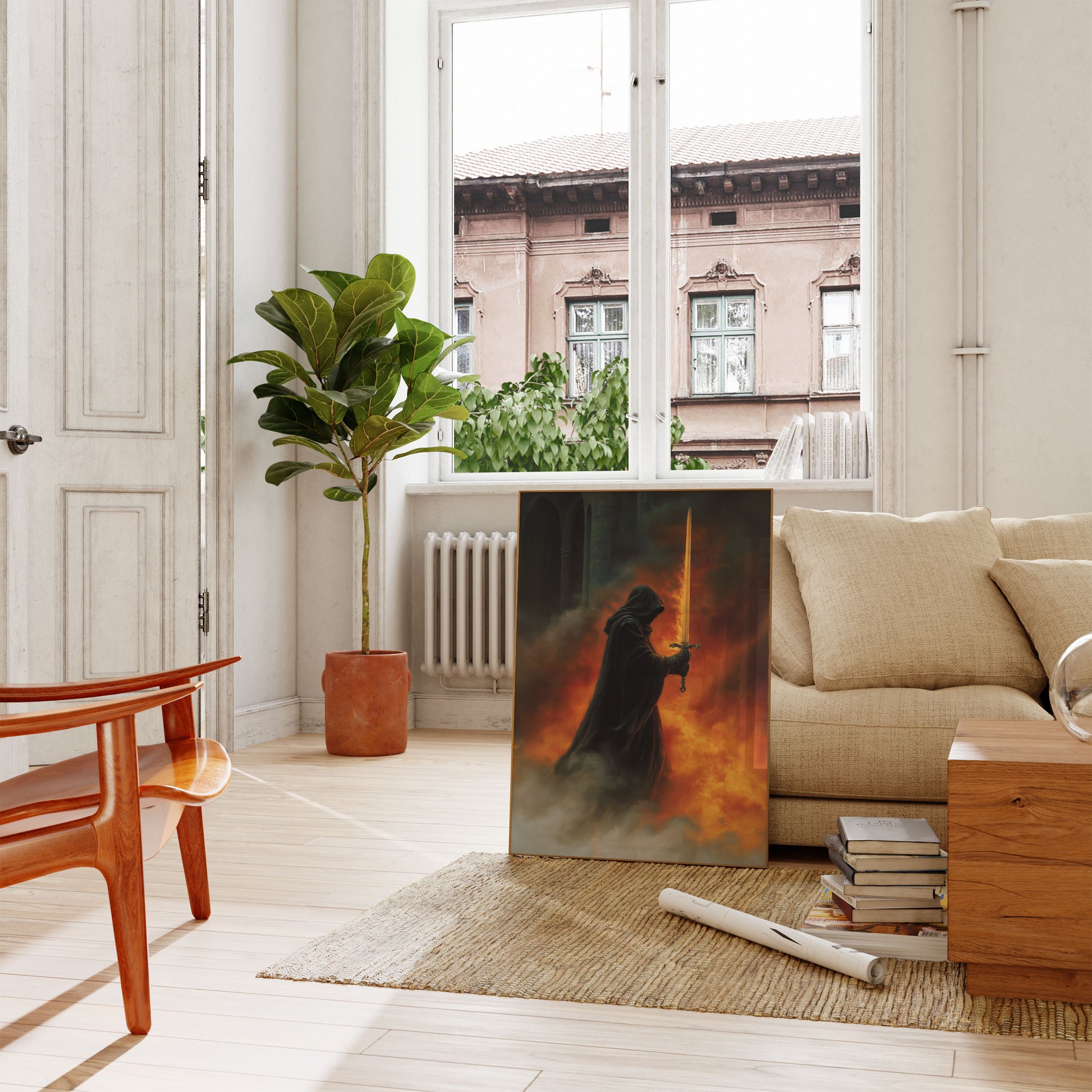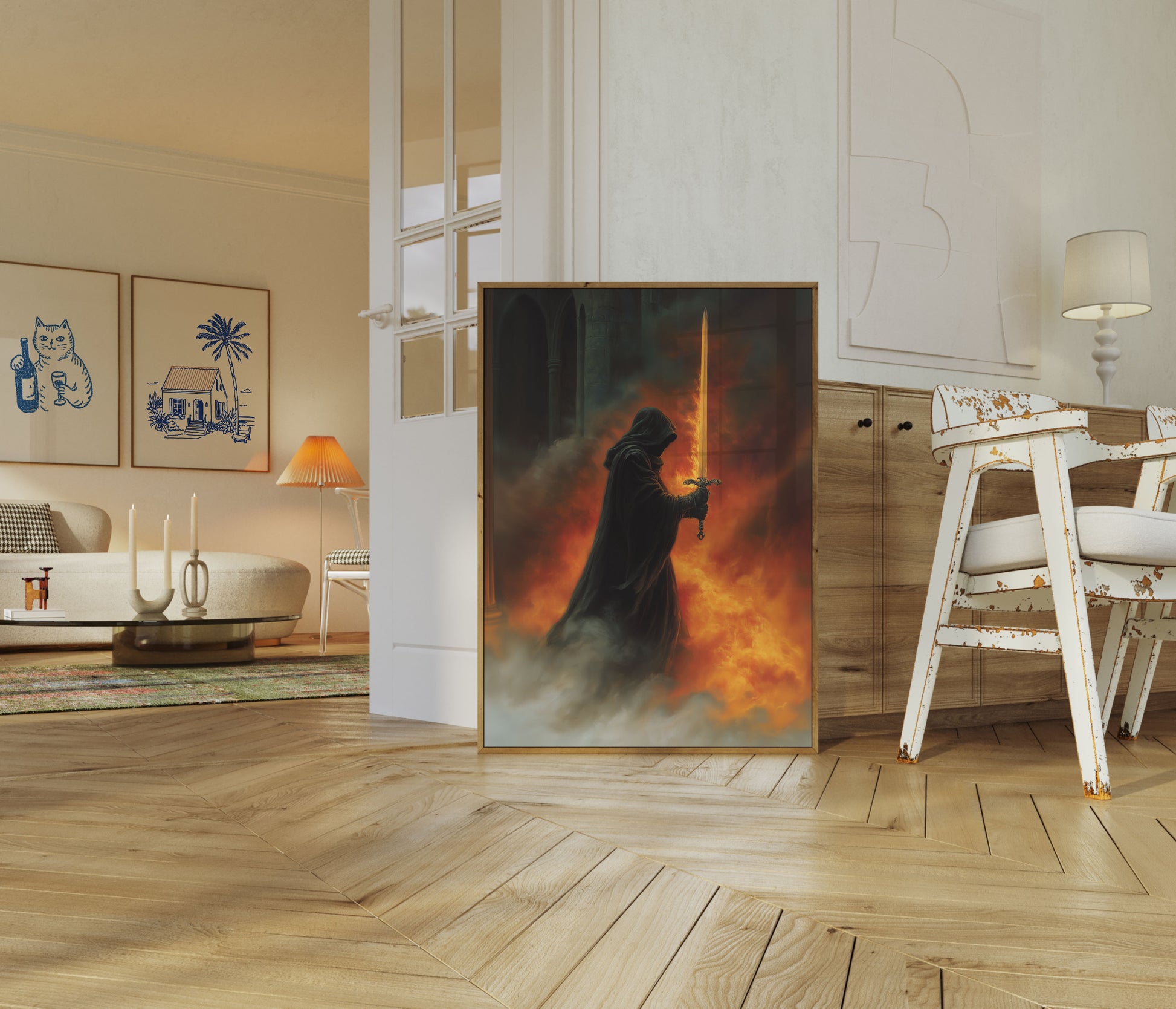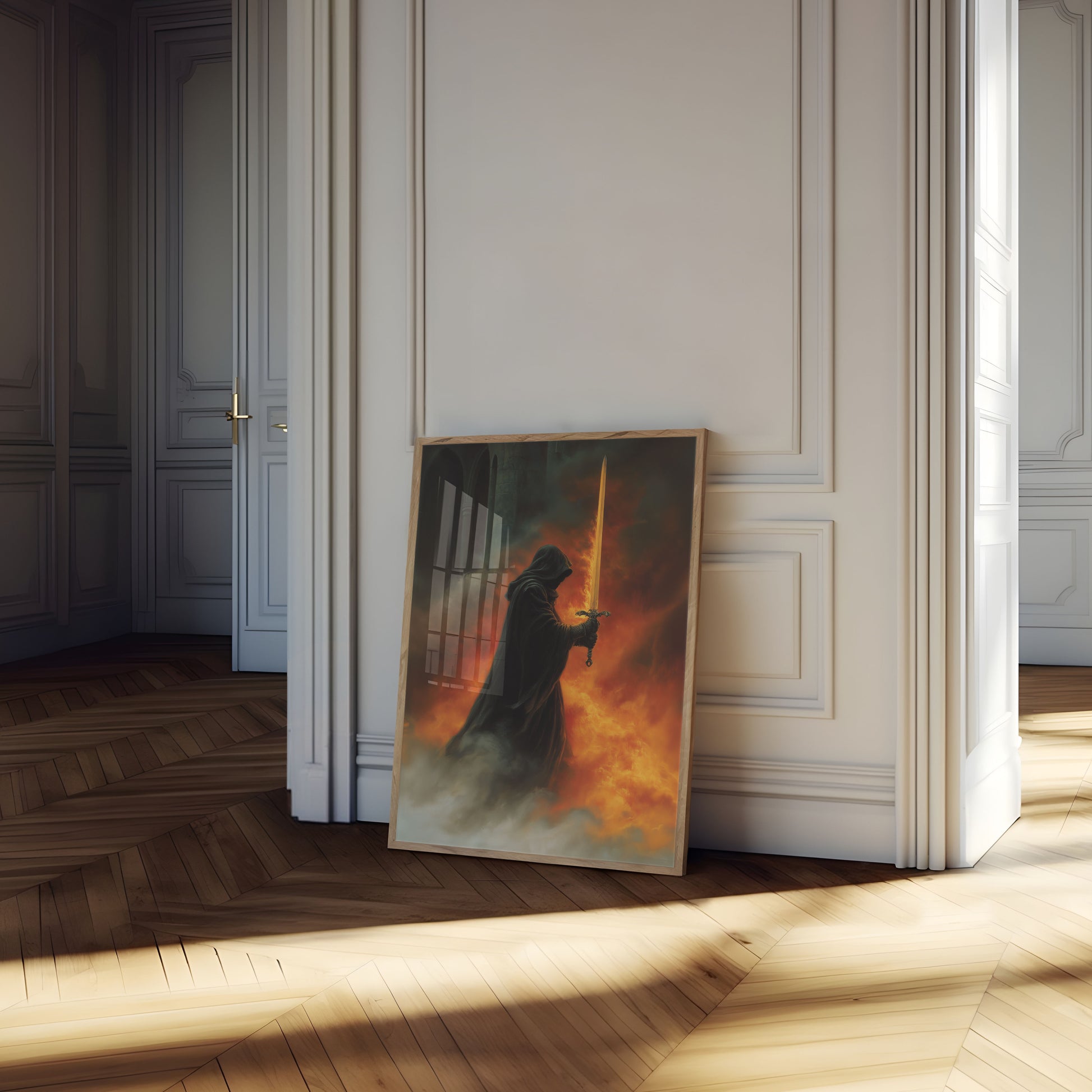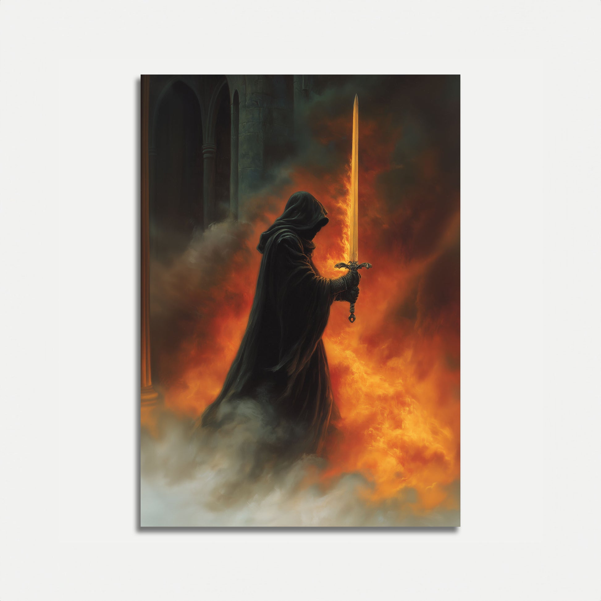 Questa drammatica opera d'arte fantasy cattura un cavaliere incappucciato che brandisce una spada dorata ornata in mezzo a un inferno infuocato. Le intense fiamme arancioni e rosse consumano l'atmosfera, creando una scena mozzafiato di coraggio e conflitto ambientata in una fortezza di pietra gotica. La lama luminosa taglia il fumo e le ceneri, evocando temi di lotta eroica, fantasy oscuro e guerra medievale che affascinerà i fan delle storie fantasy epiche e dell'arte drammatica.