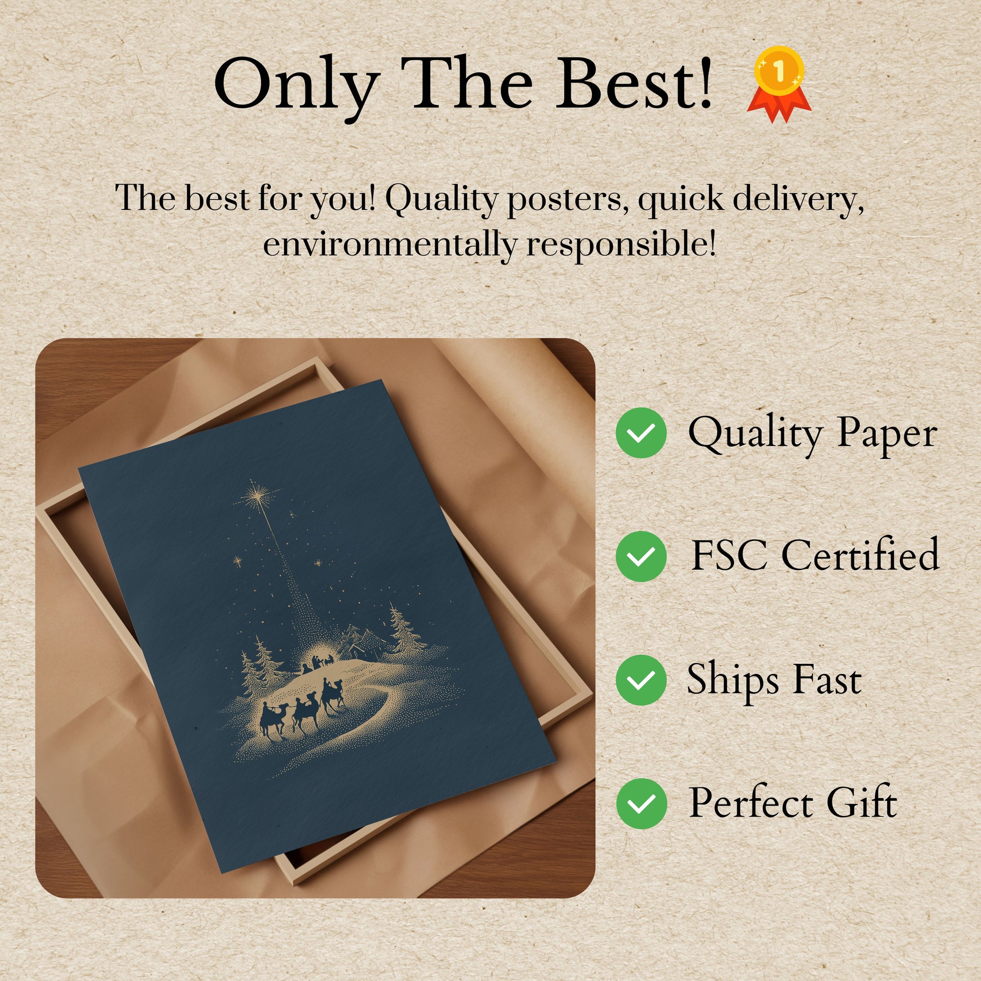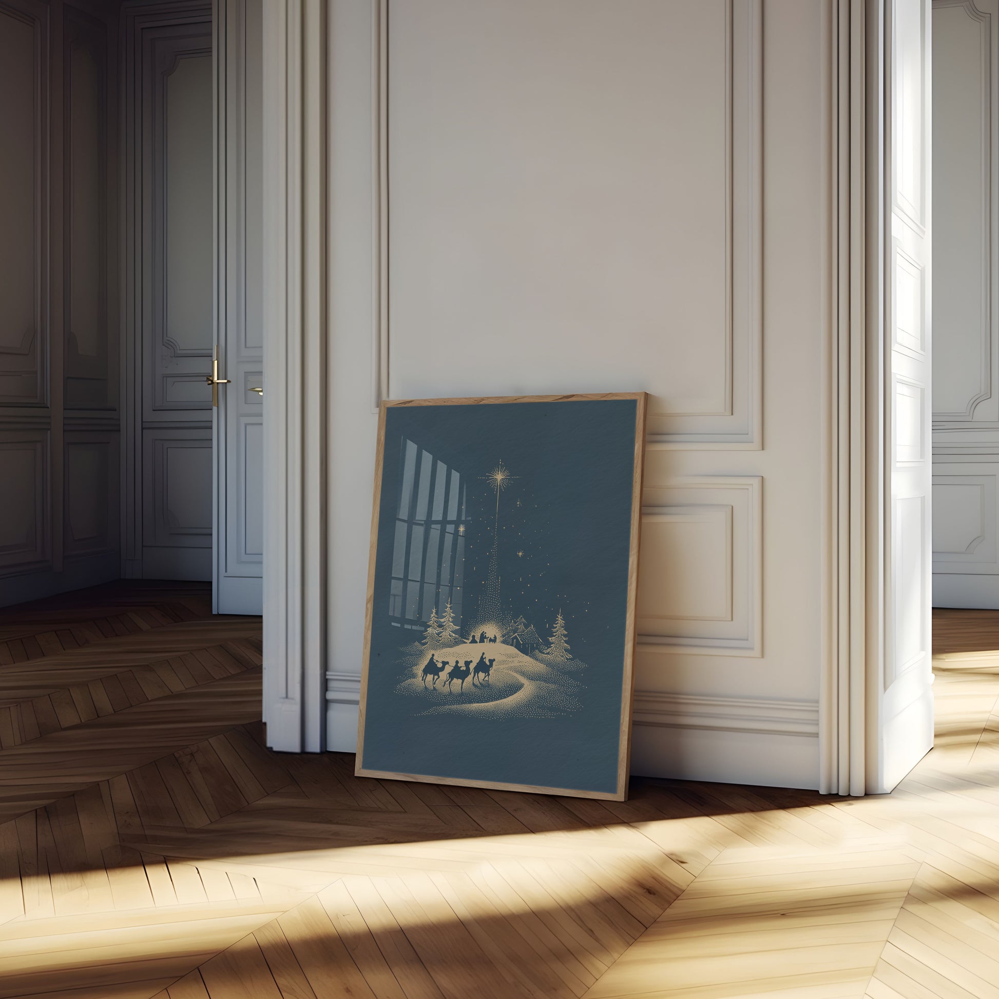 Duik onder in de tijdloze betovering van het kerstverhaal met deze prachtige vintage-stijl illustratie. Getekend in een adembenemende combinatie van diepblauw en goudcrème, vangt de poster de serene tocht van de Drie Wijzen onder een stralende hemelse ster. Delicate stippenwerk schept een dromerig, etherisch landschap met dennenbomen, verre bergen en een kleine stal, en roept de vredige geest van het kerstseizoen op.