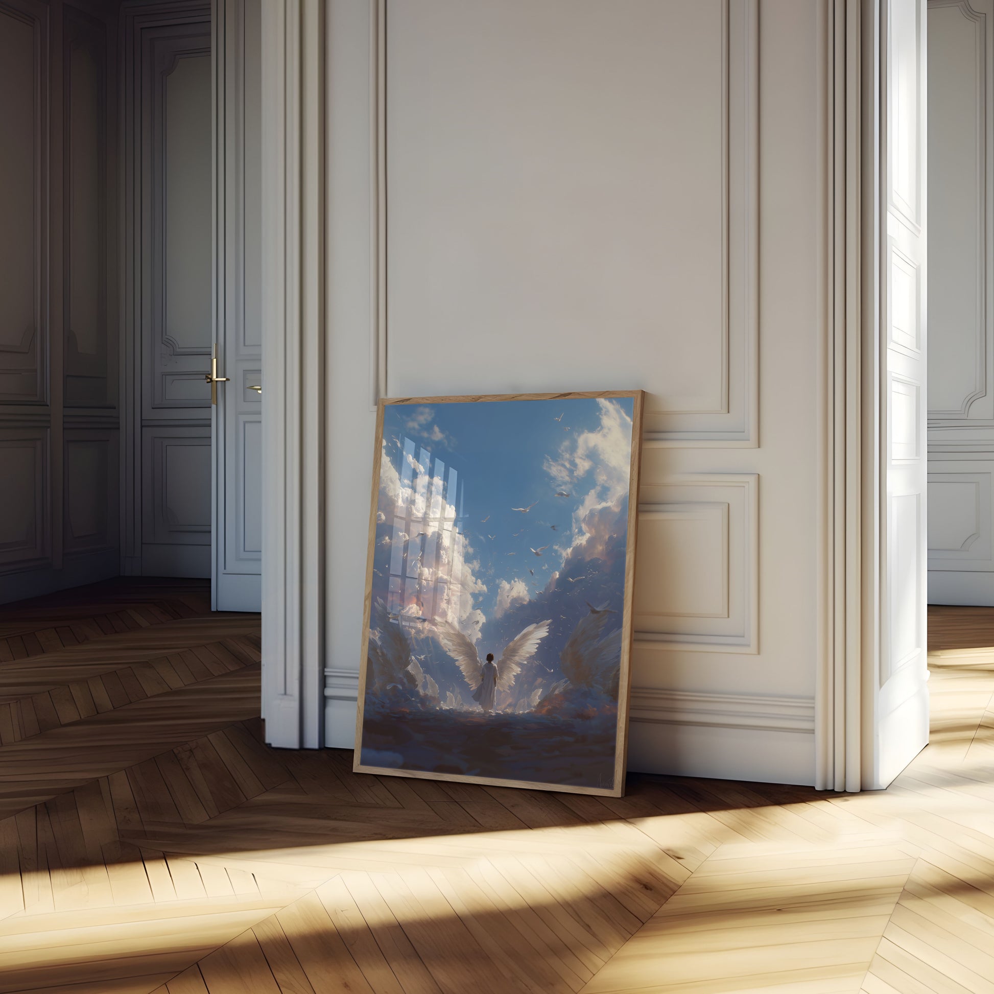 Een adembenemende hemelse scène ontvouwt zich met een engelachtige figuur die zich bevindt te midden van opbolgende wolken, omringd door zachte witte vleugels en vliegende duiven. Lumineus zonlicht filtert door dramatische wolkenformaties, waardoor een transcendente sfeer van vrede en spiritueel ontwaken ontstaat. De afbeelding vangt een moment van etherische schoonheid en goddelijke transformatie.