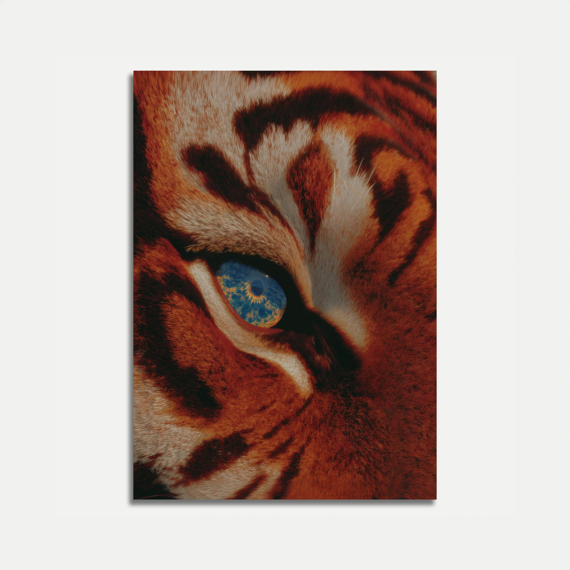 Een betoverende close-up van een tijgeroog onthult een verbluffende blauwe en gouden iris tegen de rijke, vurige oranje en witte vacht van deze magnificente rover. De gedetailleerde weergave vangt de pure kracht en mystiek van het dier, waarbij toeschouwers worden meegetrokken in zijn doordringende blik. Elke haar en textuur vertelt een verhaal van wilde schoonheid en ongetemde geest.