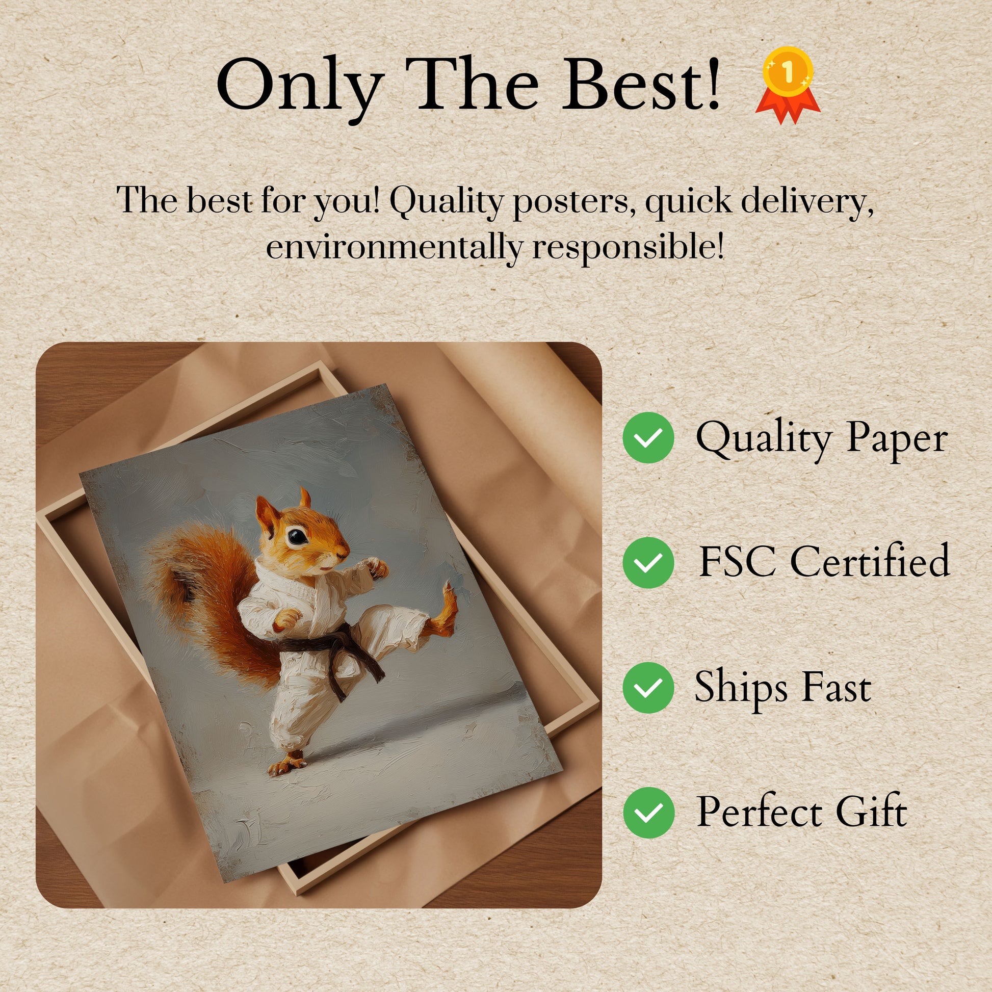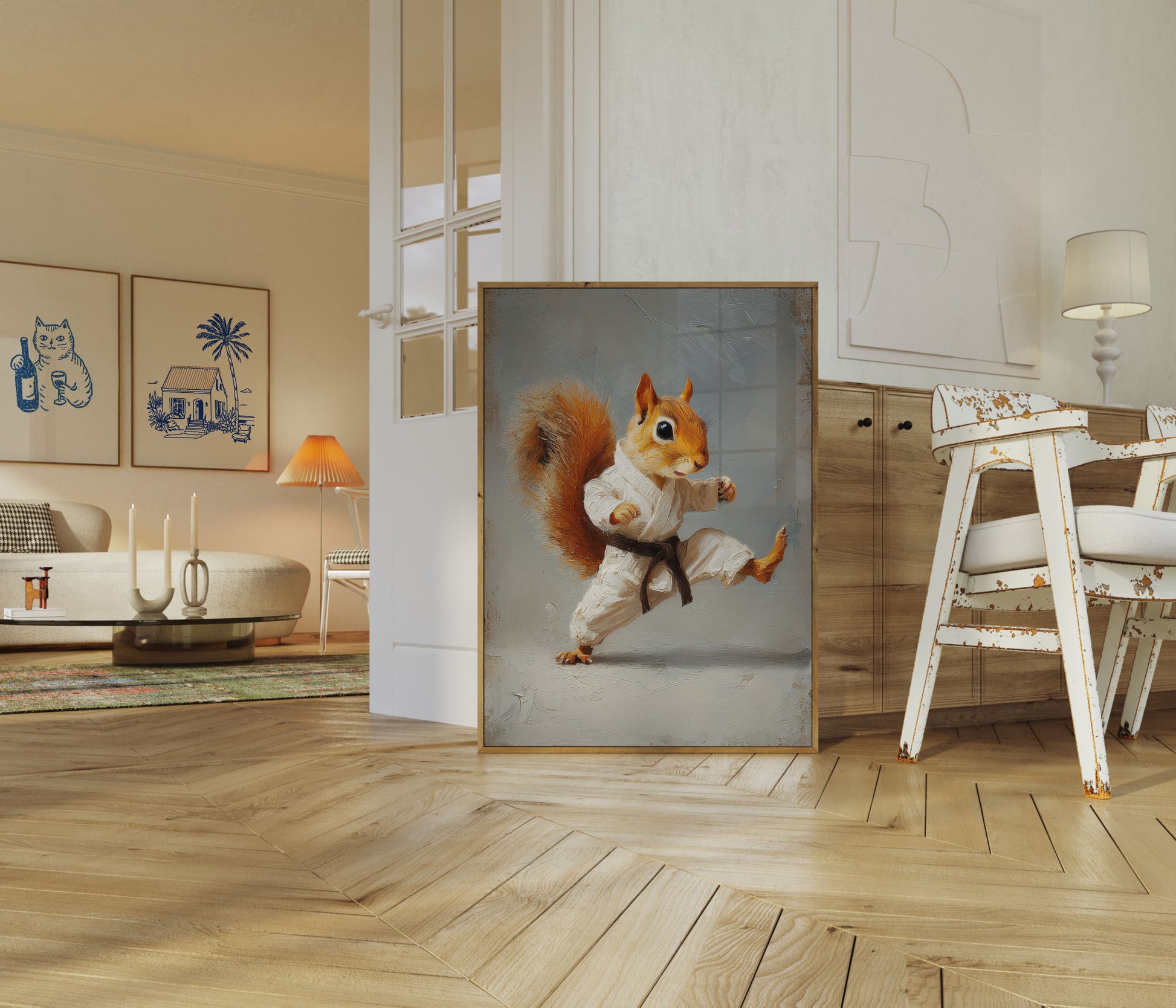 Bereid je voor op een betoverend meesterwerk dat een gedurfde eekhoornarti├źle martial arts-krijger in volle actie toont, gekleed in een strak wit karatepak met een stoere zwarte band. De schilderachtige stijl vangt elk gedetailleerd element vast, van het pluizige oranje bont tot de intense, geconcentreerde blik in zijn ogen, geplaatst tegen een zachte, gelaagde grijze achtergrond die diepte en dynamiek aan dit onverwachte atletische portret geeft. Deze heerlijke kunstuiting verandert een doorsnee bosdier in een buitengewone krijger, waarbij humor, vaardigheid en verbeelding samensmelten in een adembenemend beeld.