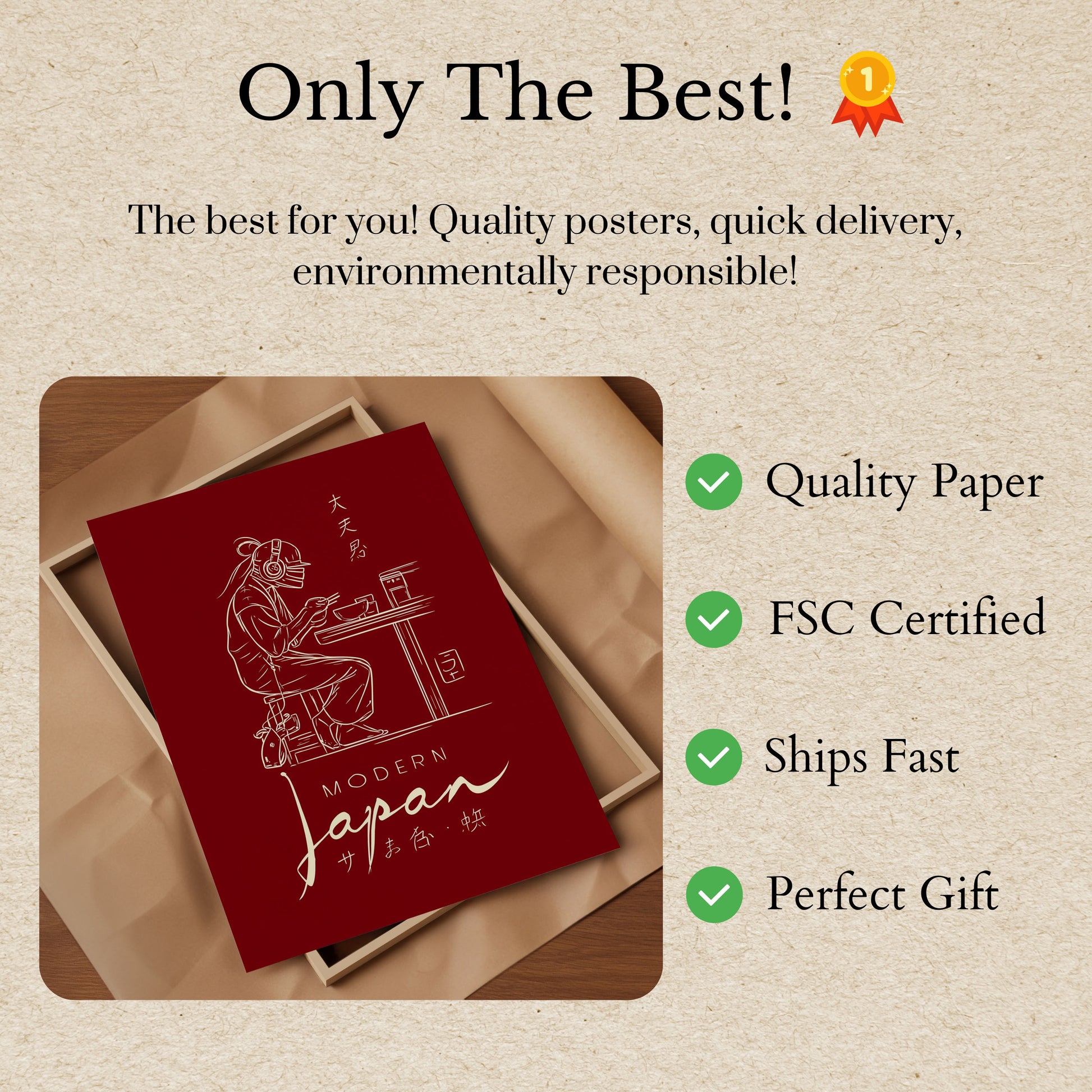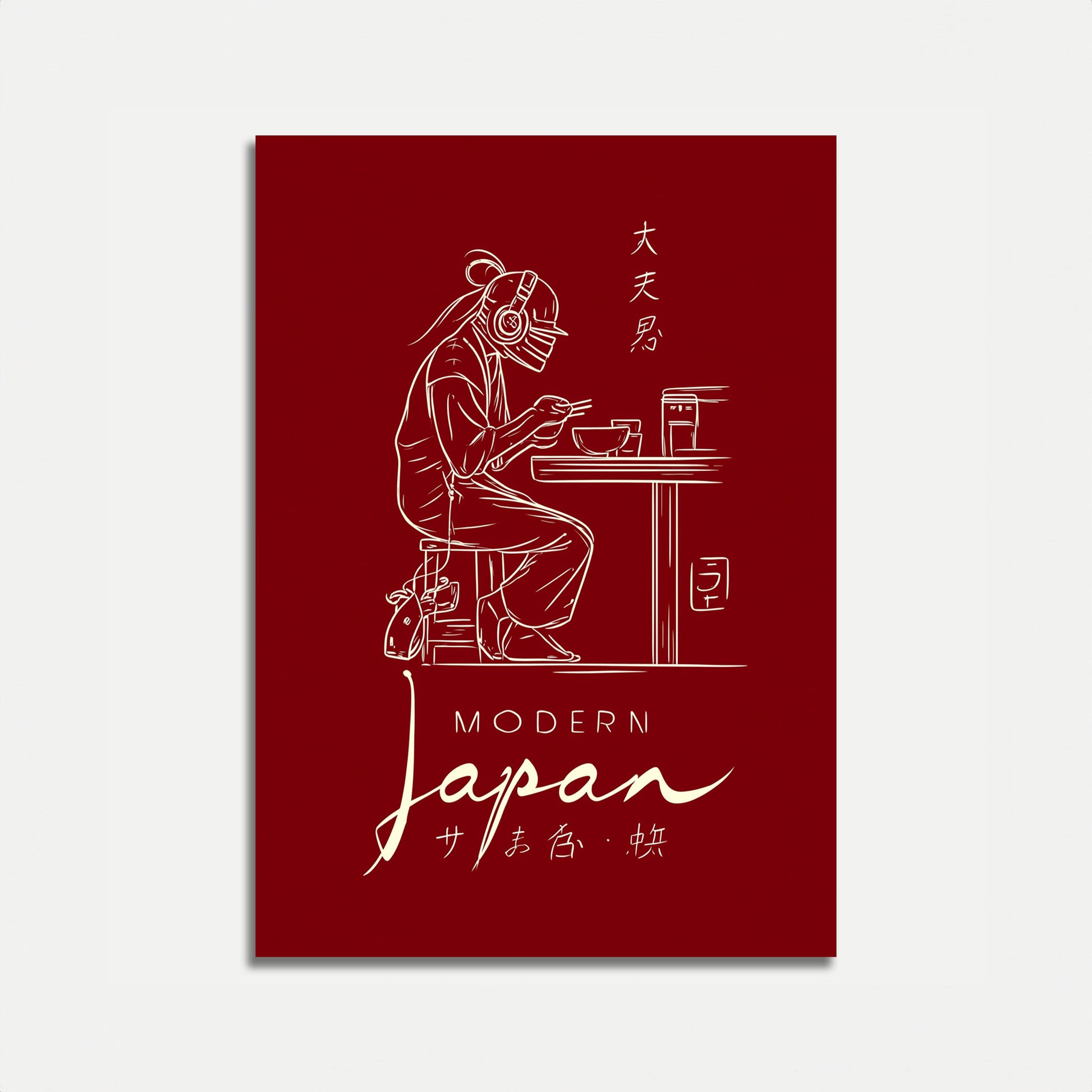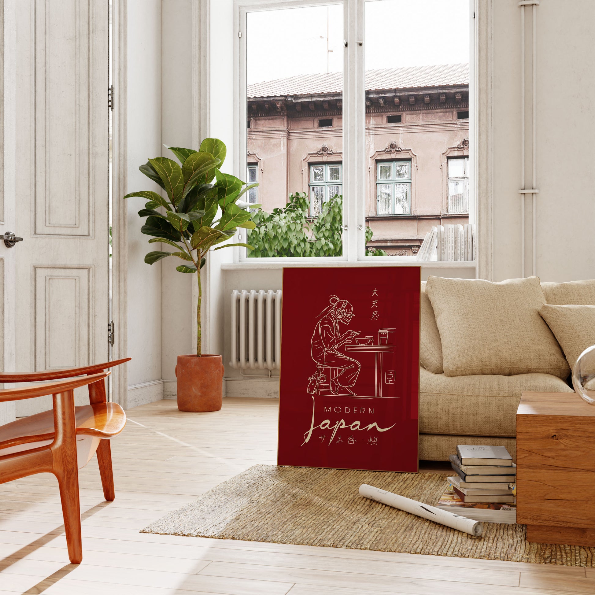 Duik in een gestileerde wereld van hedendaagse Japanse cultuur met deze opvallende lijntekening. Tegen een diepe karmozijnrode achtergrond zit een figuur met koptelefoon aan een minimalistisch tafeltje, waarbij traditionele samoerai-silhouetten versmelten met moderne stedelijke levensstijl. De elegante, crèmekleurige schets vangt de essentie van Japan's naadloze integratie van oude en hypermoderne esthetiek.