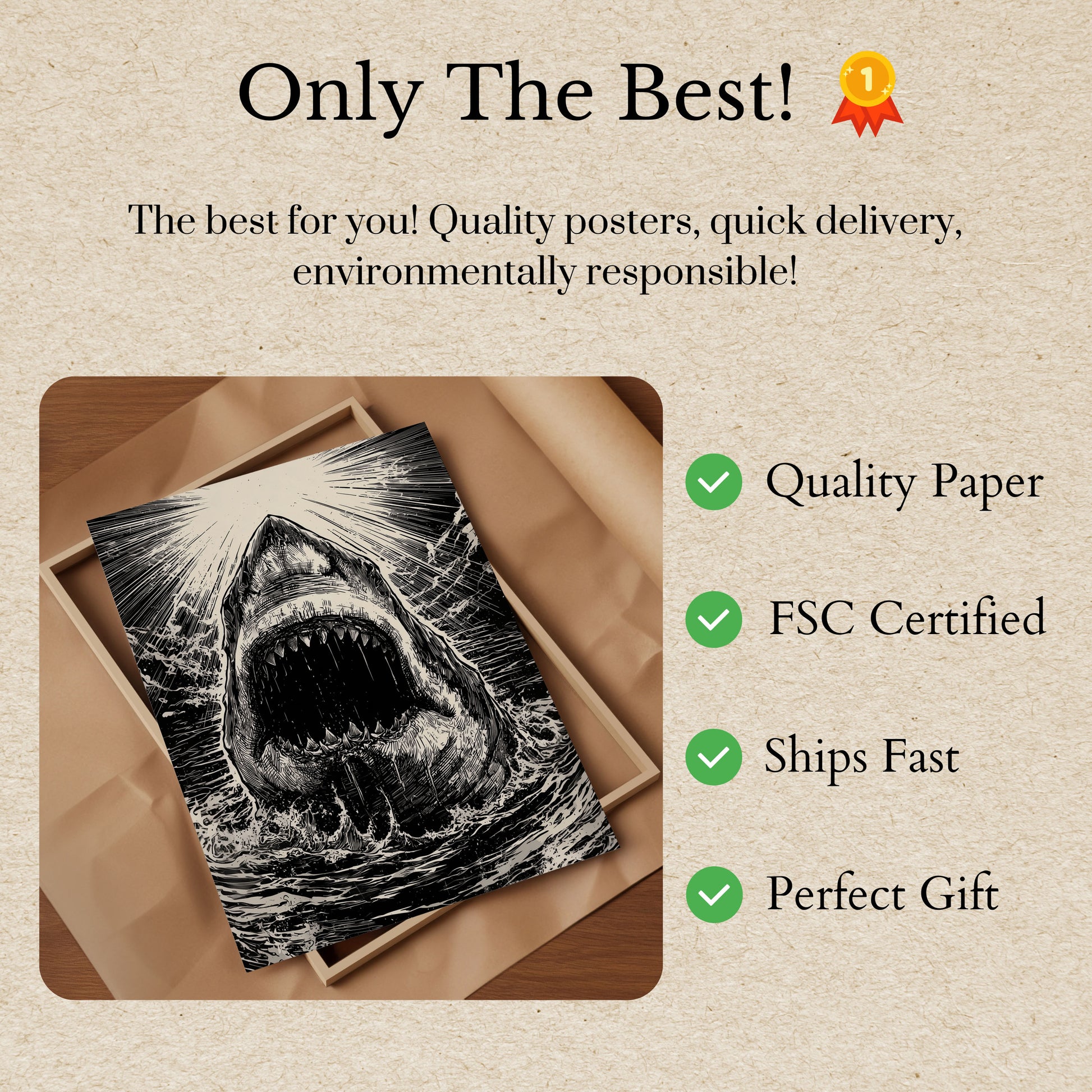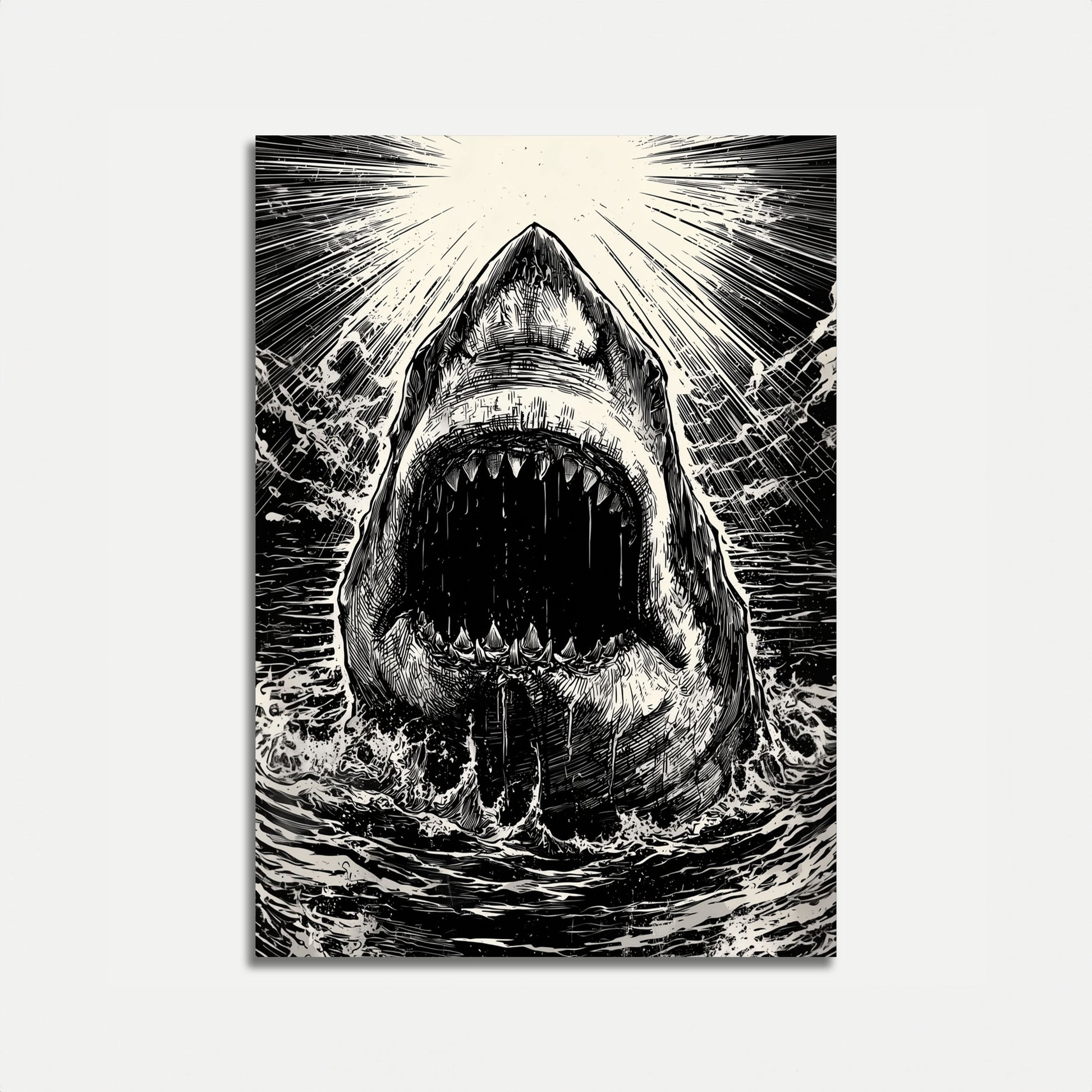 Duik in de intense wereld van marine terreur met deze opvallende zwart-witte haaienillustratie. De afbeelding vangt een grote witte haai op die oprijst uit woelige wateren, zijn enorme kaken wijd open, waarbij rijen messcherpe tanden zichtbaar zijn. Dramatische lichtstralen barsten los vanachter, wat een krachtige en viscerale weergave van oceaanpredatie creëert.