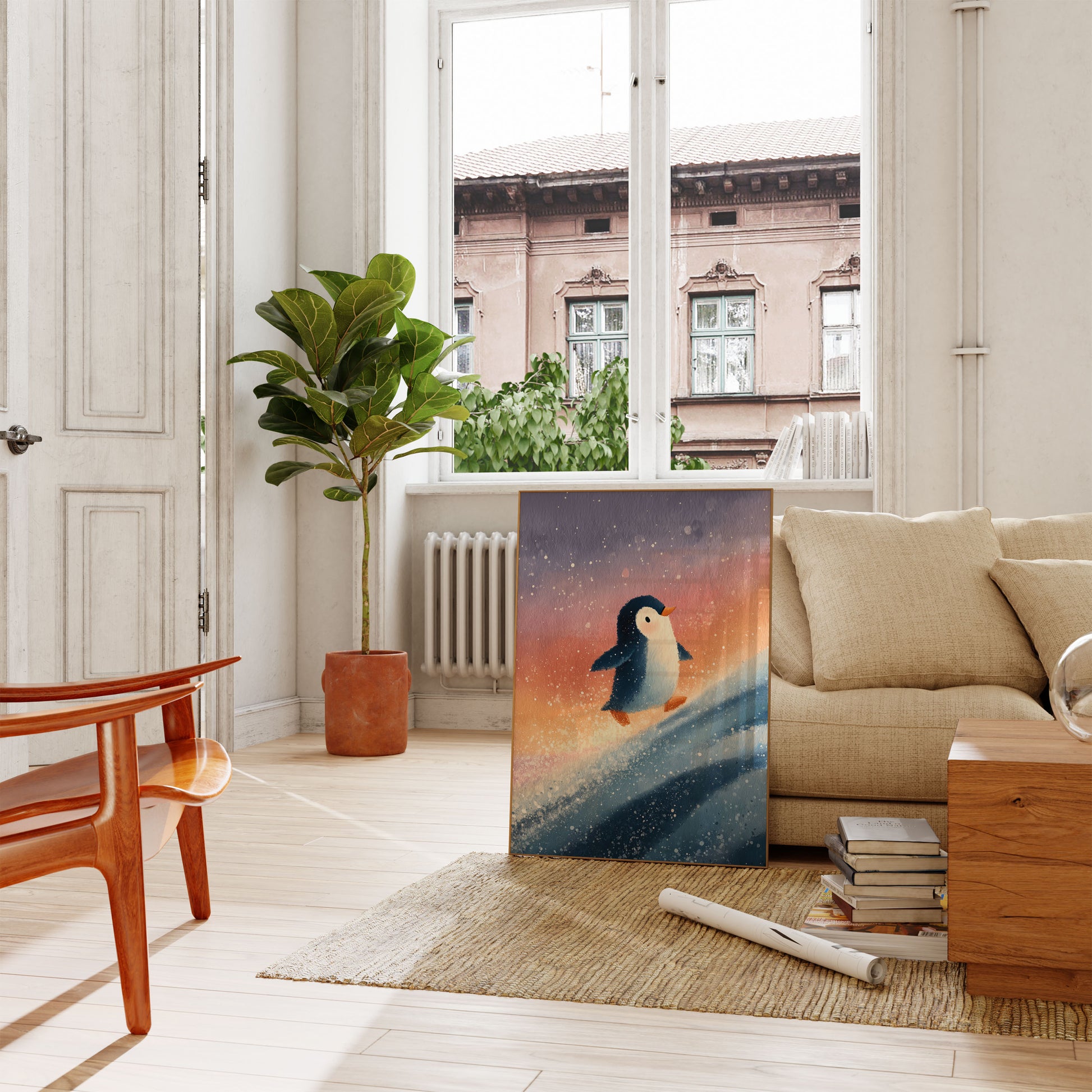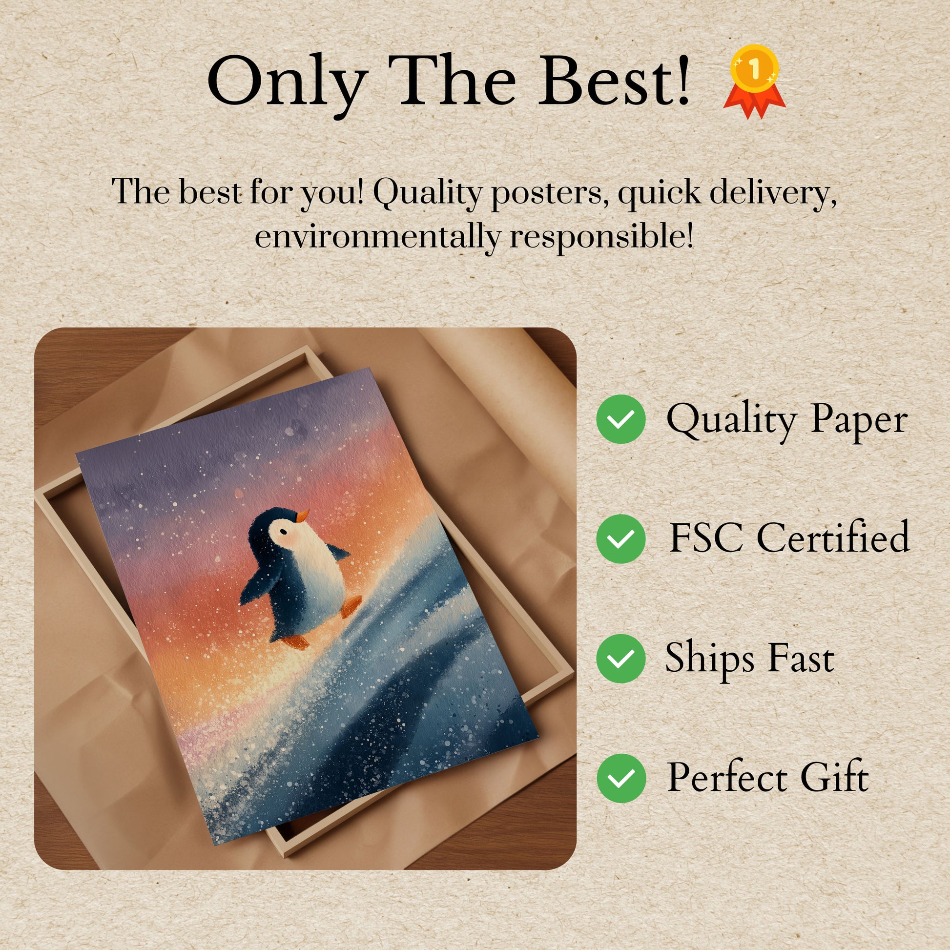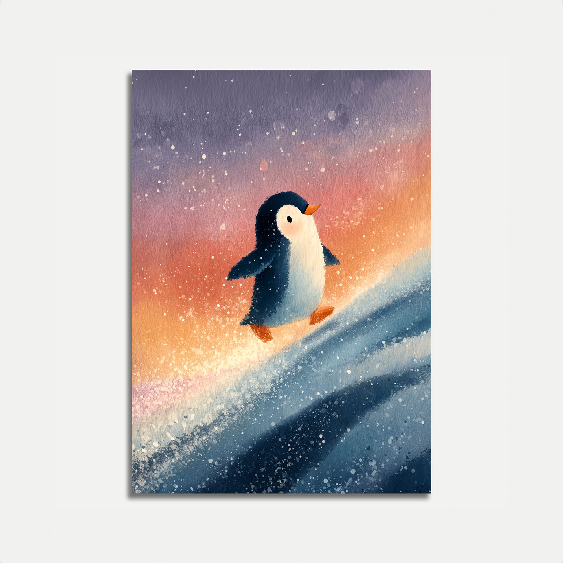 Een speelse en betoverende aquarelschildering van een pinguïn die door een magisch winterlandschap surft. Zachte pastelkleuren vervagen van diepblauw naar warm oranje, en creëren een dromerige sfeer vol fonkelende sneeuwvlokken. De schattige pinguïn glijdt met onverwachte elegantie, en vangt de vreugde en speelsheid van een winteravontuur.