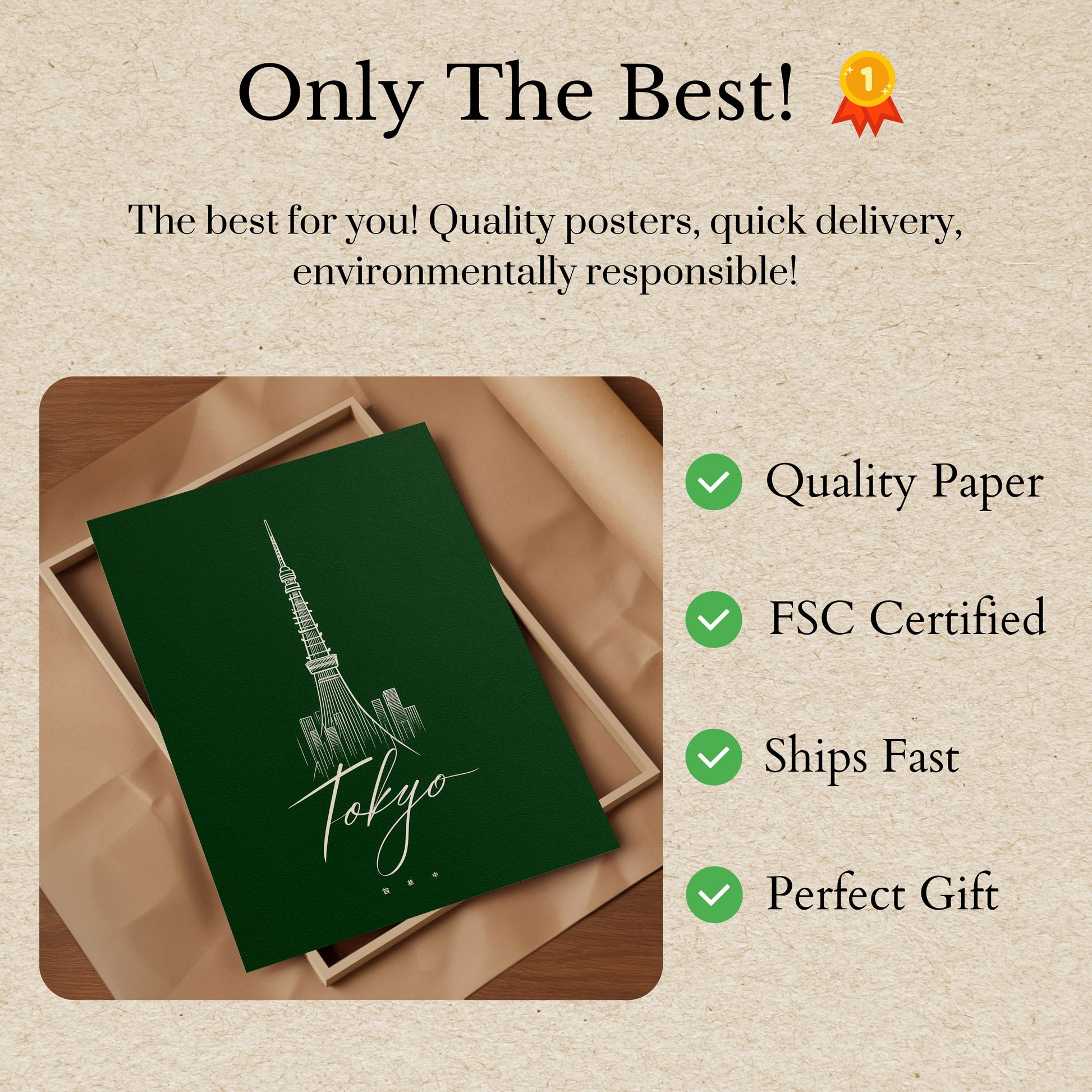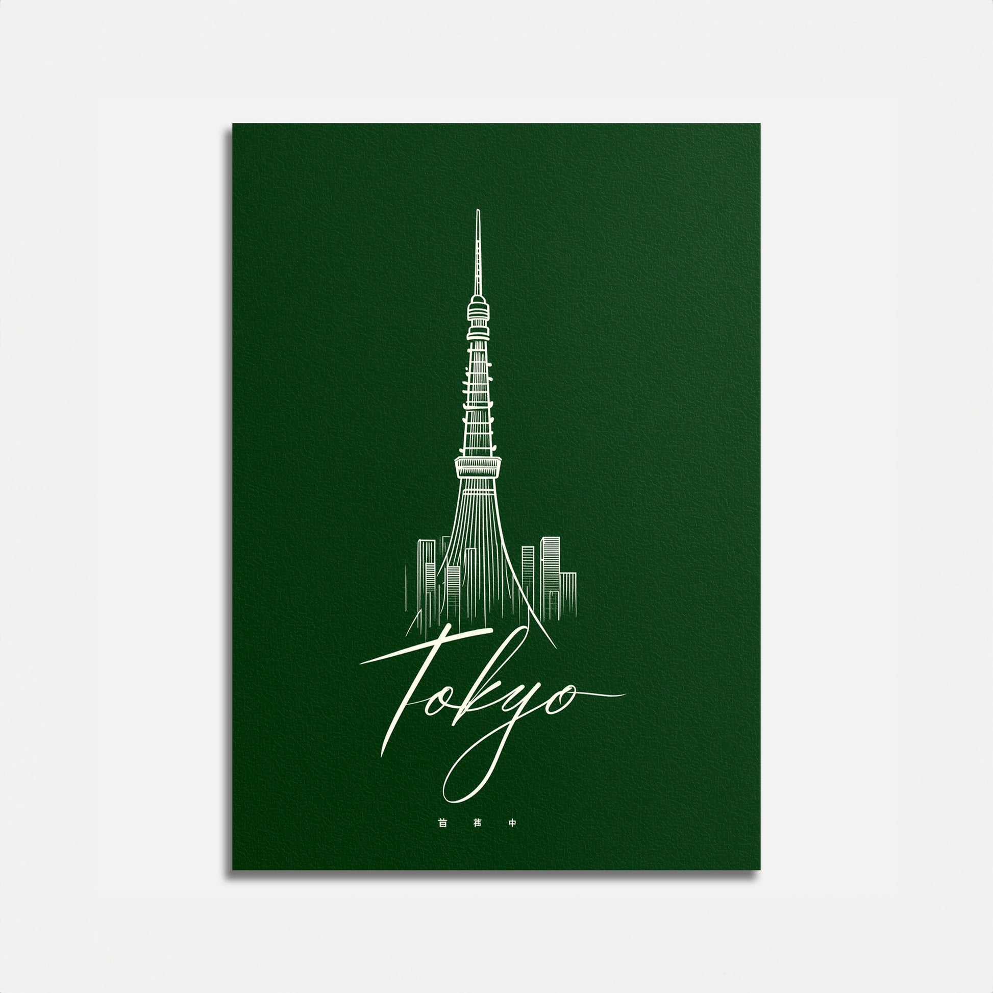 Ontdek de elegante essentie van Tokio, gevangen in deze verbluffende minimalistische illustratie. Tegen een rijke smaragdgroene achtergrond toont de poster de slanke, met lijnen getekende Tokyo Skytree die majestueus oprijst boven een gestileerde stadsskyline, een verfijnde en moderne eerbetoon aan Japan's meest iconische metropool. De delicate witte lijntekening steekt prachtig af tegen het diepe groen en biedt een eigentijdse, verfijnde visuele ervaring die elke binnenruimte verheft.