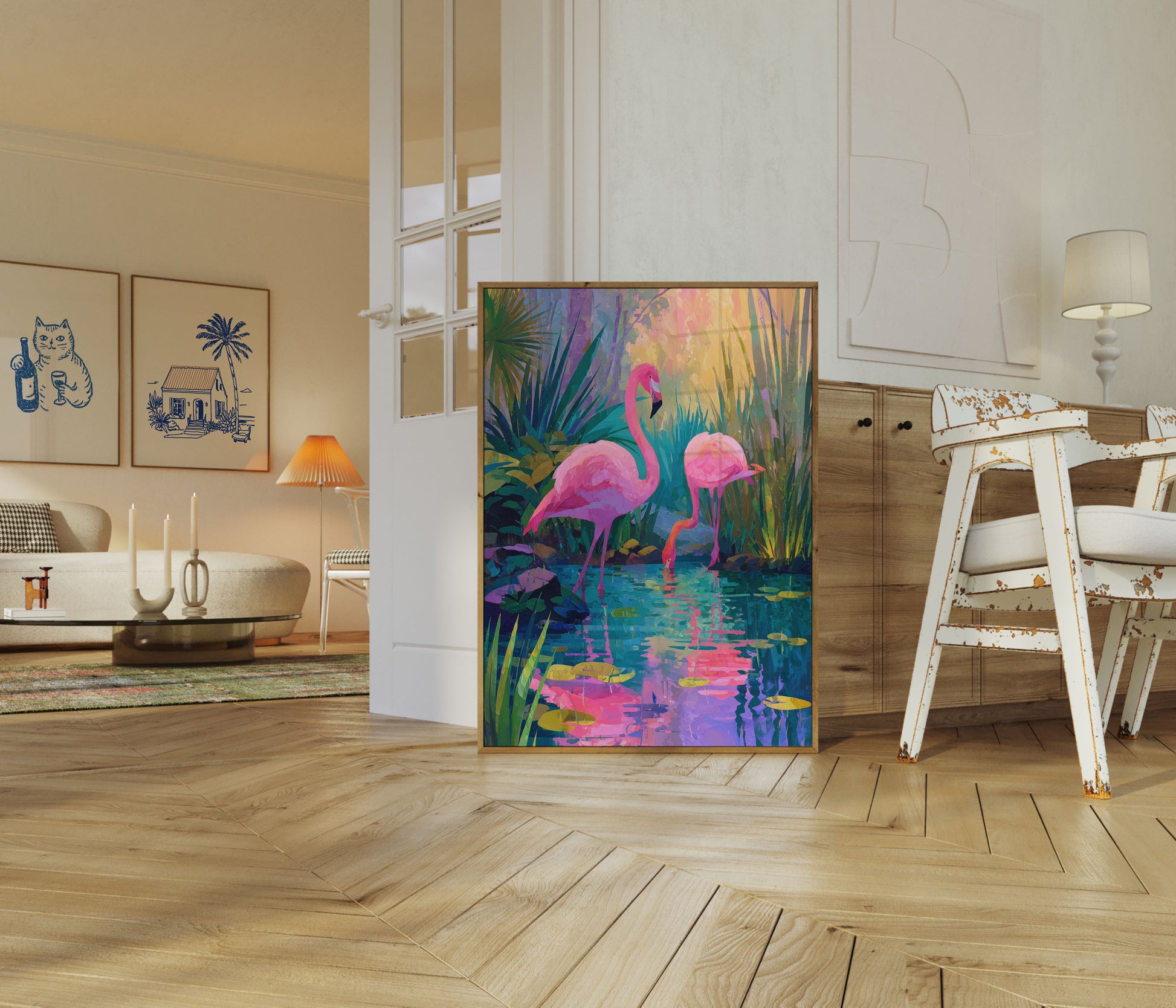 Stap binnen in een weelderig tropisch droomlandschap waar twee prachtige roze flamingo's door een betoverende turquoise poel waden, omringd door exotische vegetatie. Dit levendige kunstwerk vangt de elegante lijnen en briljante veren van deze iconische vogels op tegen een achtergrond van smaragdgroenen, zachte paars en gouden gelen. Het schilderij verandert een natuurlijke scène in een caleidoscoop van kleur en beweging, en nodigt kijkers uit in een serene maar dynamische tropische wereld.