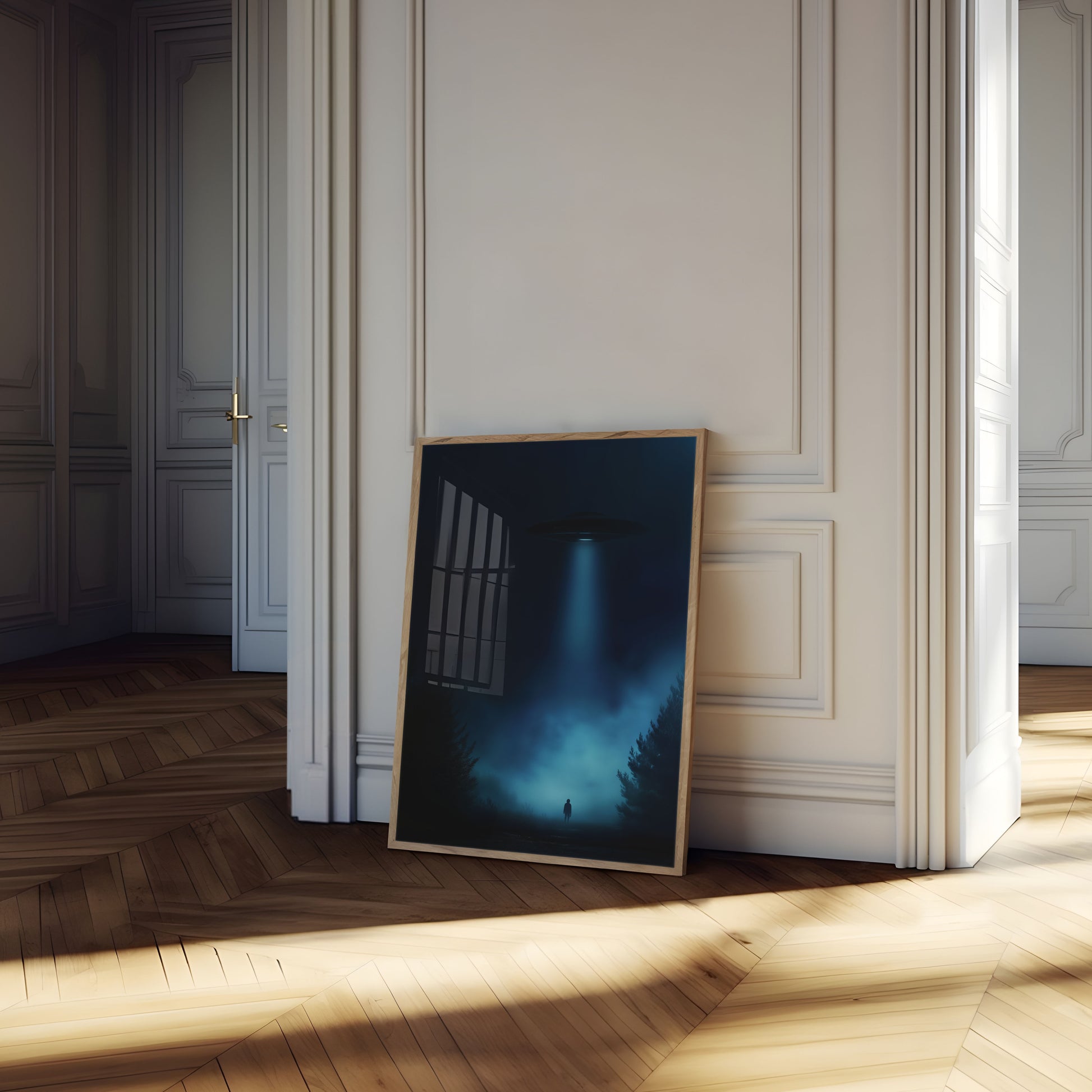 Een mysterieuze en spookachtige scène ontvouwt zich terwijl een eenzame figuur bewegingloos staat onder een gloeiende UFO, omringd door donkere dennenbomen. Het etherische blauwe licht baadt het mistige bos, waardoor een sfeer van bovennatuurlijke intrige en ruggengraat-kriebelige spanning ontstaat. Dit betoverende beeld vangt het moment van eerste contact vast, waar het onbekende de bekende ontmoet in een adembenemende vertoning van kosmische verwondering.