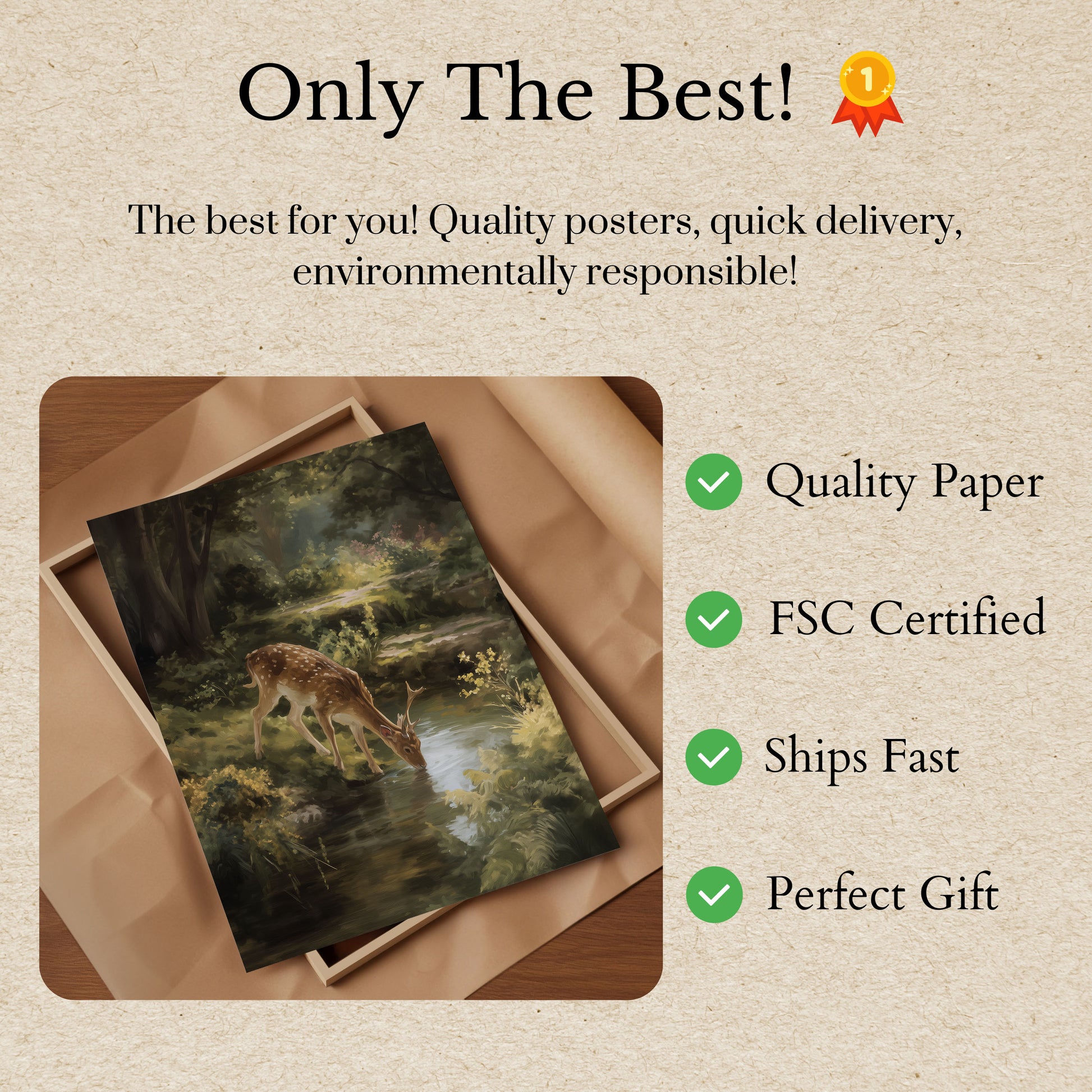 Deze serene bosscène vangt een gracieux hert dat pauzert bij een zacht stroompje, omgeven door weelderige bosvegetatie en gevlekt zonlicht. De warme, goudgele tinten en zachte penseelstreken creëren een vredige, natuurlijke sfeer die de rust van de wildernis in uw huis brengt. De delicate balans tussen het gedetailleerde hert en de dromerige, impressionistische bosachtergrond maakt dit een boeiend kunstwerk voor natuurliefhebbers en wildlifefans.