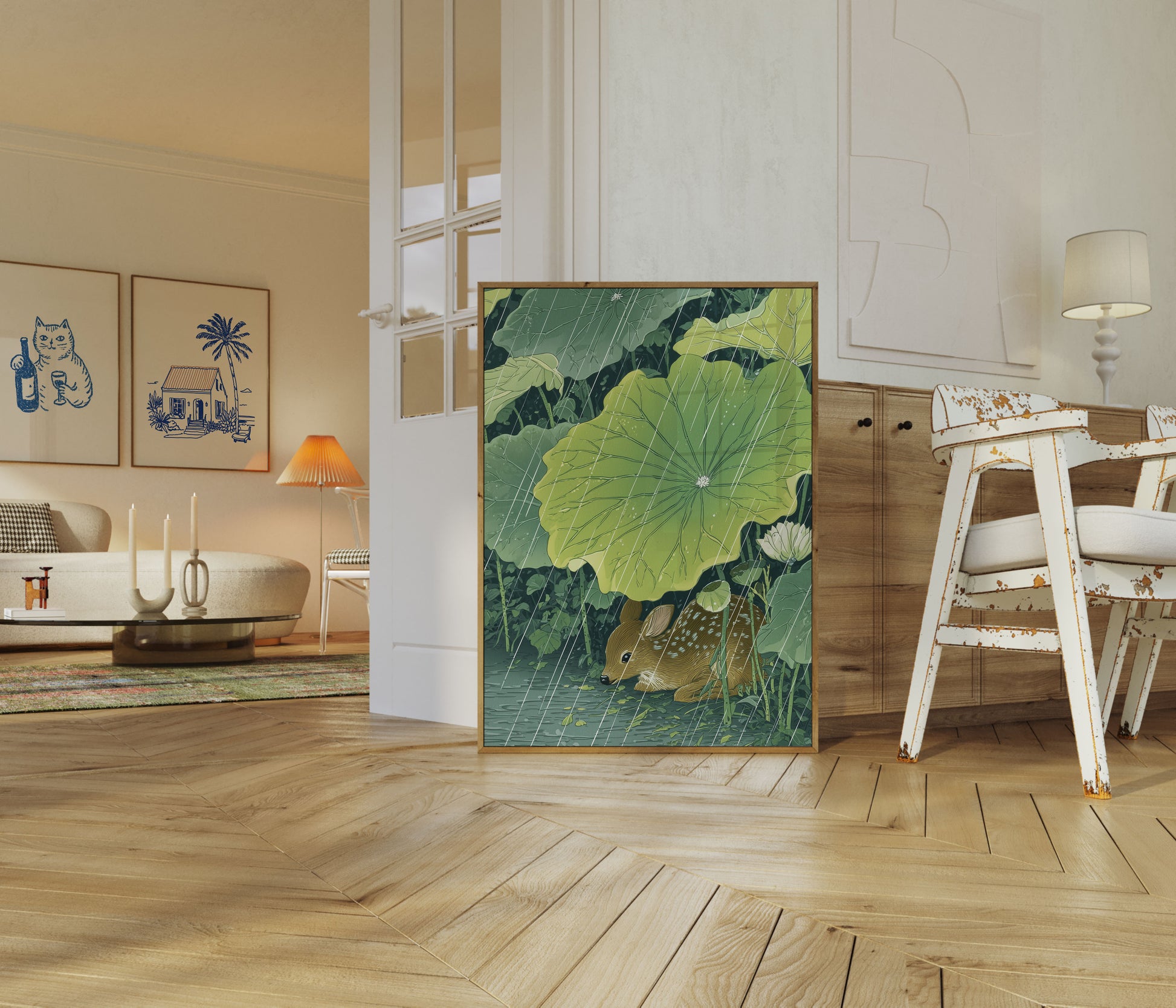 Deze serene illustratie vangt een zacht moment van natuurlijke harmonie, waarbij een gevlekte hert beschutting zoekt onder overgrote waterleliebladen tijdens een zachte regen. Het zachte, gedempte kleurenpalet van saliegroen en warme gelen creëert een kalme, vredige sfeer die je trekt in deze intieme bosscène. Regenstrepen trekken over de compositie terwijl delicate waterlelies in de buurt bloeien, en de ingewikkelde adertjes van de bladeren tonen de zorgvuldige aandacht van de kunstenaar voor botanische schoonheid en natuurlijke verwondering.