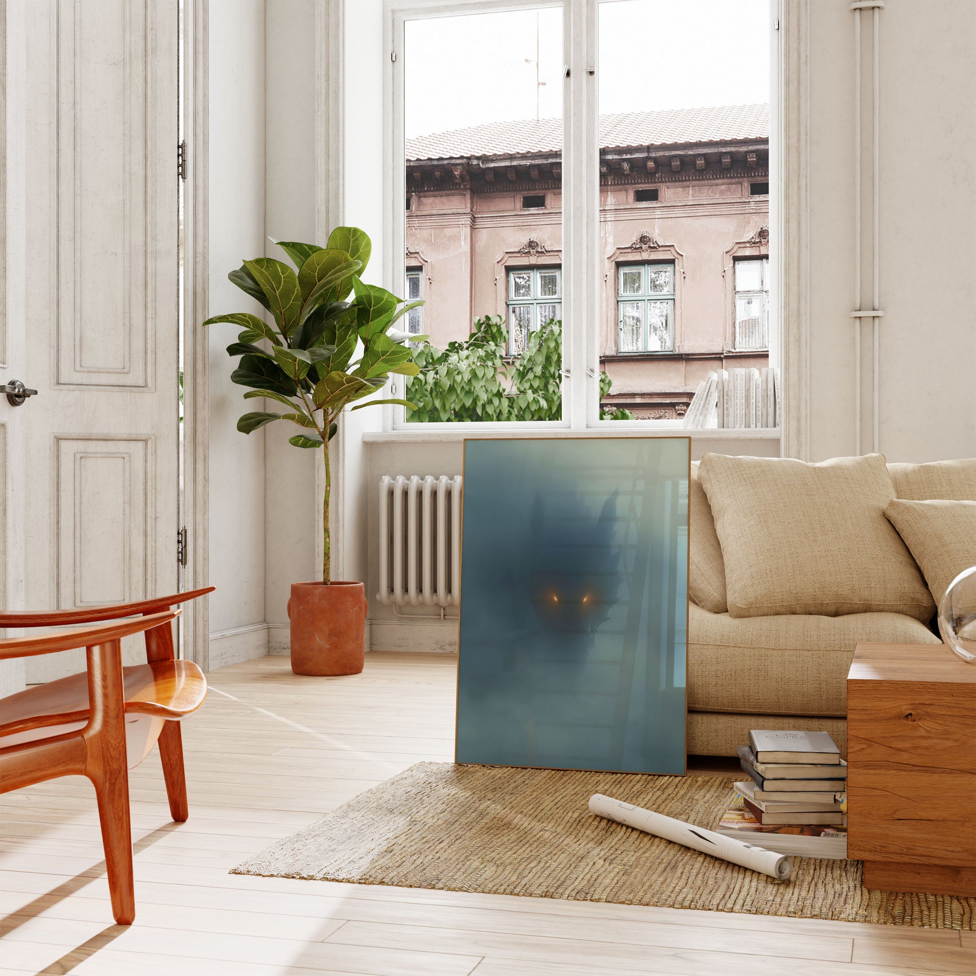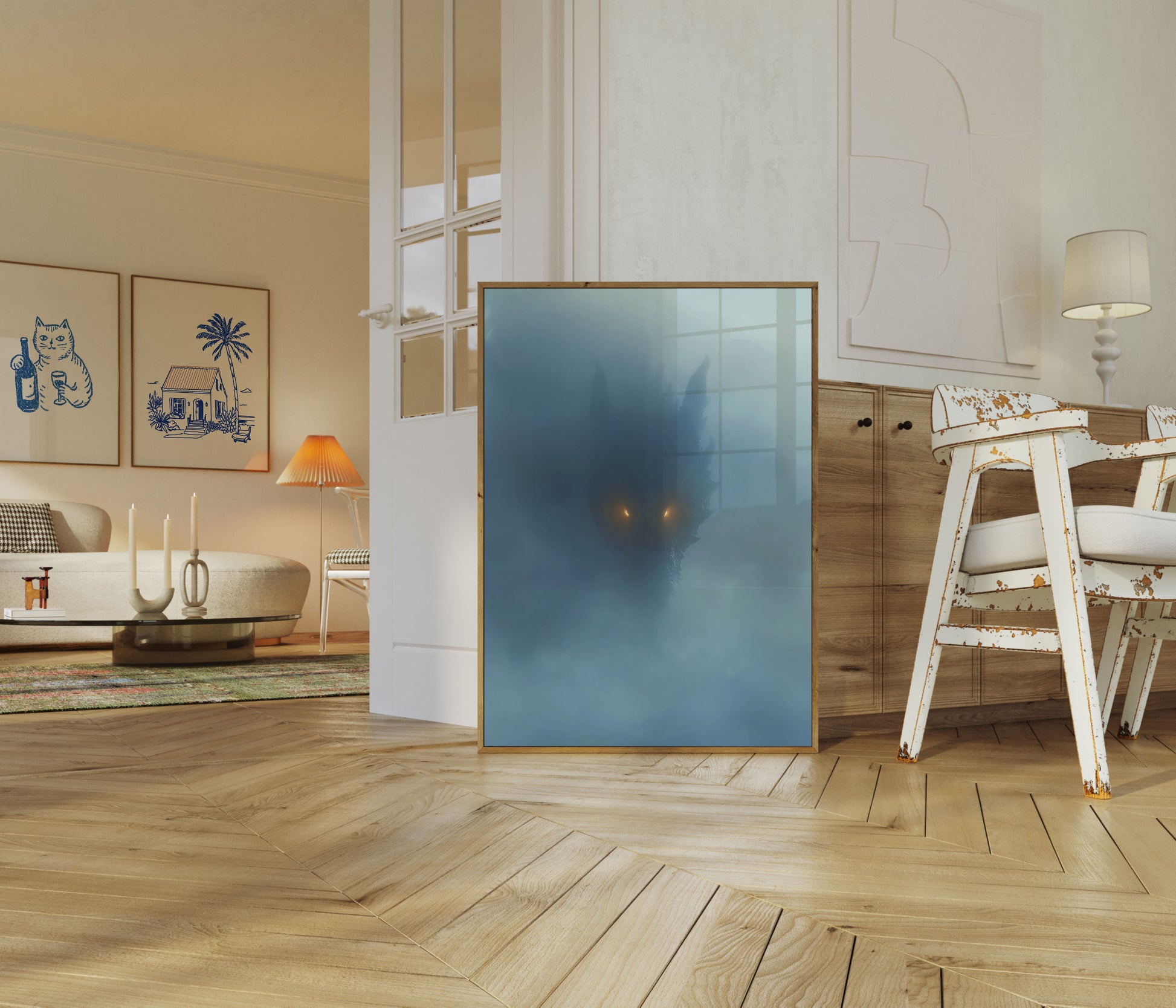 Duik onder in een betoverend rijk van blauwgrijze mist waar een mysterieus wezen verschijnt - zijn doorborende gouden ogen branden door de nevelige sluier heen. Deze adembenemende digitale kunst vangt een bovennatuurlijke silhouet met rafelige, spookachtige randen, waardoor een sfeer van bovennatuurlijke intrigue en oerinstinctieve mystiek ontstaat. De zachte gradiënt van koele blauwtinten en de doordringende blik van het wezen trekken de kijker mee naar een wereld tussen werkelijkheid en verbeelding.