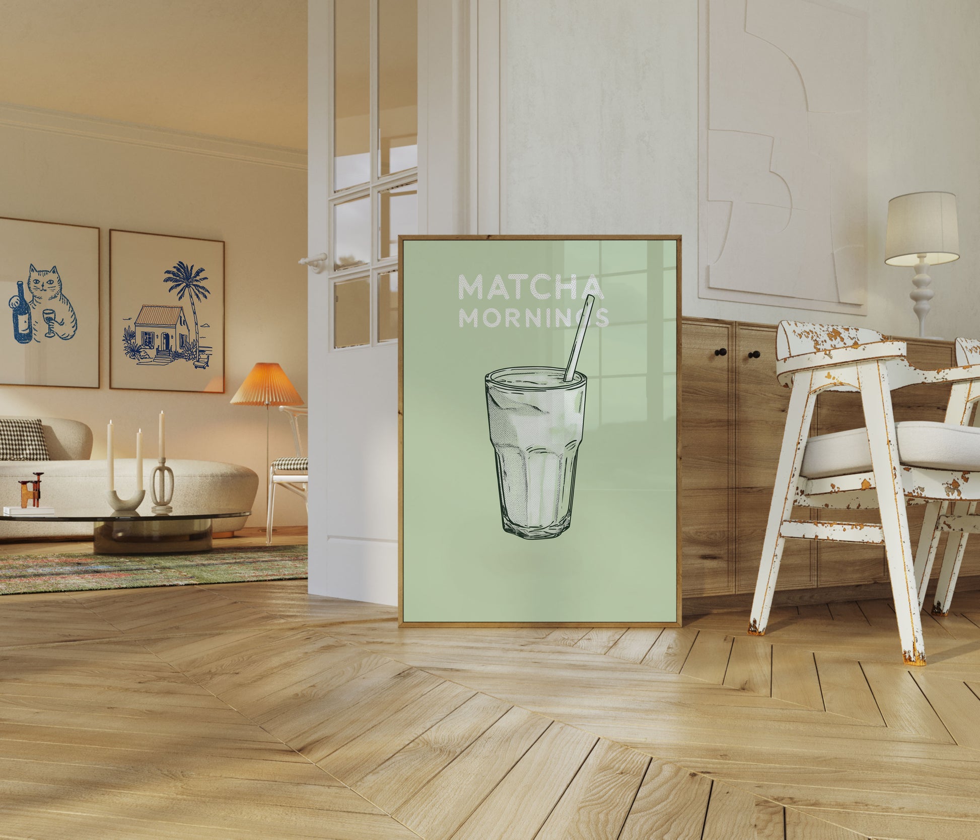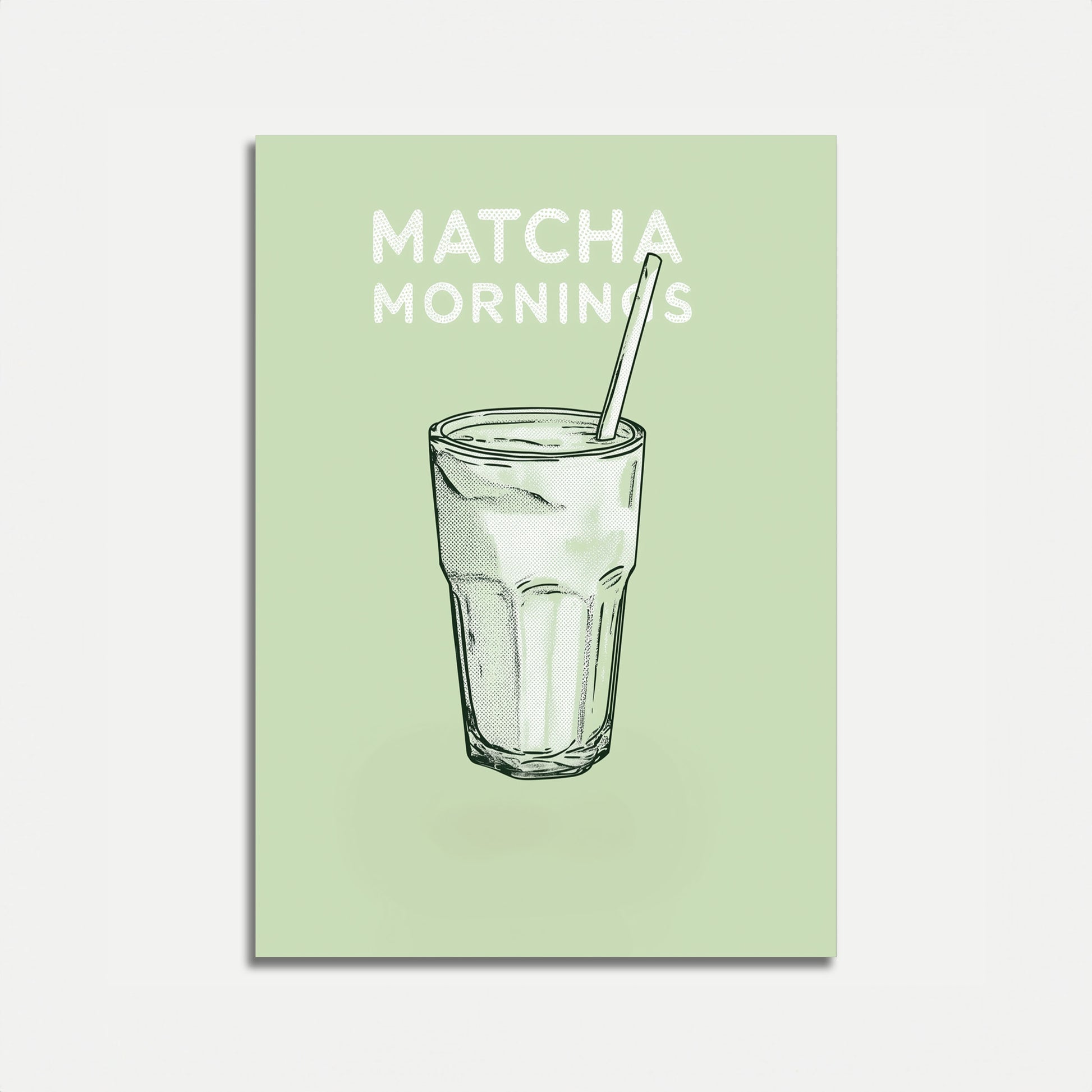 Proef de rustige groene sfeer van deze minimalistische matcha-illustratie die de essentie van een vredige ochtendgewoonte perfect weergeeft. Het vintage-stijl glas met een eenvoudige rietje steekt prachtig af tegen een zachte saliegroen achtergrond, en nodigt de kijker uit om de kalmerende en herstellende start van de dag met een verfrissende matchadrank te verbeelden. Deze artistieke print viert de zenachtige rust van ochtendwellness en de Japanse theedcultuur.