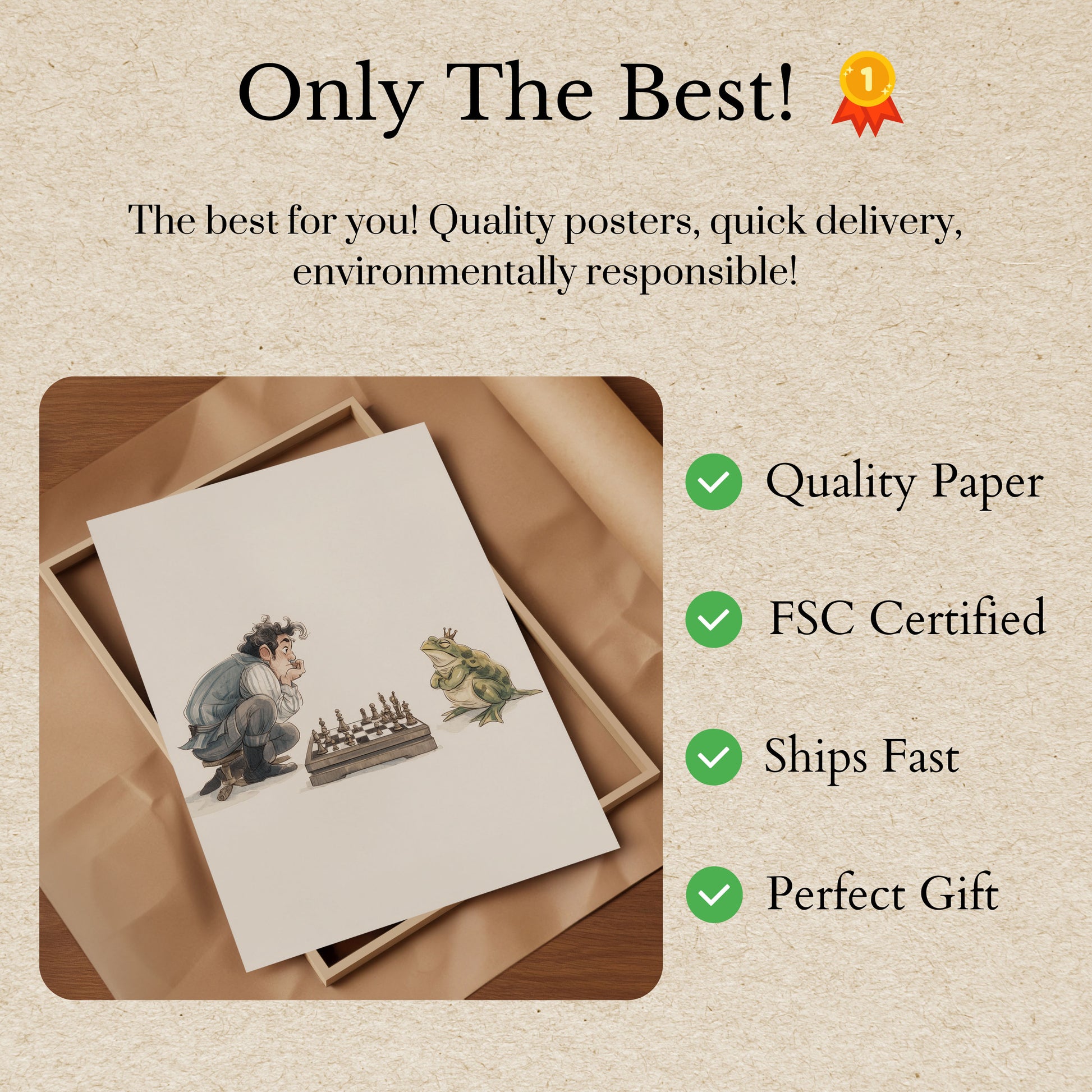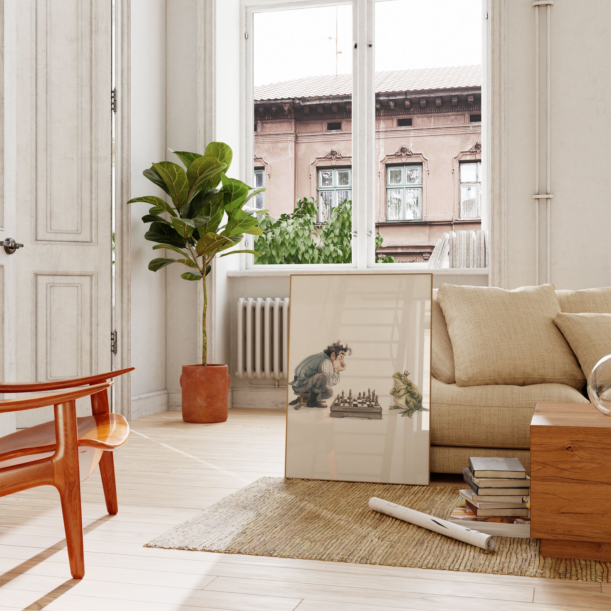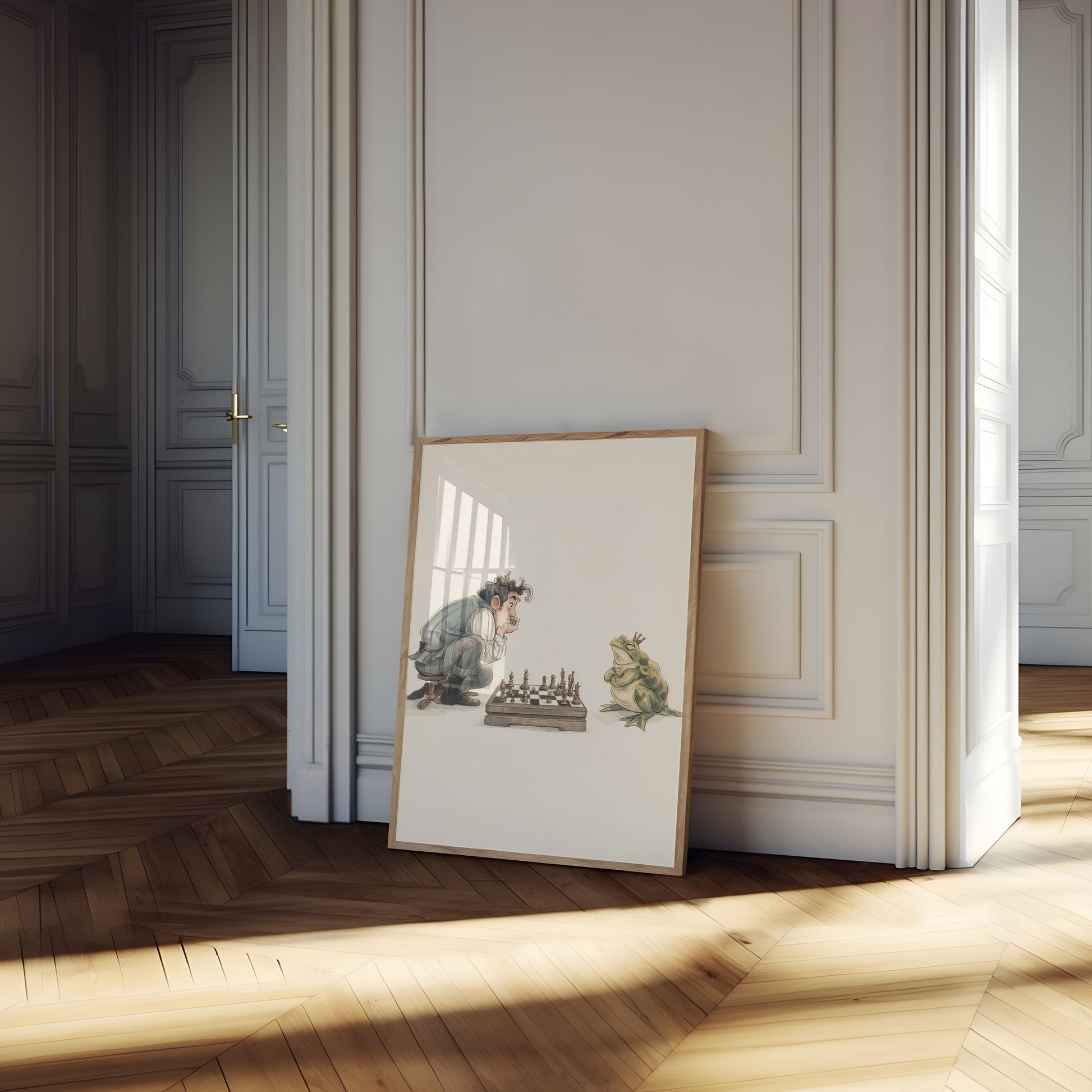 Duik in een heerlijke wereld van strategische fantasie met deze bekoorlijke illustratie waarop een nadenkende speler het opneemt tegen een gekroonde kikker op een klassiek schaakbord. De zachte aquarelkleuren en expressieve karakters creëren een speelse vertelling die verbeelding en intellectuele uitdaging samenbrengt, en nodigen de kijker uit in een magisch moment van onverwachte competitie.
