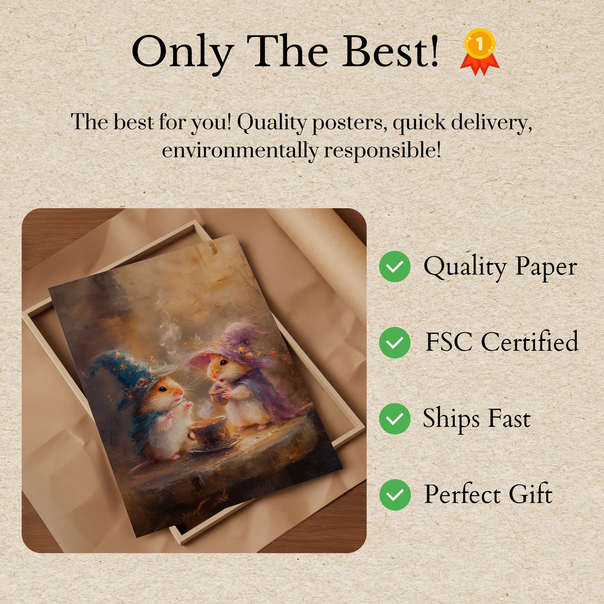 Stap binnen in een fantastische wereld waar schattige hamsters betoverende tovenaarspetten dragen en samen genieten van een gezellig moment met dampende thee. Deze dromerige kunst vangt twee pluizige metgezellen in rijke blauwe en paarse gewaden, omringd door fonkelende gouden sterren en zachte, etherische rook. Het schilderij combineert speelsheid en warmte, en nodigt de kijker uit in een betoverend mininatuurrijk van magische vriendschap.