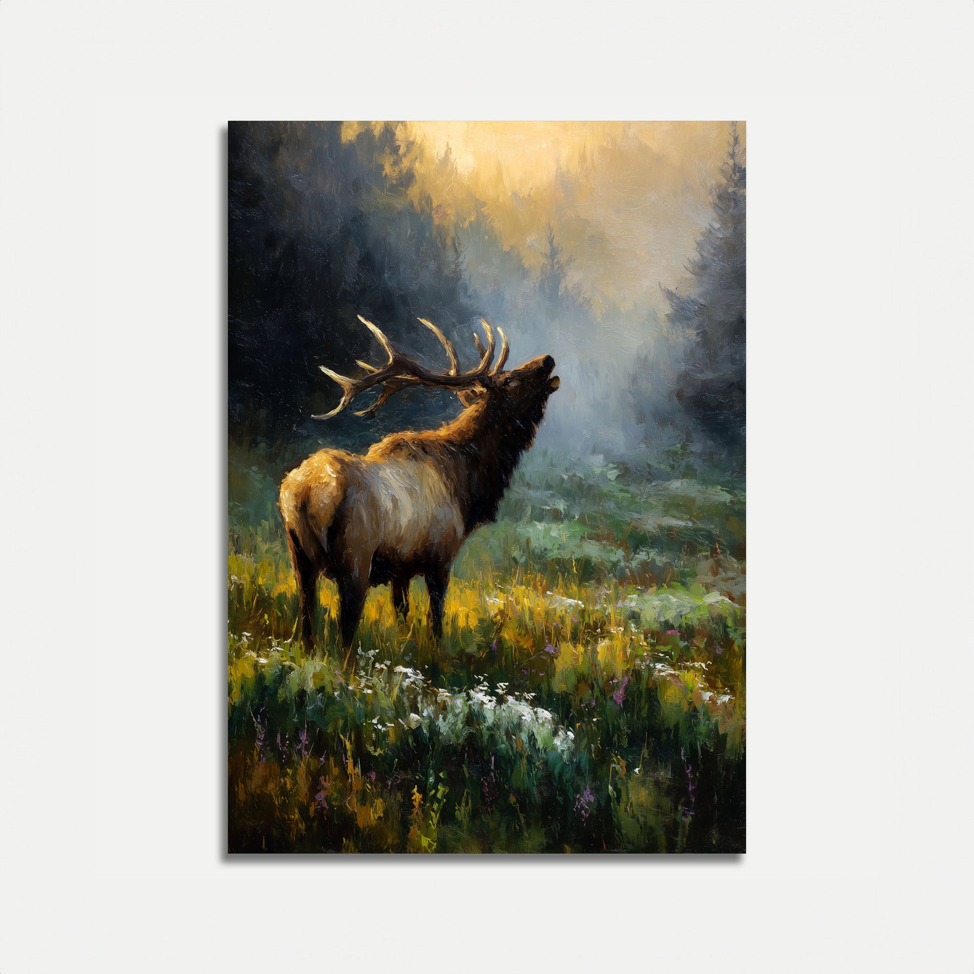 Dit prachtige olieverfschilderij vangt een magnifieke elanden met indrukwekkende geweiën af die over een mistig berglandschap roepen. Het warme gouden licht filtert door imposante dennenbossen, waardoor een dramatische en sfeervolle wildernis ontstaat. De elanden staat trots in een levendige bloemenweide, terwijl zachte mist opstijgt uit de verre bomen, wat de vredige schoonheid van ongetemde natuur en de grandeur van alpenine wildernis oproept.