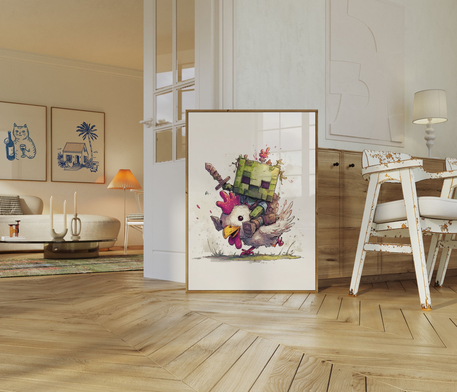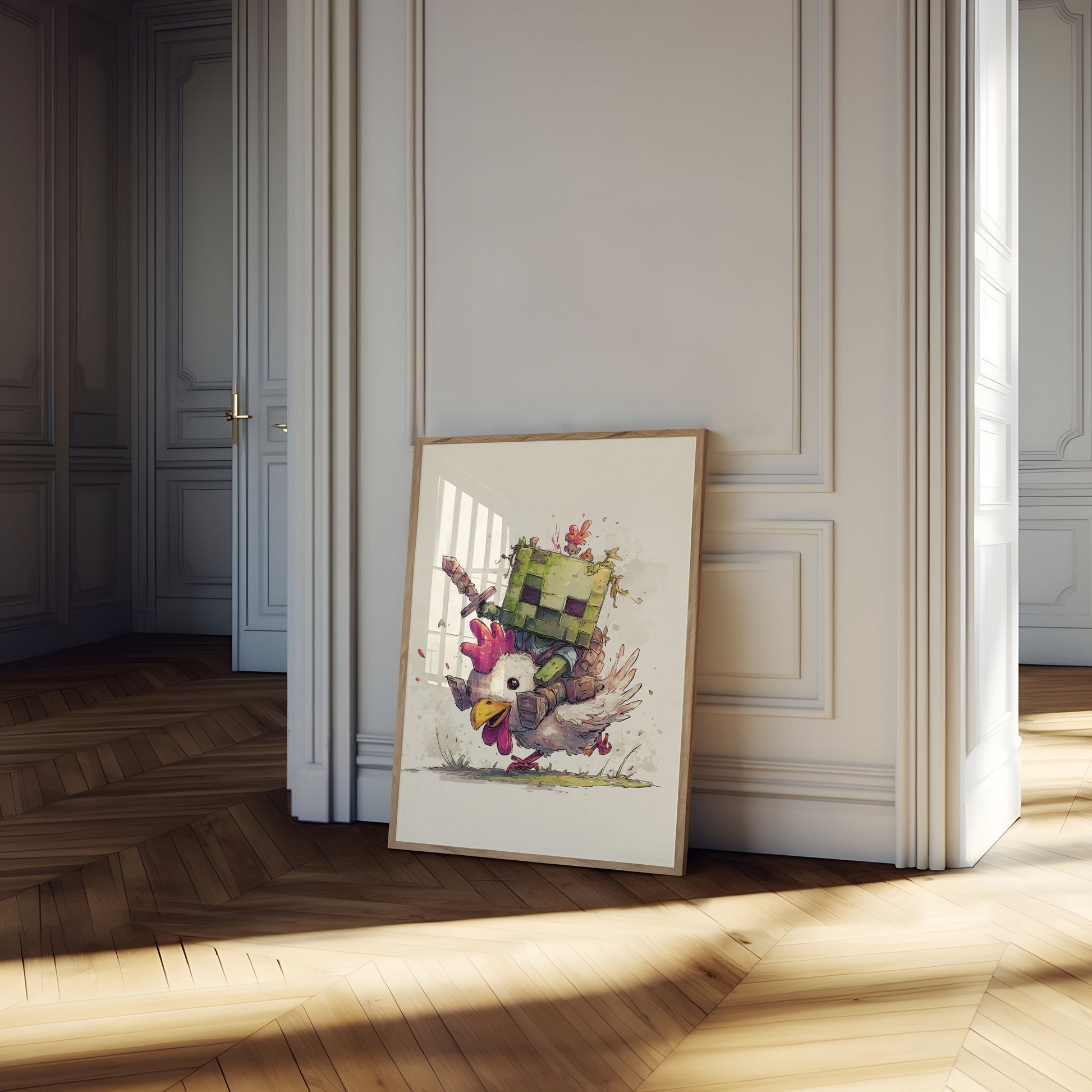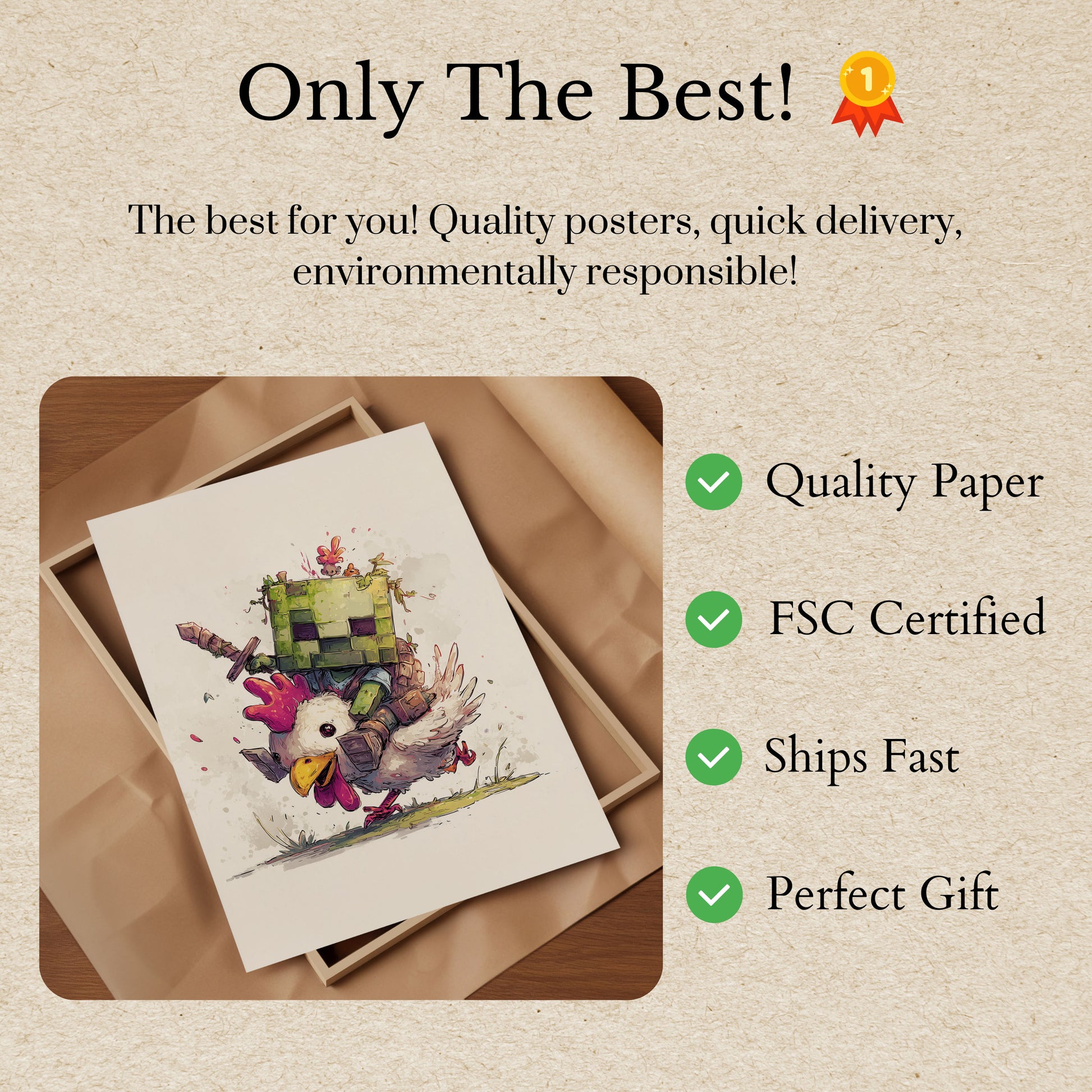 Duik in een gekke gamewereld waar een gepixelde krijger op een heldhaftige kip een avontuur tegemoet rijdt! Deze levendige illustratie combineert Minecraft's herkenbare blokjessstijl met een speelse karakterontwerp, met een kubushoofdige strijder bovenop een geveerde metgezel. Ontploft van speelse kleuren en dynamische energie, verorvert deze artwork de verbeeldingskracht van gamecreativiteit.