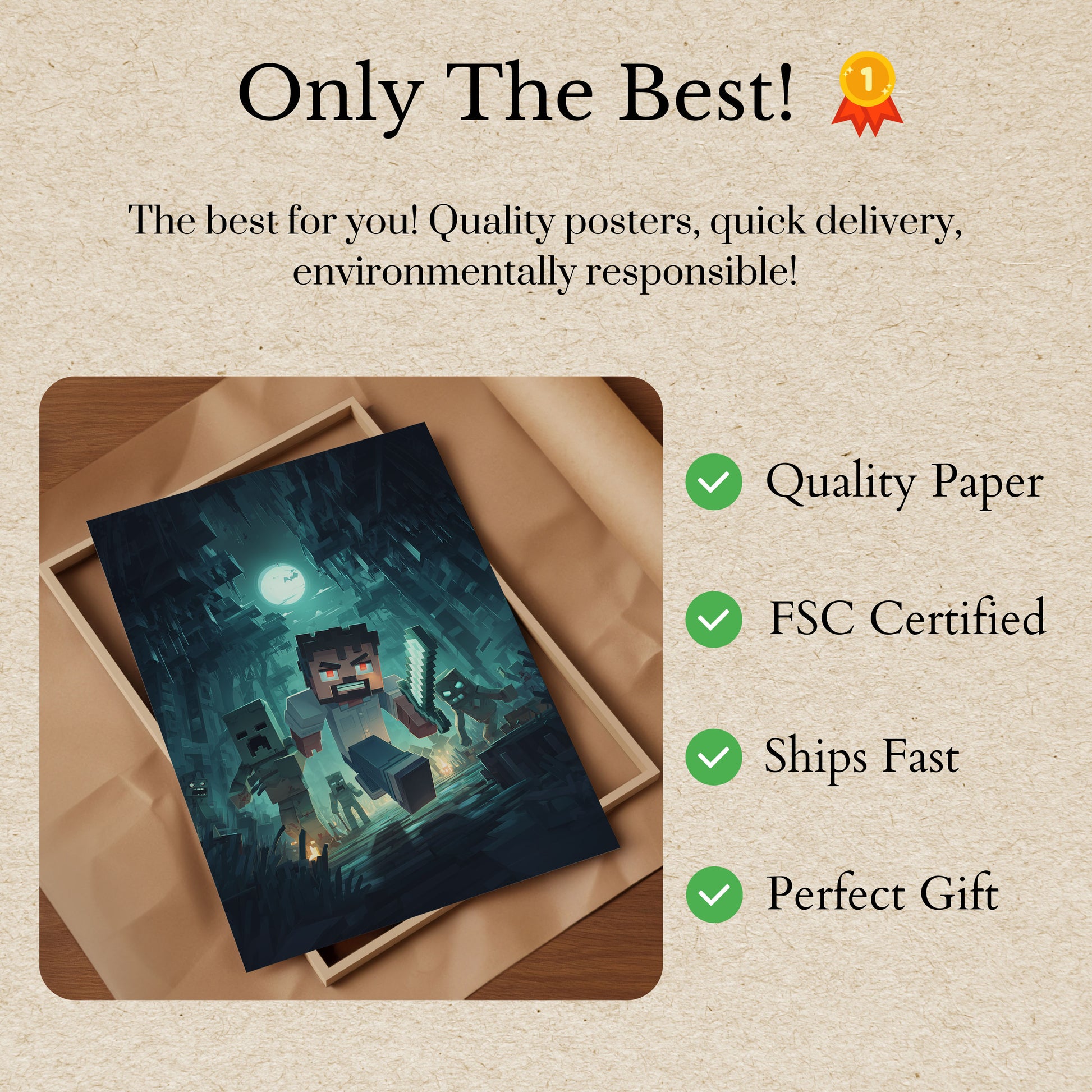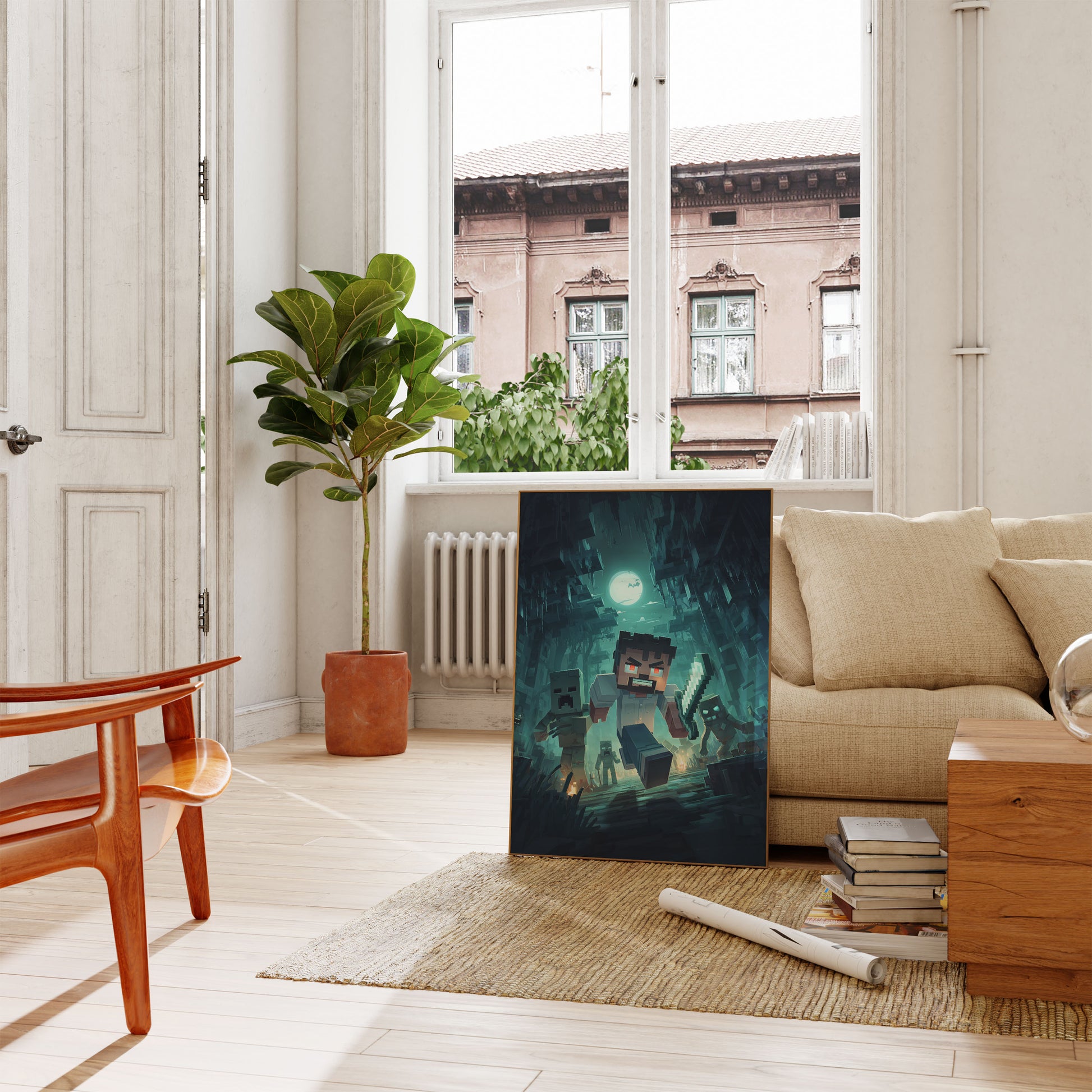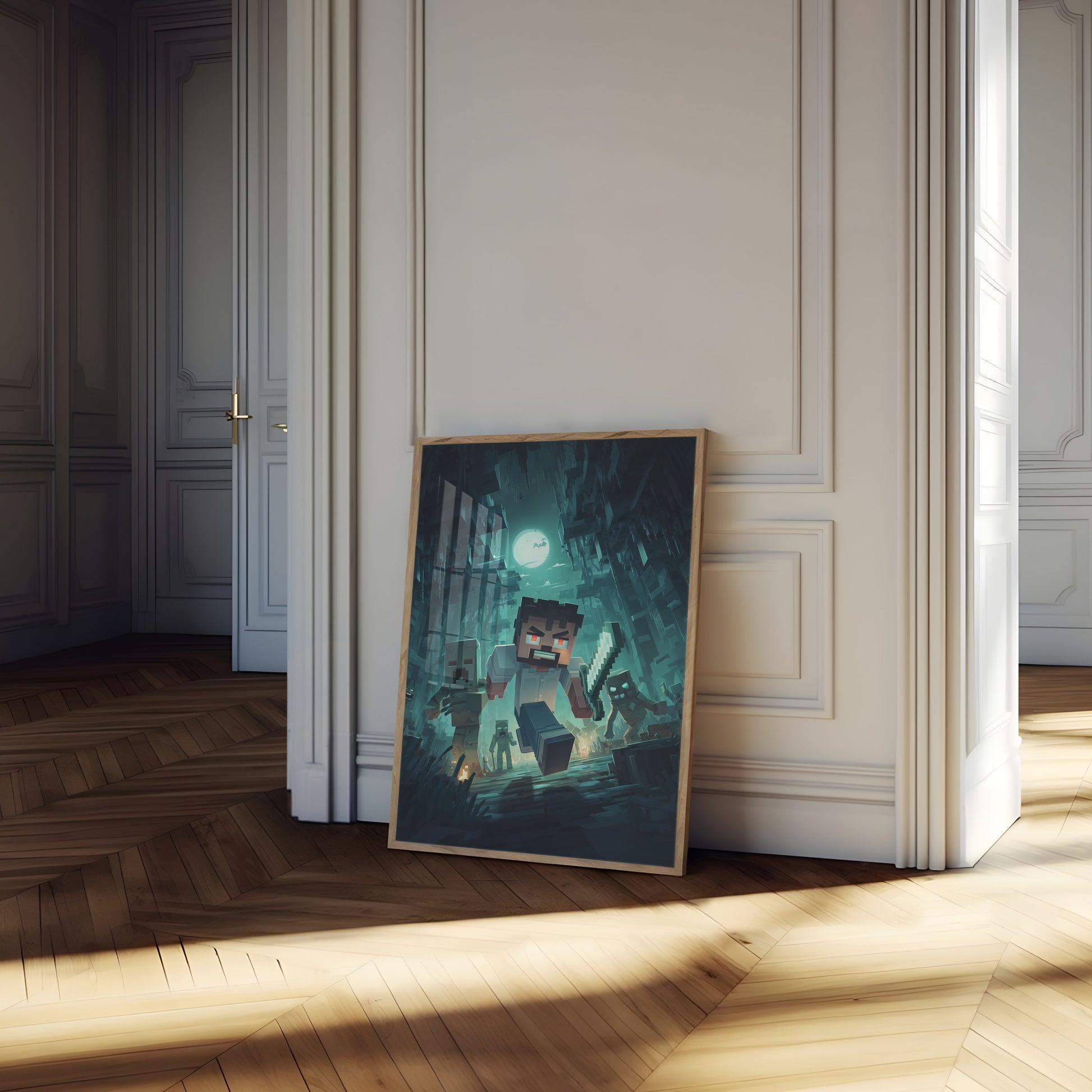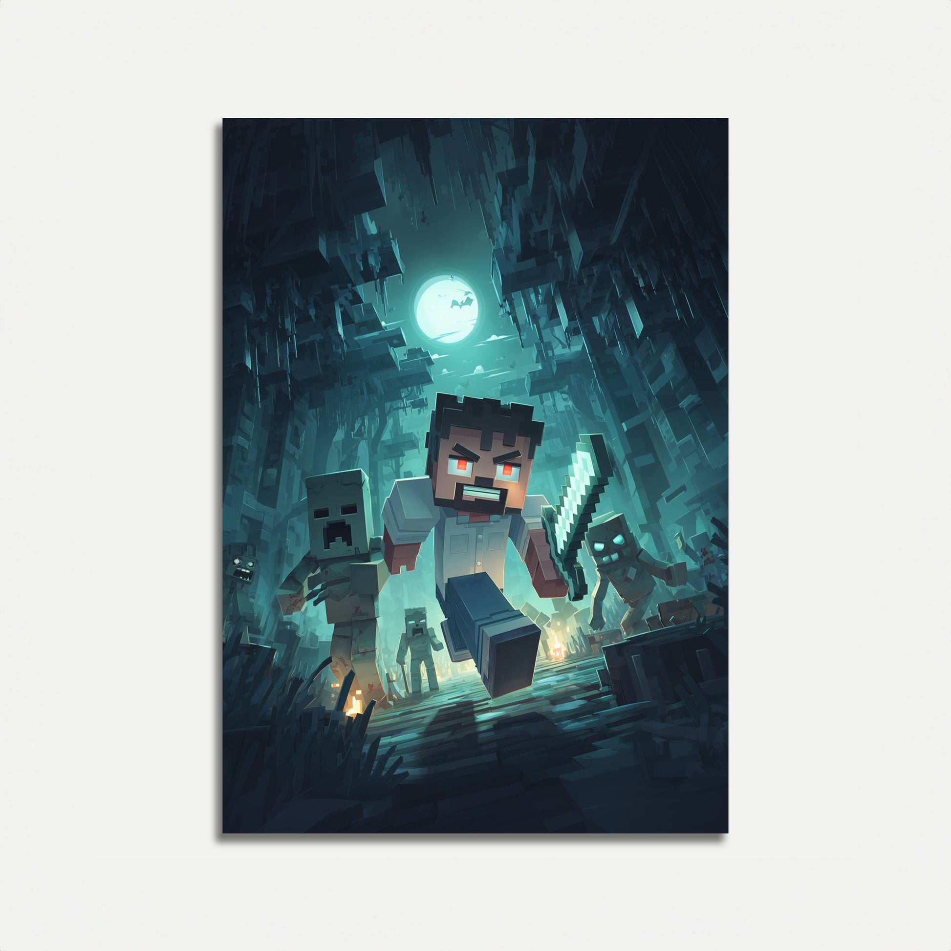 Duik in de gepixelde wereld van pure overleving met deze adembenemende Minecraft-poster die het zenuwslopende moment vangt van een eenzame held die oog in oog staat met een horde bedreigende mobs. Gedrenkt in het mystieke teal-groene licht van een lumineuze maan, staat de centrale held onverschrokken overeind, gewapend met een diamanten zwaard tegen de naderende zombies en skeletten. Het sfeervolle ontwerp transformeert de blokkerige Minecraft-esthetiek in een dramatische, cinematische ervaring die zowel gamers als kunstliefhebbers zal aanspreken.