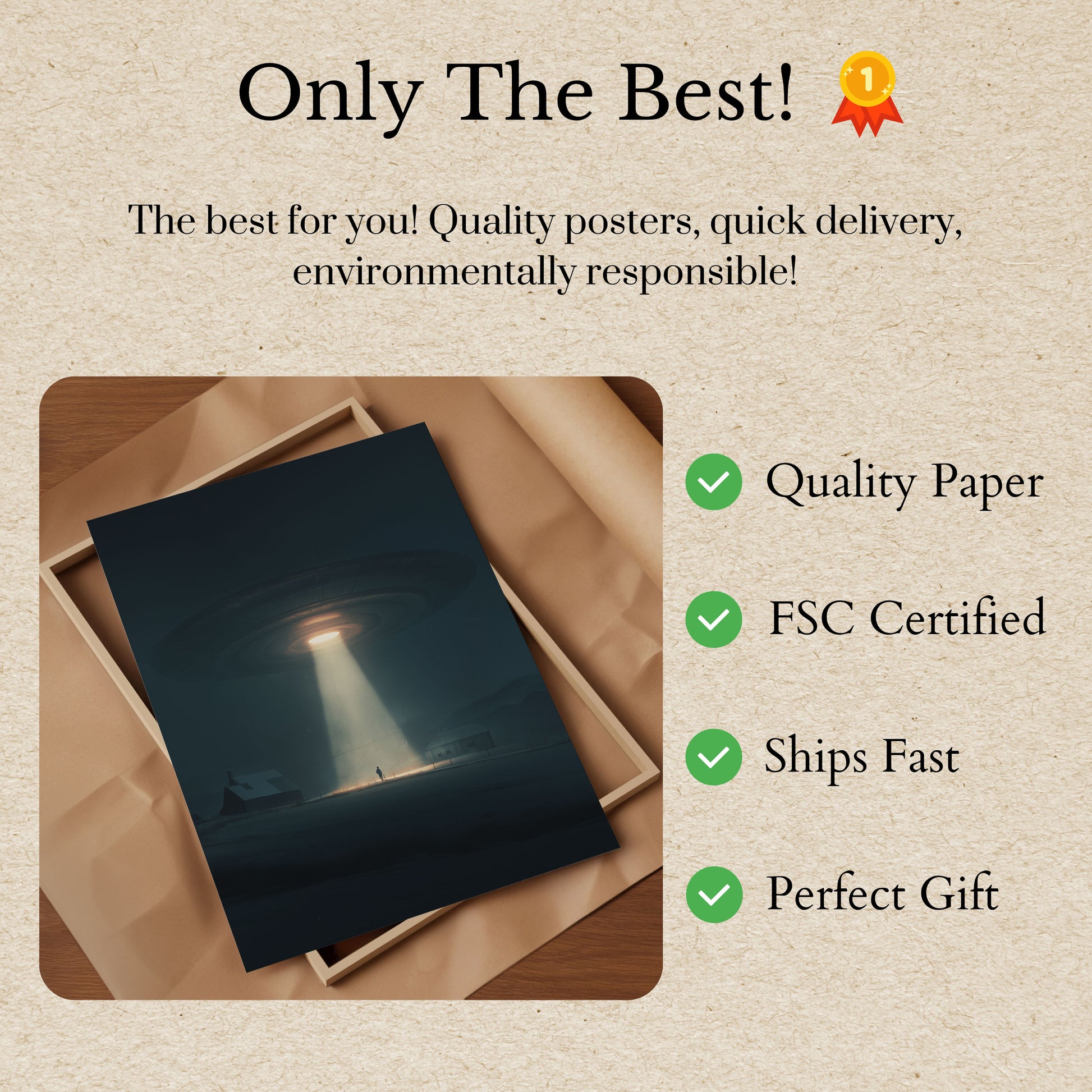 Een spookachtig nachtelijk tafereel vangt een eenzame figuur in een bovenaards lichtbundel van een reusachtige UFO die boven een rustig plattelandslandschap zweeft. De onheilspellende groen-blauwe atmosfeer en het scherpe contrast tussen de donkere omgeving en de heldere lichtbundel creëren een gevoel van spanning en verwondering, en roepen klassieke sciencefiction-beelden op van buitenaardse bezoeking.