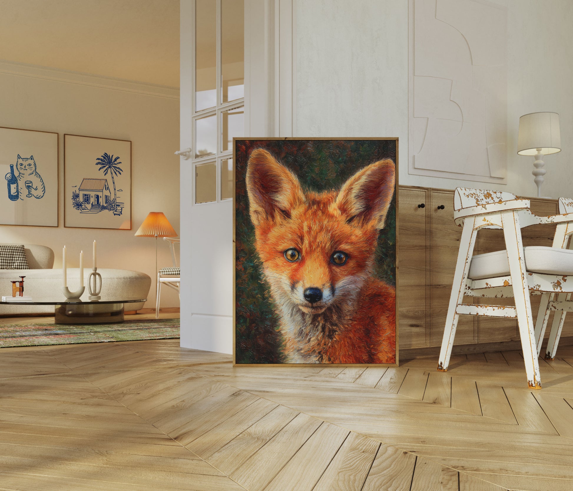 Dit prachtige olieverfschilderij van een vos vangt de essentie van bosachtige schoonheid met zijn doordringende gouden ogen en levendig roodoranje bont. Het ingewikkelde penseelwerk brengt de intelligente uitdrukking van de vos tot leven, terwijl warme goudtonen naadloos overgaan in diepere roden en zwarten. Tegen een sombere bosachtergrond stelt deze Roodvos-portret je in contact met een moment van rustige verbinding met de natuur, waardoor het een boeiende toevoeging is aan elke ruimte die natuur en artistieke excellentie viert.