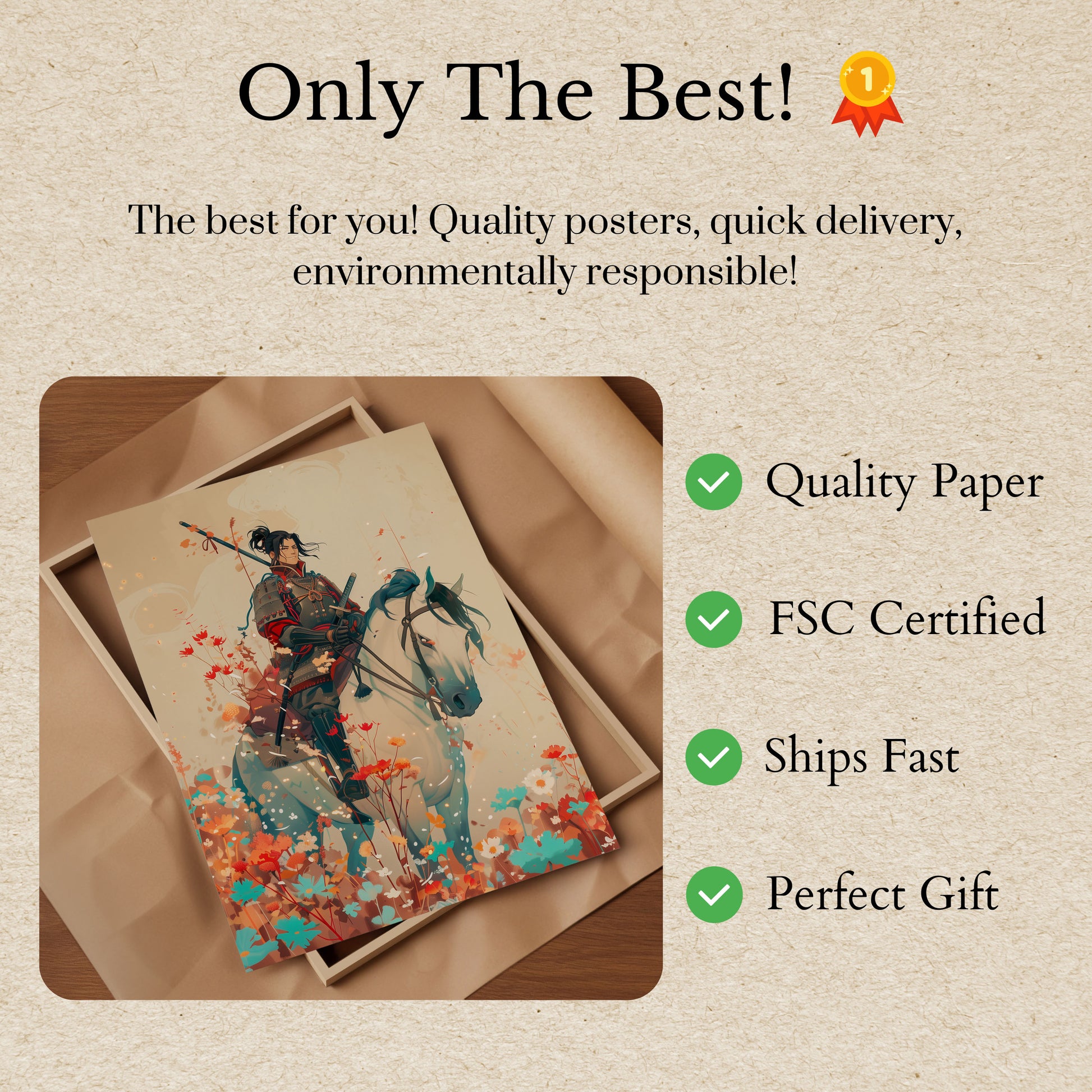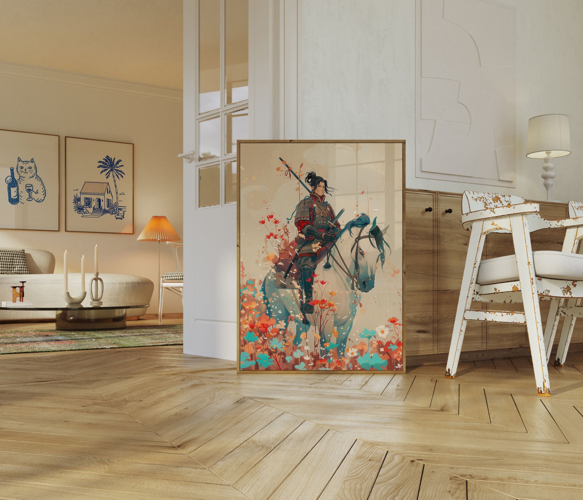 Stap binnen in een adembenemende wereld waar traditionele Japanse samoerai-kunst samensmelt met weelderige botanische schoonheid. Deze verbluffende poster vangt een edele krijger op een paard, gehuld in geïntreerde wapenrusting, omringd door een betoverende landschap van rode, groenblauw en oranje bloemen. De subtiele balans tussen de kracht van de krijger en de zachte, etherische bloemrijke omgeving creëert een boeiend visueel verhaal dat de kijker meeneemt naar een droomachtig moment van rust en kracht.