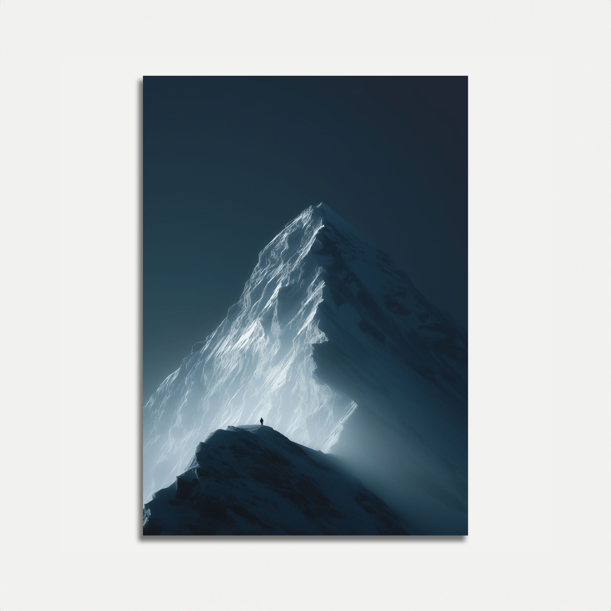 Een adembenemend berglandschap vangt de essentie van menselijke vastberadenheid, met een klein silhouet dat triomfantelijk staat op een rotsachtige uitsprong tegen een torenhoge, majestueuze sneeuwwitte piek. Het beeld is gedrenkt in etherische blauw-grijze tinten, waardoor een gevoel van sublieme isolatie en diepe natuurlijke schoonheid ontstaat. Mist en licht kaderen de berg op dramatische wijze en benadrukken het scherpe contrast tussen menselijke schaal en de immensiteit van de natuur.