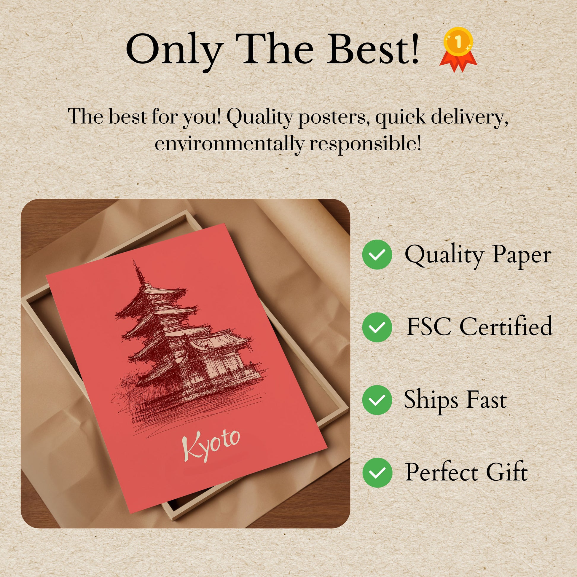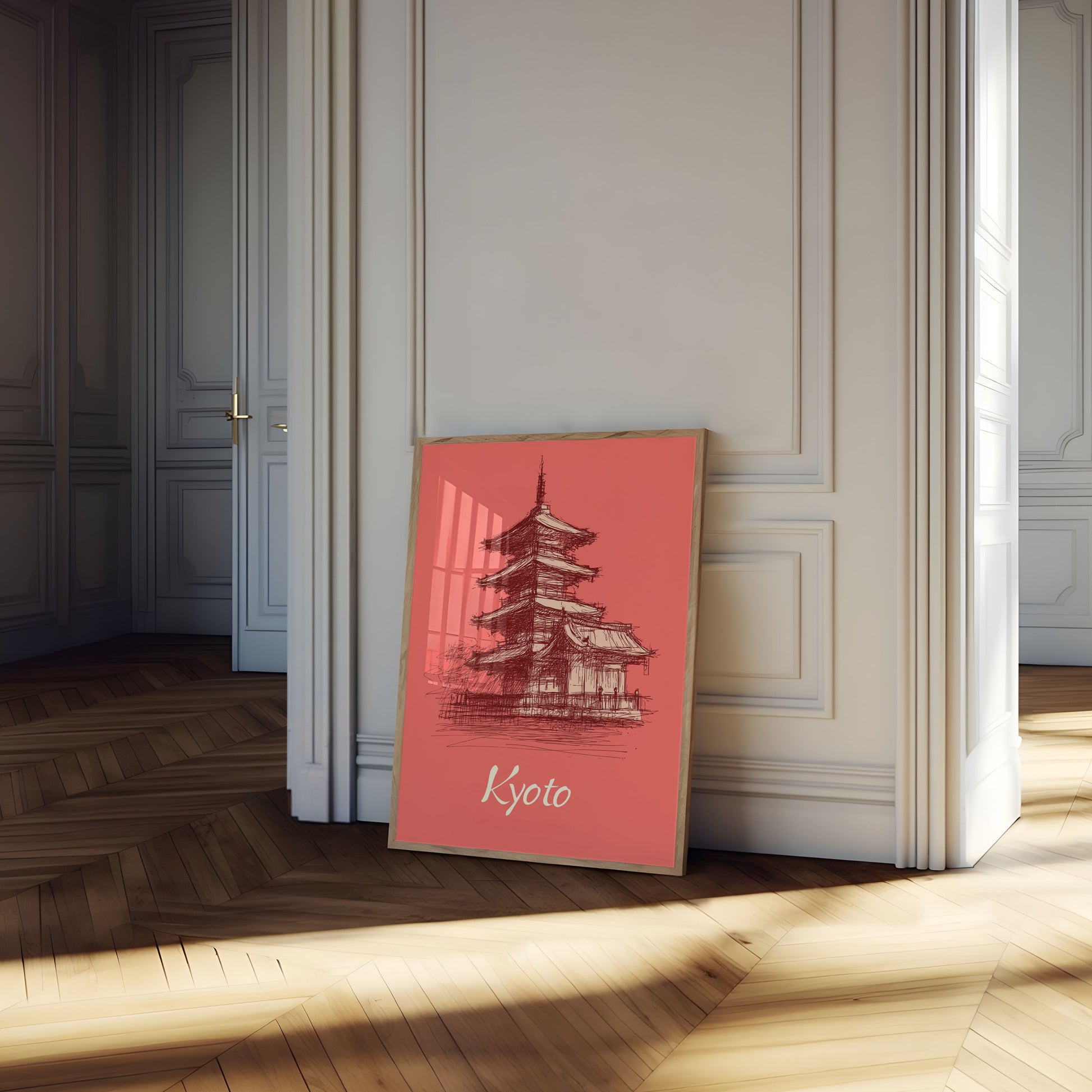 Dompel je onder in de elegante eenvoud van de traditionele Japanse architectuur met deze adembenemende handgetekende schets van een tempel in Kyoto. De delicate, dynamische lijnen vangen de tijdloze schoonheid van een meerlaagse pagode tegen een warme koraalkleurige achtergrond, en roepen de serene geest op van Japan's historische culturele hoofdstad. Elke streek vertelt een verhaal van architecturale verfijning en historische diepgang, waardoor deze poster een boeiend stuk artistieke vertelling wordt.