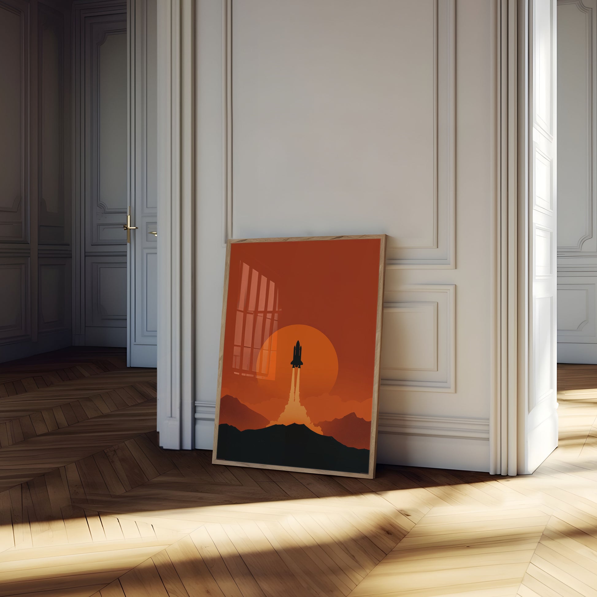 Et fantastisk minimalistisk plakat som fanger en romferges oppstigning mot en dramatisk oransje og rød solnedgang. Det silhuetterte romfartøyet stiger majestetisk opp fra et fjelllandskap, og skaper et kraftig bilde av menneskelig utforskning og teknologisk prestasjon. Rike, varme farger vekker en følelse av eventyr og ubegrensede muligheter.