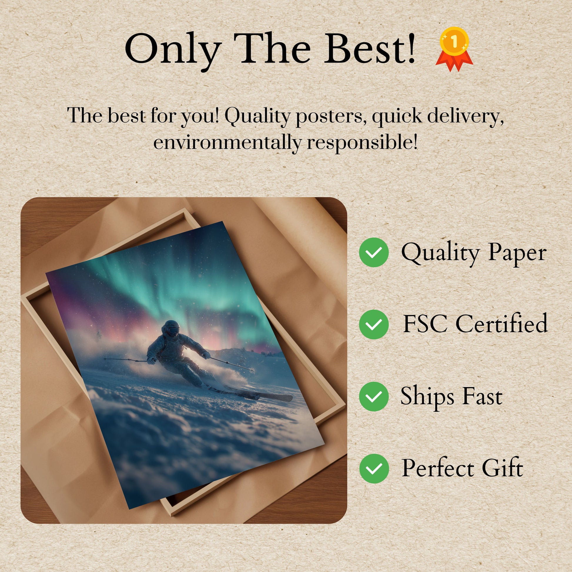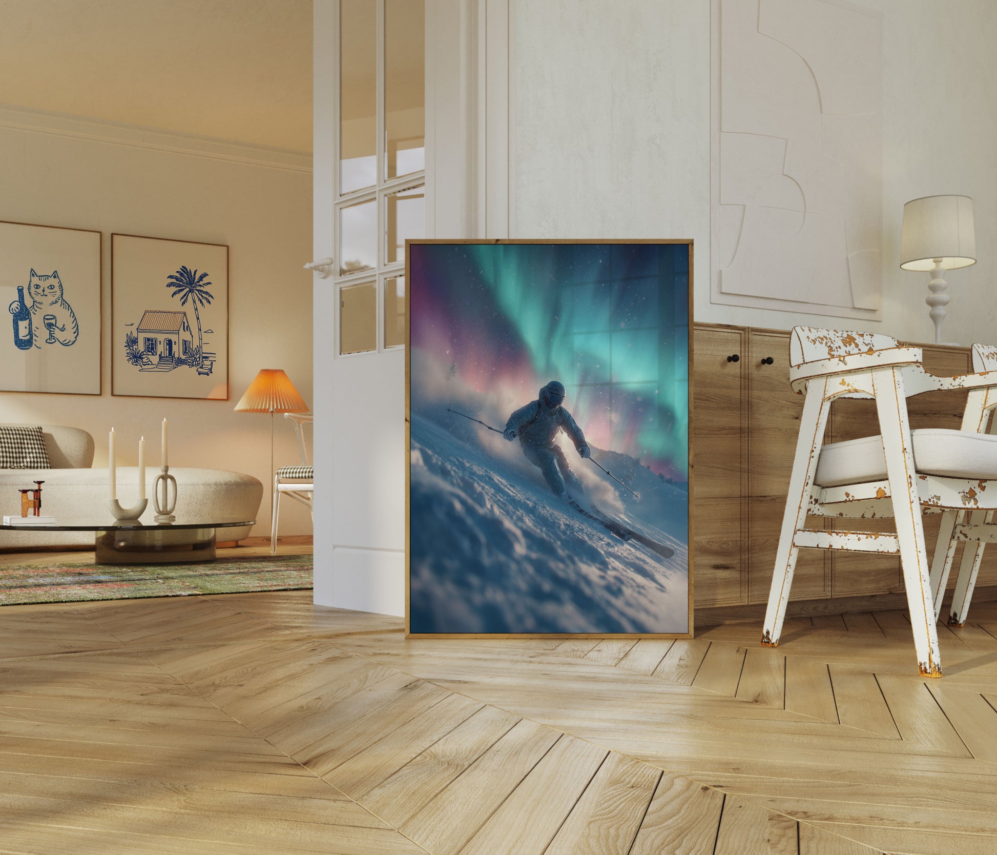 Opplev magien i alpinabventyr med dette fantastiske kunstverket om vintersport. En dyktig skiløper karvser ned en snødekt fjellskråning under en henrivende framvisning av nordlys, hvor levende turkis og myke rosa lys danser over nattehimmelen. Bildet fanger den perfekte blandingen av aksjon og undring—den dynamiske energien fra skiløping kombinert med den rolige, overnaturlige skjønnheten av nordlyset som skaper en atmosfære som er både oppstemtende og fredelig. Denne fantastiske kompositionen feirer spenningen ved vinterfjellklatring og de imponerende naturlige fenomenene som gjør polarregionene så uforglemmelige.