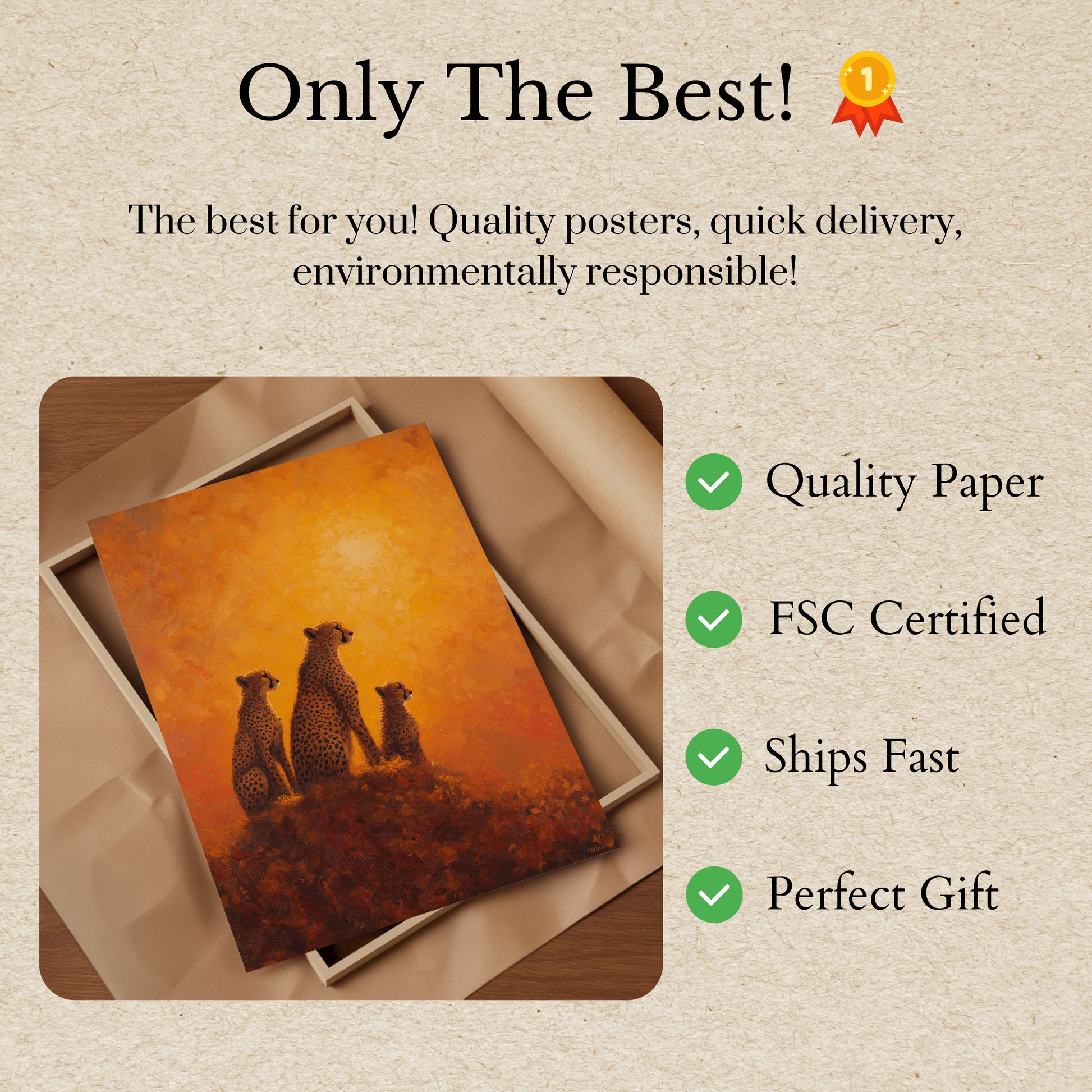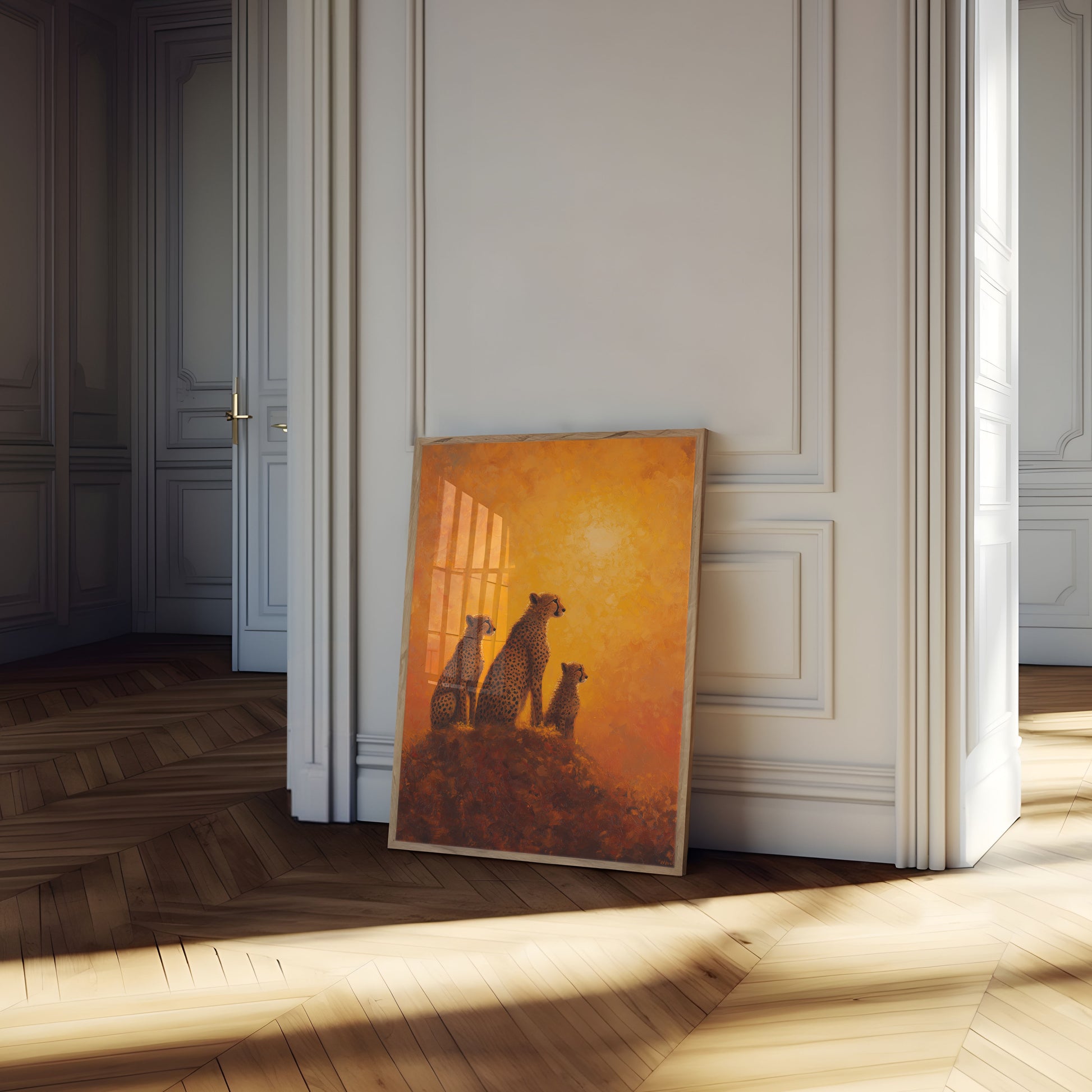 Se tre prægtige geparden står vågne mod en betagende gylden savannsolnedgang. Dette fantastiske kunstværk fanger essensen af afrikansk dyreliv med varme, glødende orange og rav-toner, der skaber en virkelig magisk atmosfære. Kompositionen balancerer perfekt den kraftfulde tilstedeværelse af disse plettet rovdyr med det rolige skøn i deres naturlige habitat, hvilket vækker en følelse af undren og respekt for naturens mest elegante jægere.