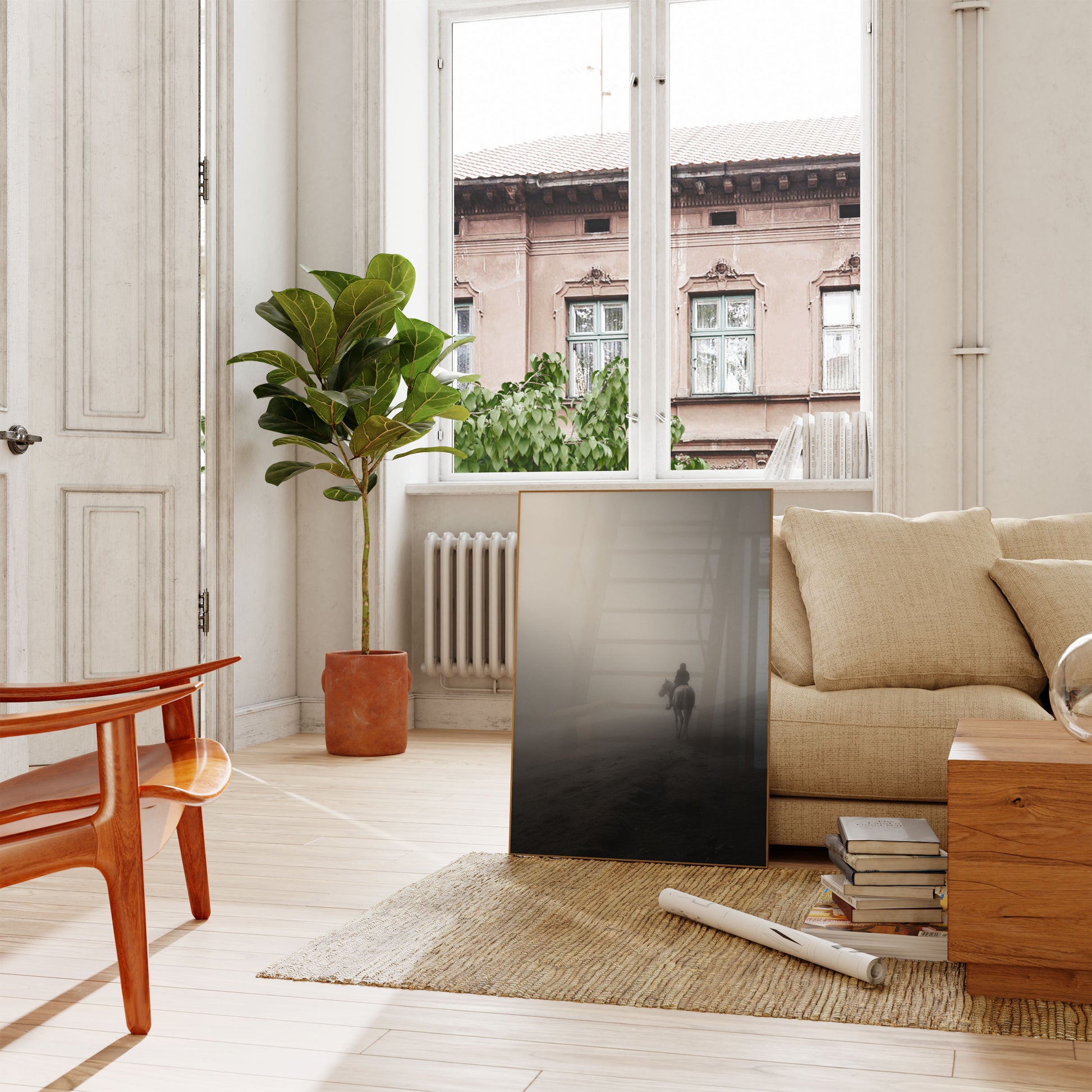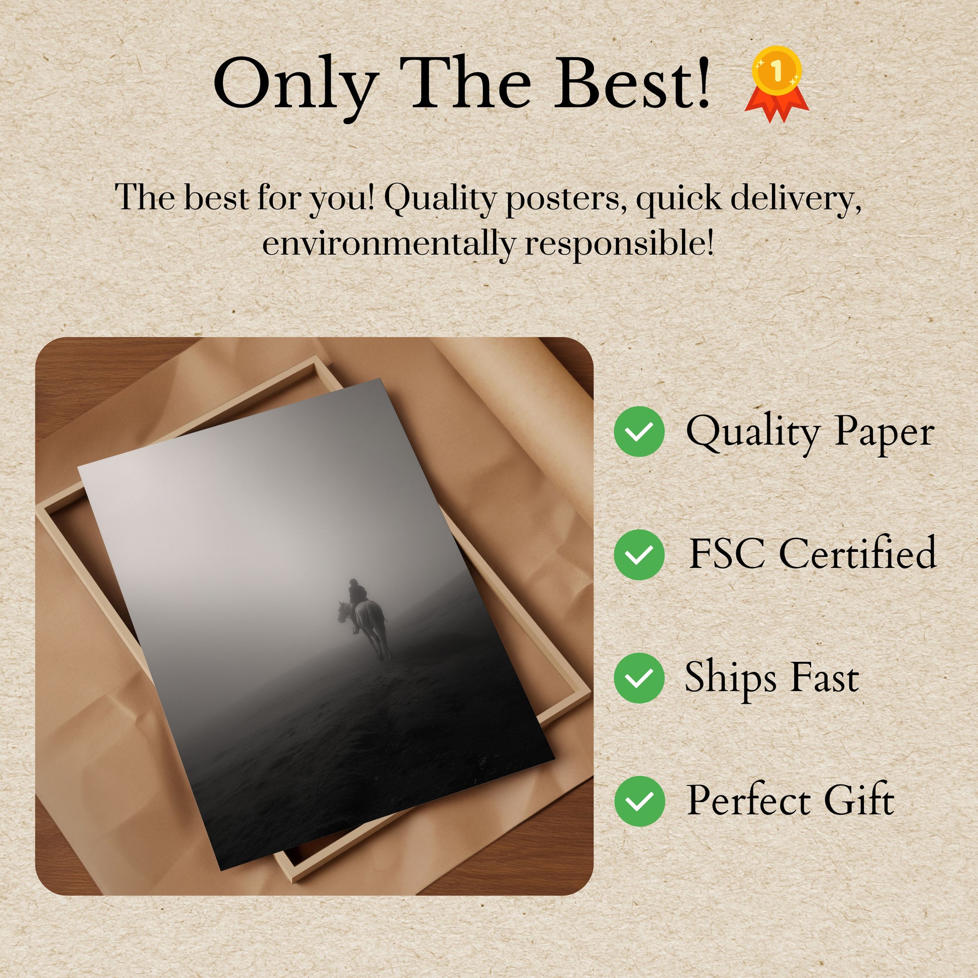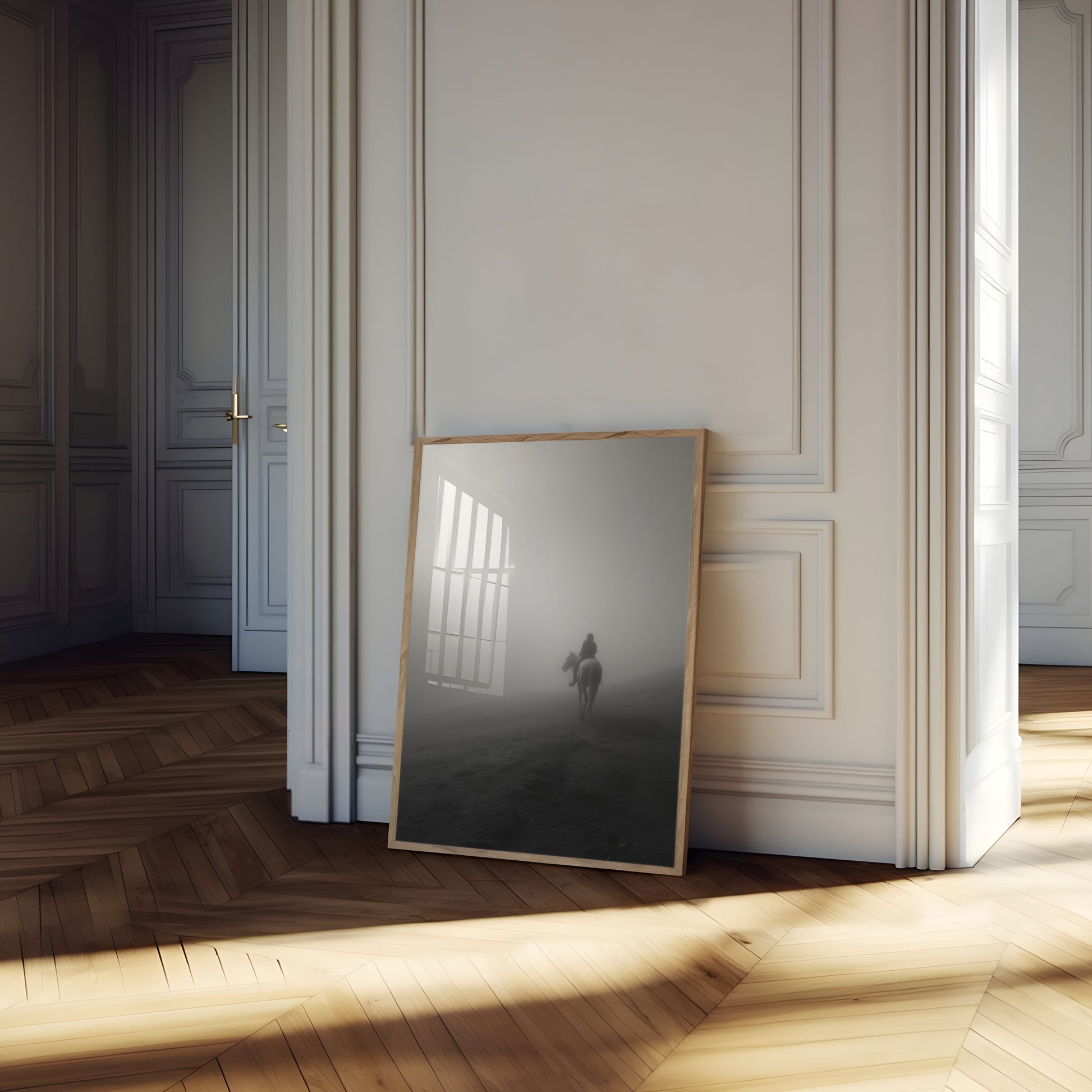 Dette uforglemmelige svart-hvitt-fotografiet fanger en ensom rytter på hest som dukker opp fra tett tåke, og skaper en atmosfære av mysterium og kontemplasjon. Den minimalistiske komposisjonen understreker rytterens reise gjennom et uklart landskap, der tåken forvandler scenen til noe drømmende og eterisk. Gråtonepaletten og de atmosfæriske forholdene fremkaller en følelse av ensomhet, eventyr og den stille skjønnheten i naturens mest unnvikende øyeblikk, perfekt for de som setter pris på mørk, introspektiv veggkunst.
