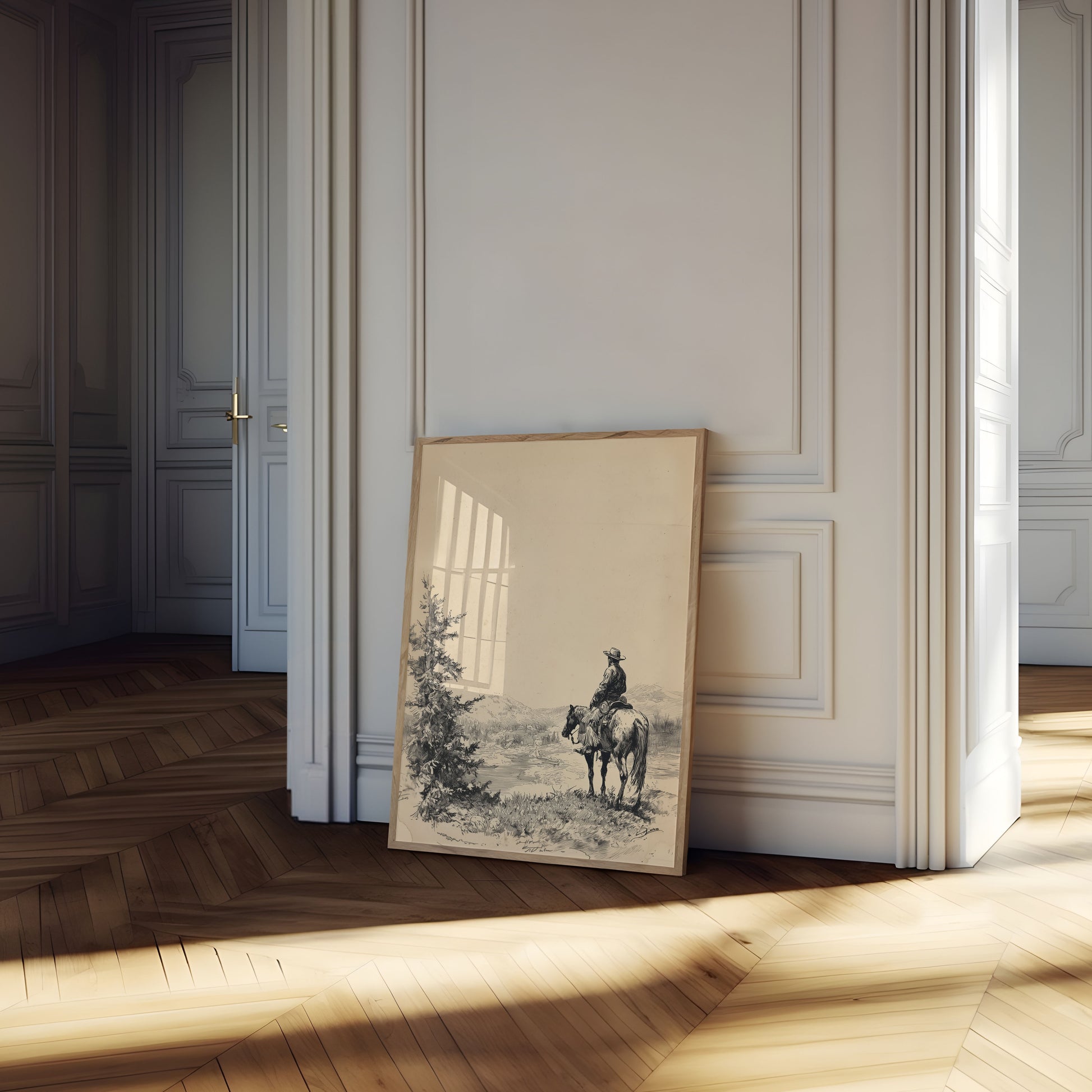 Et rolig svart-hvitt skisse fanger en enslig rytter til hest, som stirrer utover et fredelig fjølandskap. Den detaljerte illustrasjonen fremkaller den stille motstandsdyktigheten til den gamle vesten, med et værbitt tre i forgrunnen som rammer inn en storslått utsikt over fjerne åser og åpent terreng.