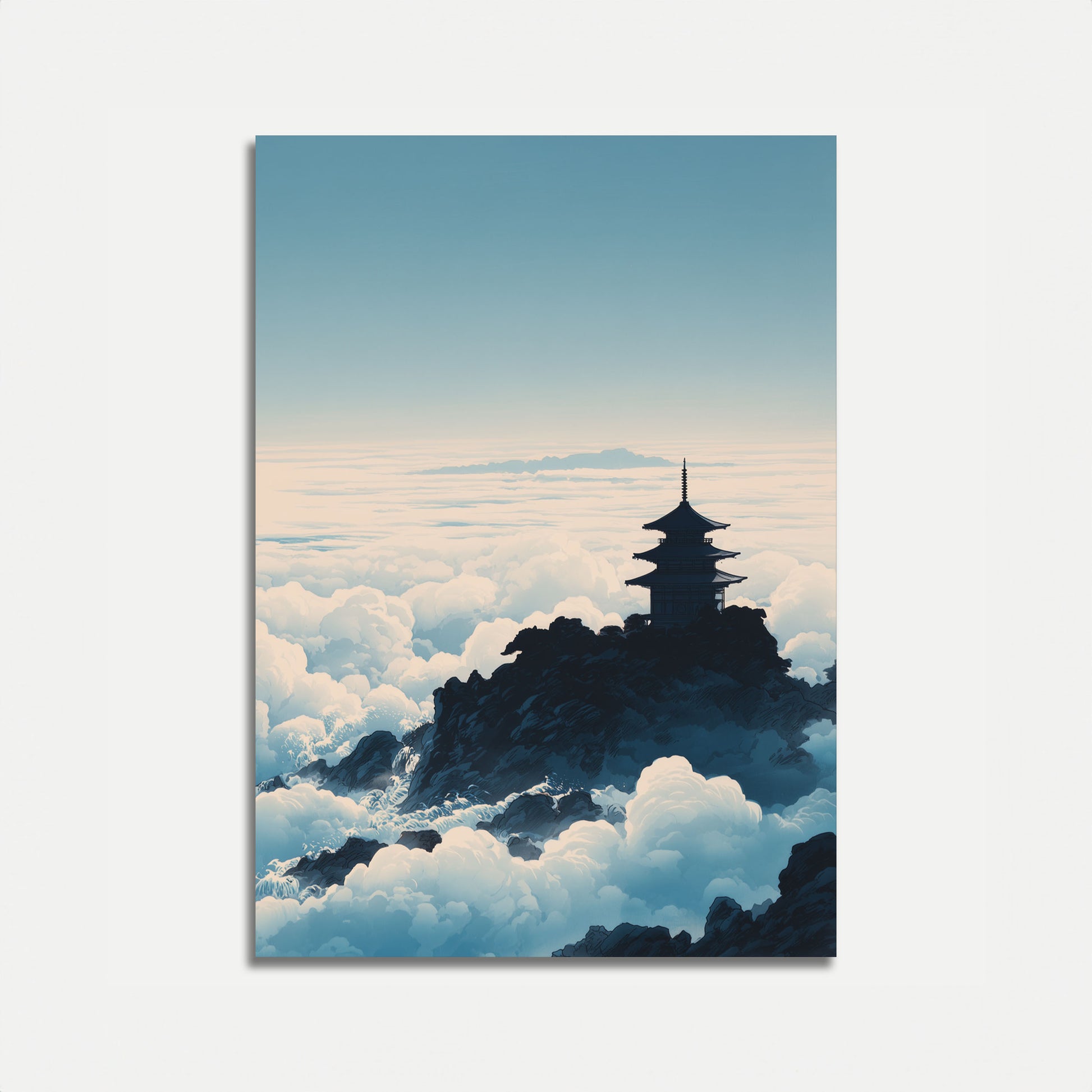 Dette pustetar kunstverk fanger en rolig pagode perkt på toppen av et tåkelagt fjell, som stiger majestetisk over et endeløst hav av myke hvite skyer. Komposisjonen blander tradisjonell asiatisk arkitektur med et drømmektig landskap, og skaper en følelse av åndelig ro og undring. Med sine beroligende blåtoner, delikate skyformasjoner og den slående silhuetten av det gamle tempelet, framkaller denne plakaten en følelse av fred, kontemplasjon og forbindelse til naturens storhet.