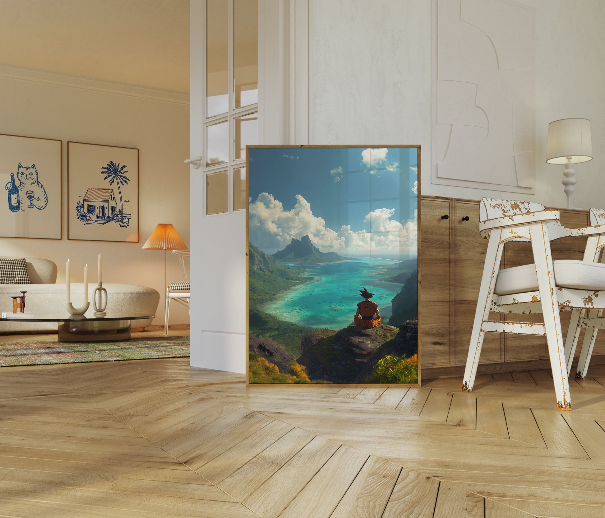 Oppdag et rolig øyeblikk av fred i dette storslagne landskapet med en mediterende figur som ser utover en fantastisk tropisk bukt. Levende turkise vann kontrasterer mot frodig grønne fjell og dramatiske skydannelser, som skaper en følelse av ro og undring. Bildet fanger et øyeblikk av fullkommen zen, og inviterer betrakterne til å stoppe opp og reflektere over naturens skjønnhet.