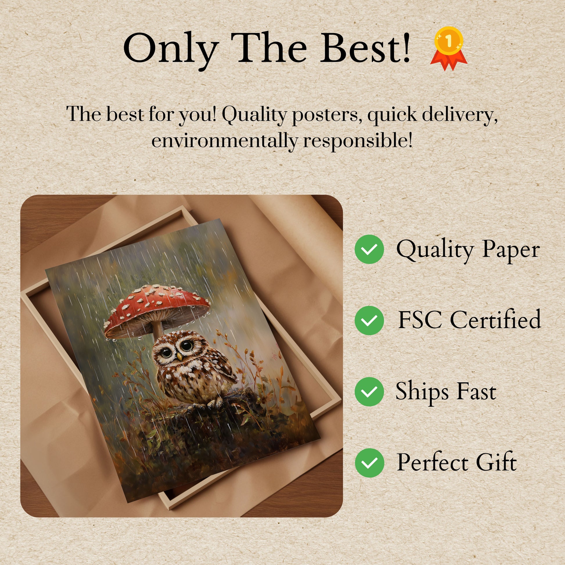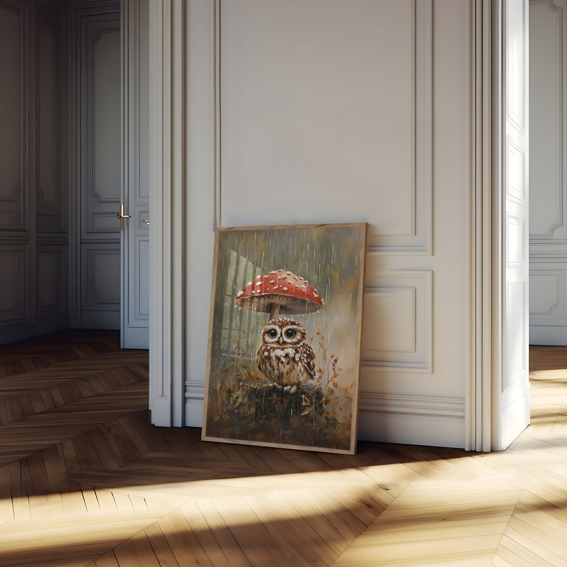 Et sjarmerende skogslandskap fanger en søt ugle som søker ly under en livlig rød-og-hvit prikket sopp under en mild regn. Myke, dempede toner og forsiktige regnduråper skaper en rolig og magisk atmosfære, som fremhever de detaljerte fjærene til uglen og den skinnende sopphatten. Maleriet vekker en følelse av fredelig naturskjønnhet og eventyrlig skogsfortryllelse.