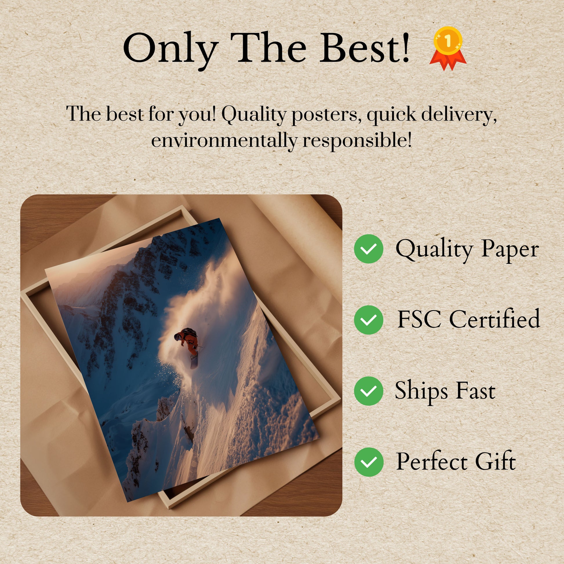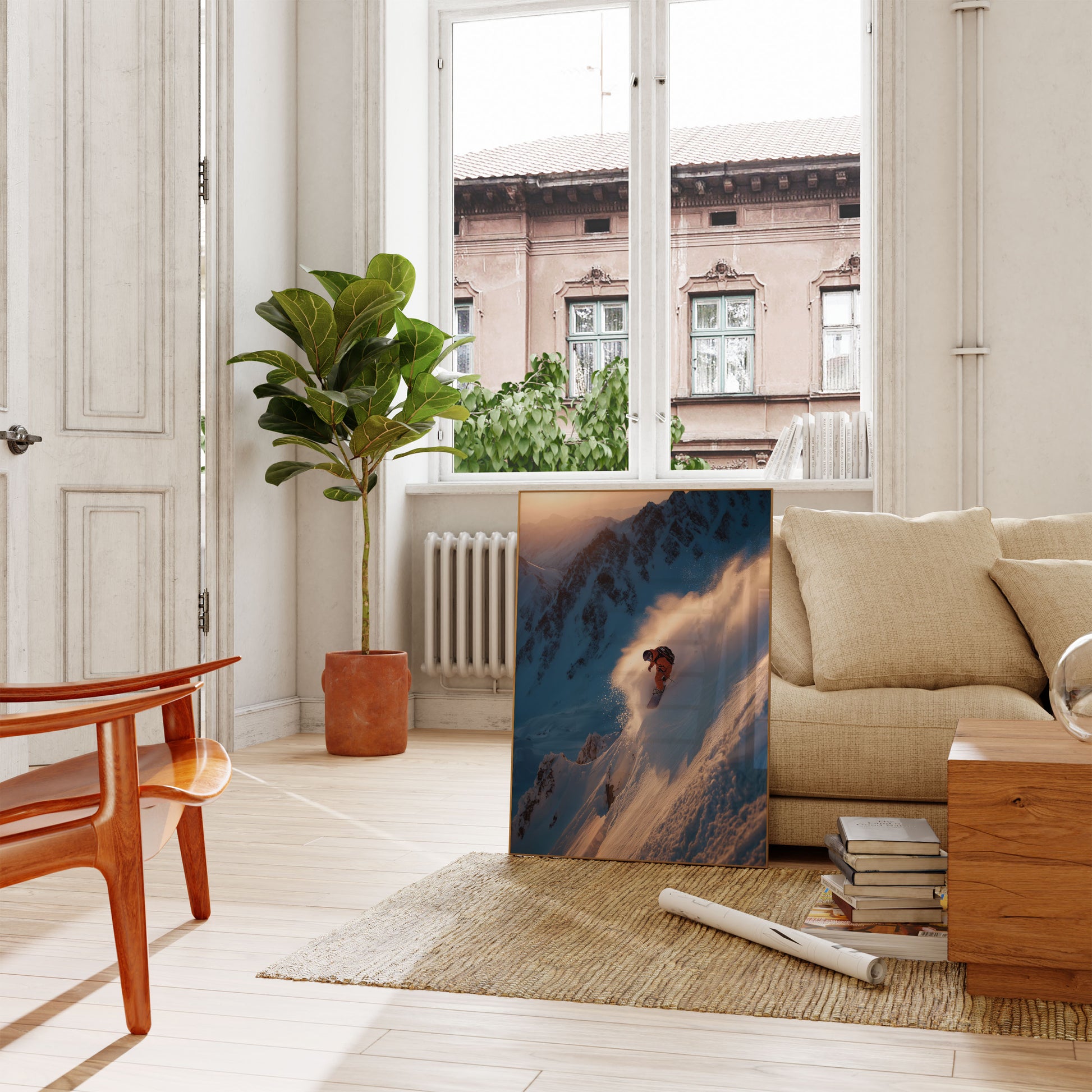 Føl adrenalinkicken med denne fantastiske skiaksjonsplakaten som fanger en ensom skiløper som skjærer gjennom fersk snø på en dramatisk alpin bakke. Gulltimelyset bader de snøkledde toppene i varme bernsteinfarger mens kule blå skygger skaper fantastisk kontrast, og fanger perfekt spenningen og skjønnheten ved backcountry-skiing. Med snøsprøyt som glitrer i sollyset og ikoniske snøkledde fjell som innrammer scenen, personifiserer dette bildet friheten, ferdighetene og den rene glleden ved vintersport på sitt beste. Den dynamiske komposisjonen og den pusteløse fjelllandskapen gjør dette til et inspirerende kunstverk for eventyrelsker og vinteridrettsentusiaster.