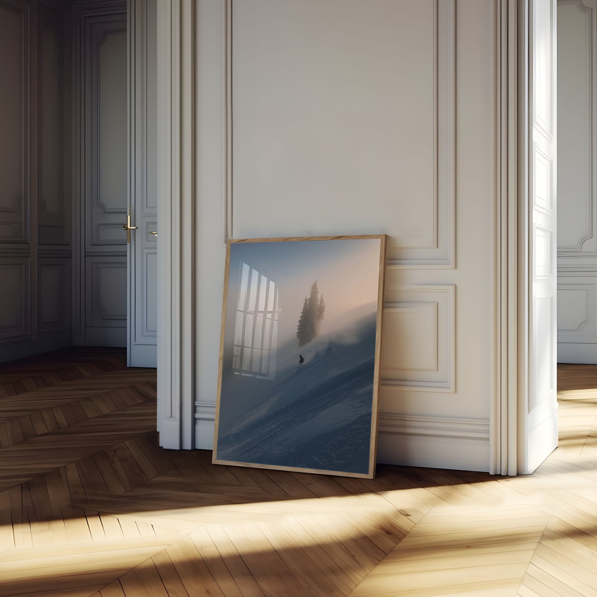 Denne fantastiske fjellscenen fanger en enslig skiløper som går ned en uberørt snøfylt skråning, omgitt av tåkete topper og høye furutrær. Den myke, eteriske tåken skaper en drømmende atmosfære, som blander varm gullhvitt lys med kjølige blå skygger over vinterlandskapet. Komposisjonen formidler perfekt ensomheten, eventyrlystene og den fredelige skjønnheten ved høyfjellsskiing, og fremkaller følelser av frihet og rolig isolasjon i naturens storhet.