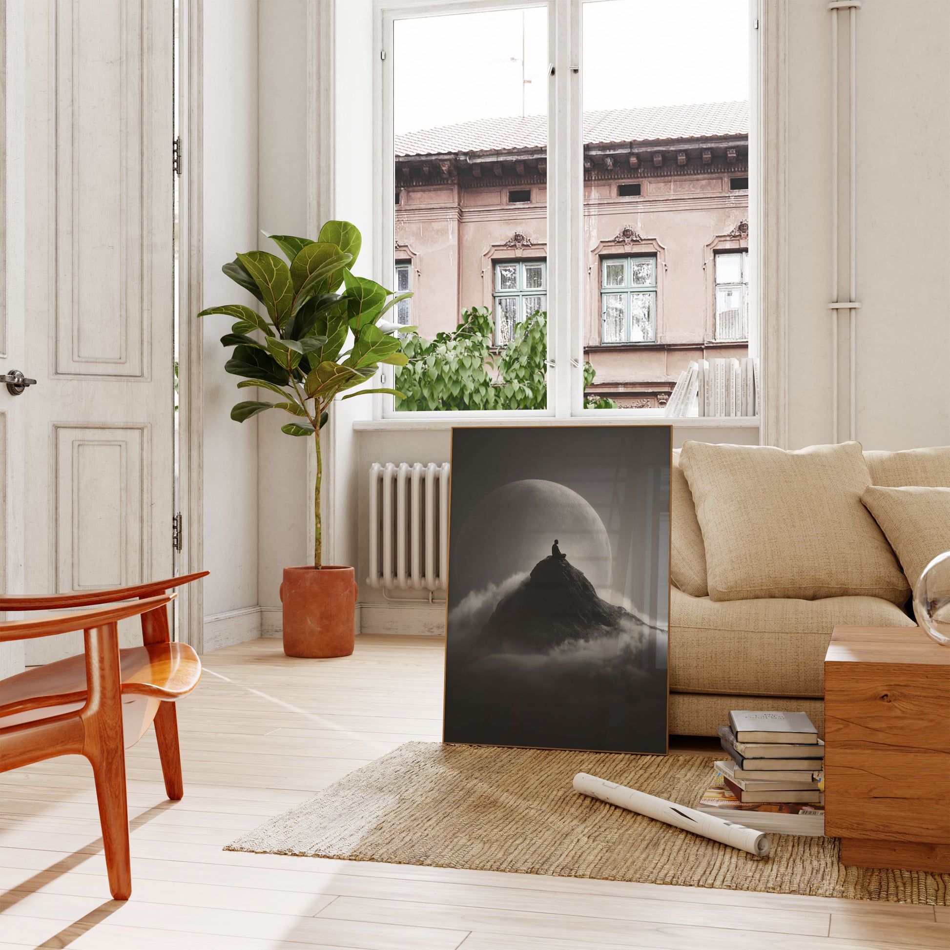 Et rolig svart-hvitt bilde fanger en silhuettfigur som sitter på toppen av en majestetisk fjelltopp, med en gigantisk måne som dominerer bakgrunnen. Skyer hvirvler rundt den bergete fjelltoppen og skaper en drømmeaktig atmosfære av fredelig ettertanke og isolasjon. Den minimalistiske komposisjonen fremkaller en følelse av indre ro og forbindelse med naturen.