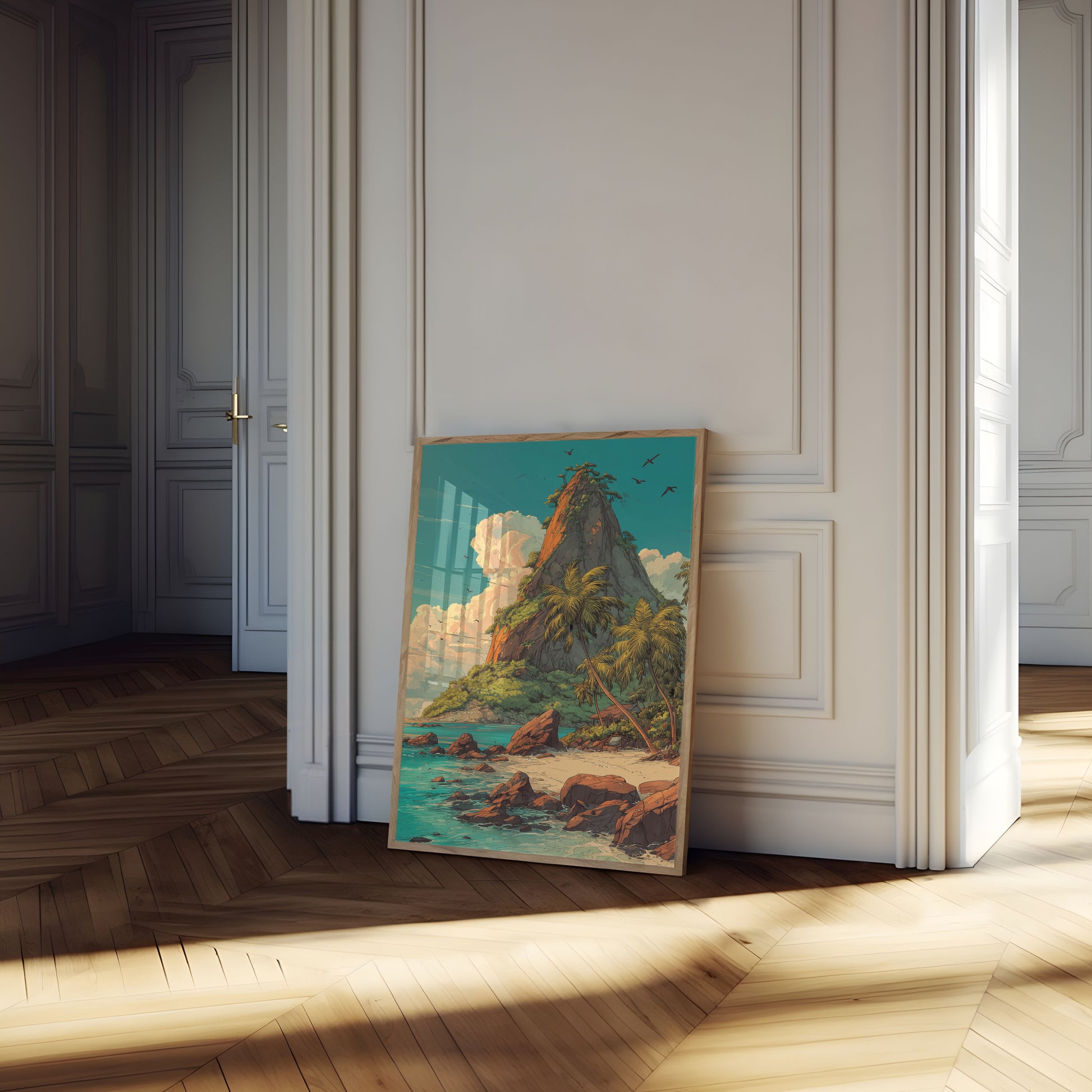Dette fantastiske kunstverket fanger essensen av et uberørt tropisk paradis, med et dramatisk vulkanfjell som reiser seg majestisk fra turkise vann. Den varme fargepaletten har rike oransje og røde nyanser i klippene som kontrasterer vakkert mot den kjølige blågrønne himmelen og det krystallklare havet. Palmetrær svaier mykt på den gylne sandstranden, mens fugler svever fritt over hodet, og skaper en atmosfære av rolig flukt og naturlig undring som transporterer deg rett til en idyllisk øyparadis.
