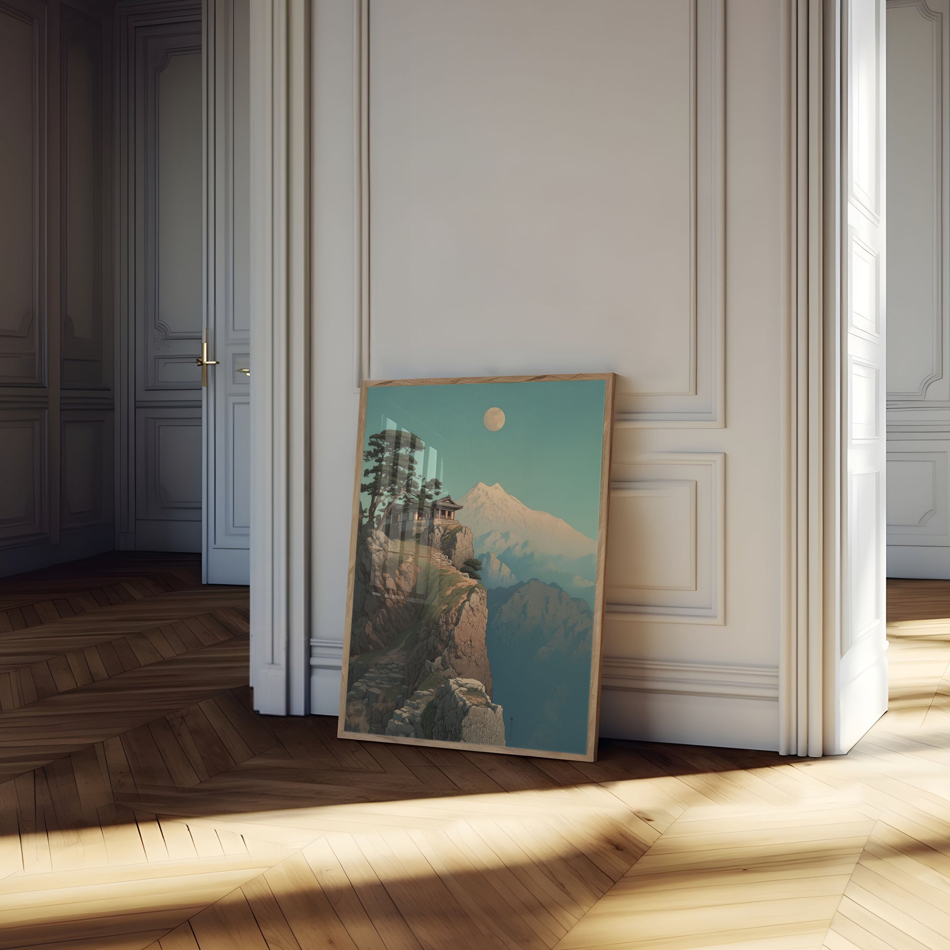Opplev den rolige freden ved en tradisjonell japansk fjelltemppel som hviler forsiktig på en steinete klippe. Den sarte arkitektoniske strukturen ligger inntil et gammelt furetre, og ser utover et tåkete fjordlandskap med en lysende fullmåne som kaster et mykt skjær over den etæriske scenen. Kjølige blågrønne og varme steinfarger skaper en fascinerende følelse av fredelig isolasjon.